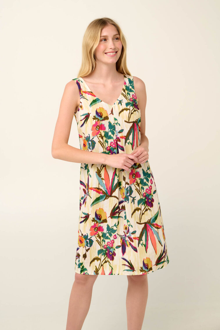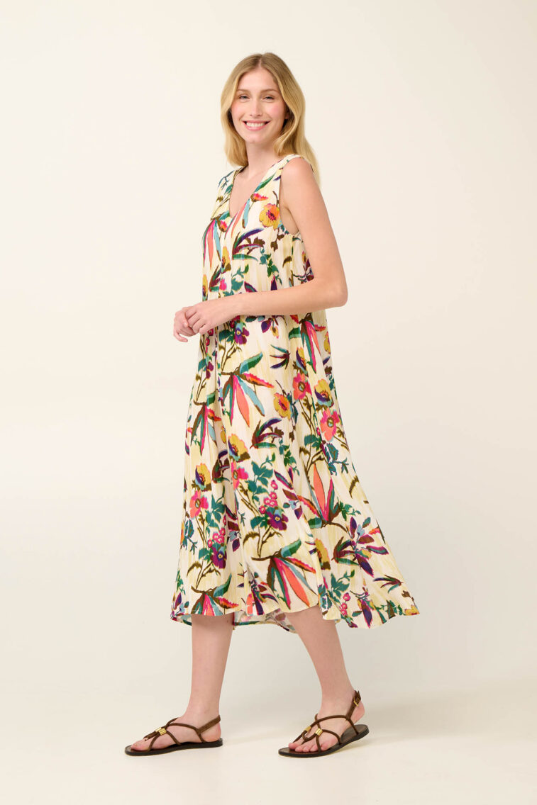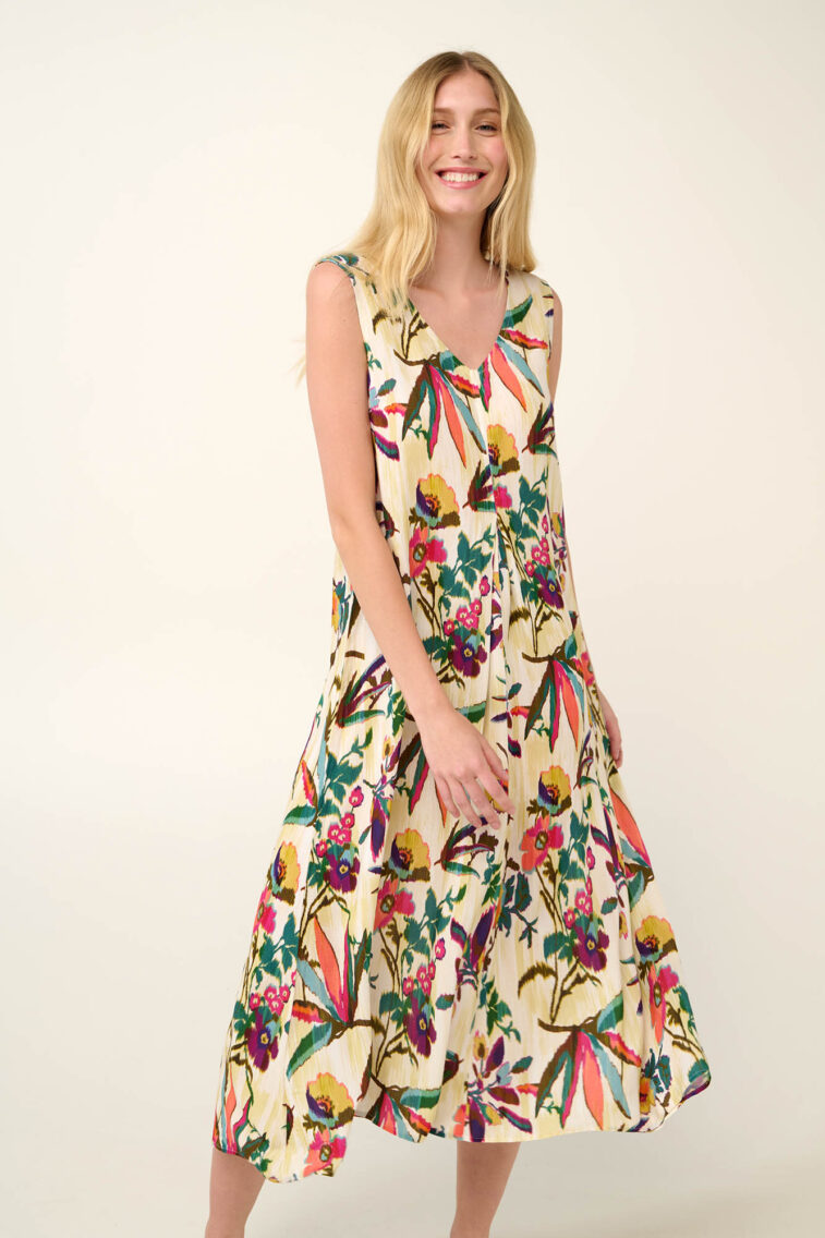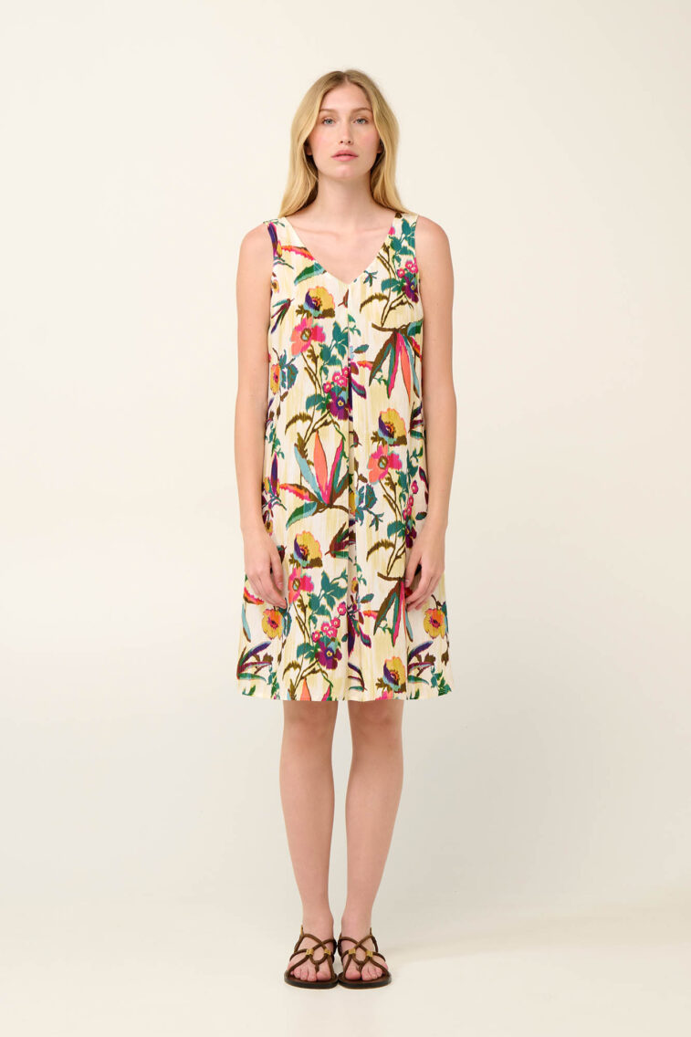 Vamp – Καλοκαιρινό Φόρεμα με Πιέτα σε Τροπικό Φλοράλ Μοτίβο