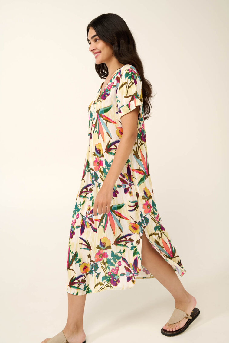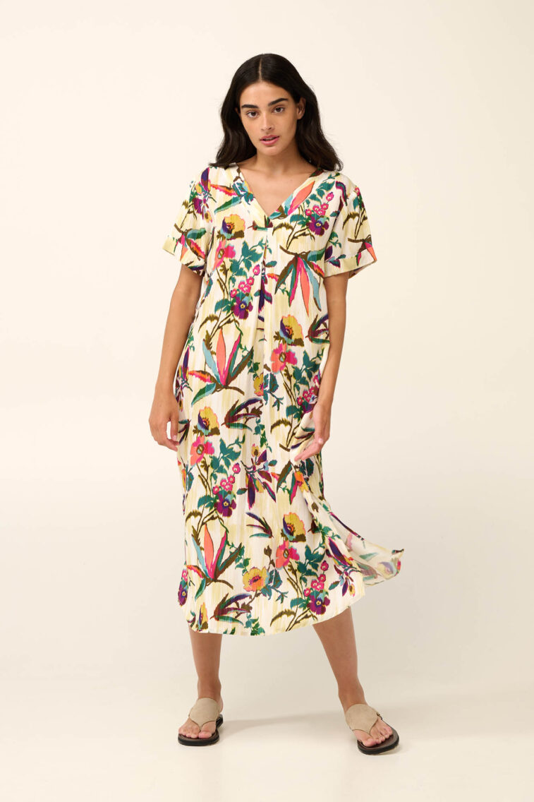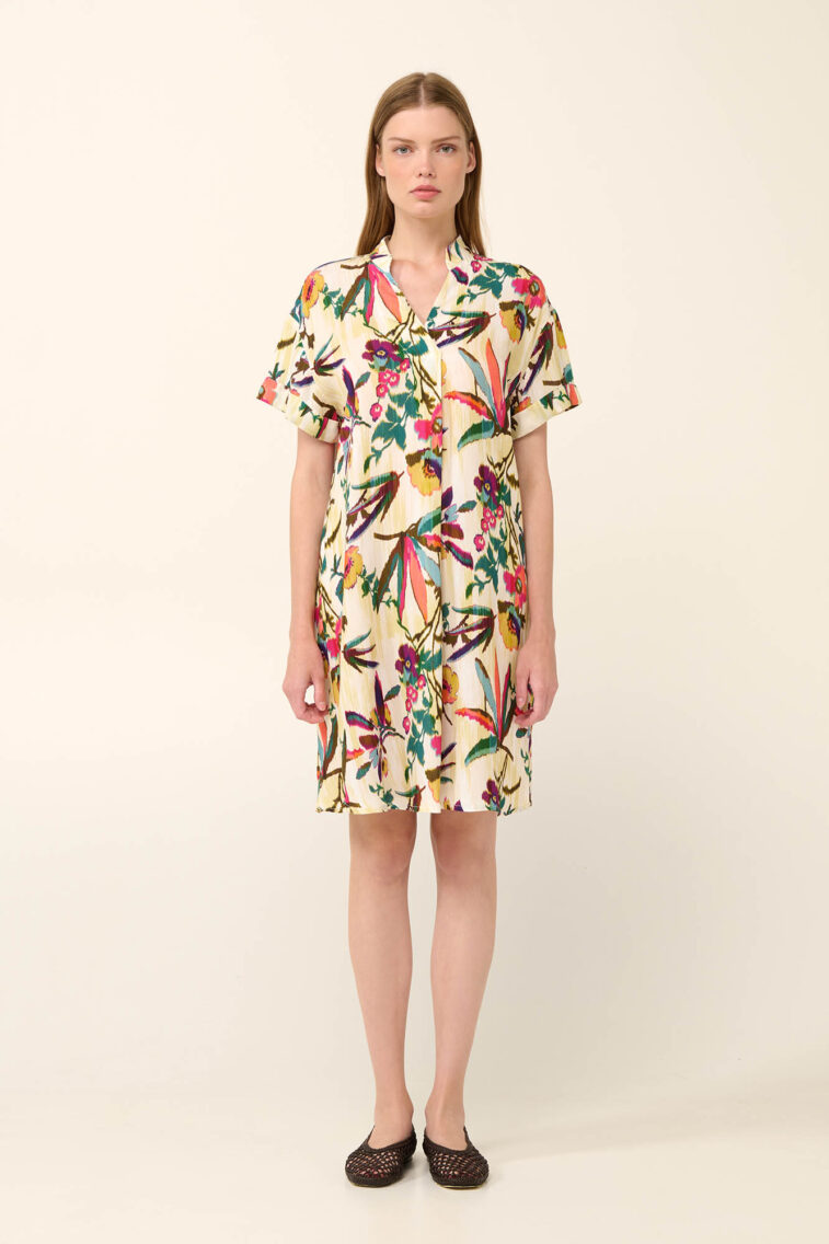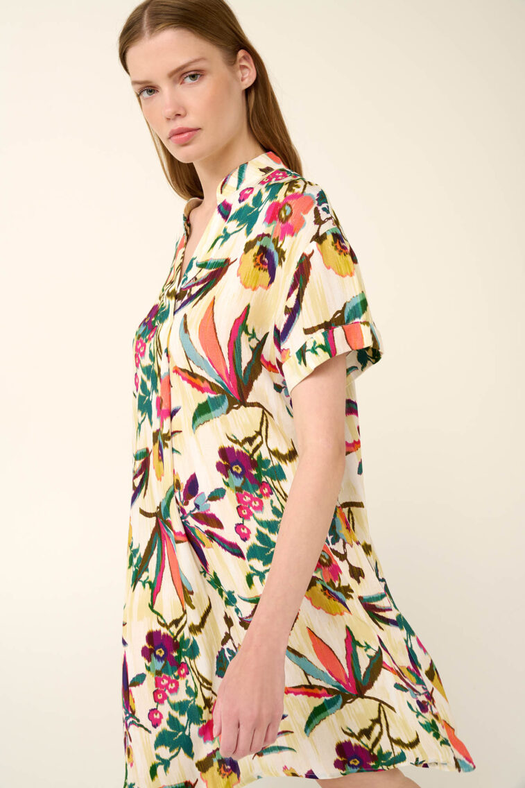 Vamp – Καλοκαιρινό Φόρεμα με Πιέτα σε Τροπικό Φλοράλ Μοτίβο
