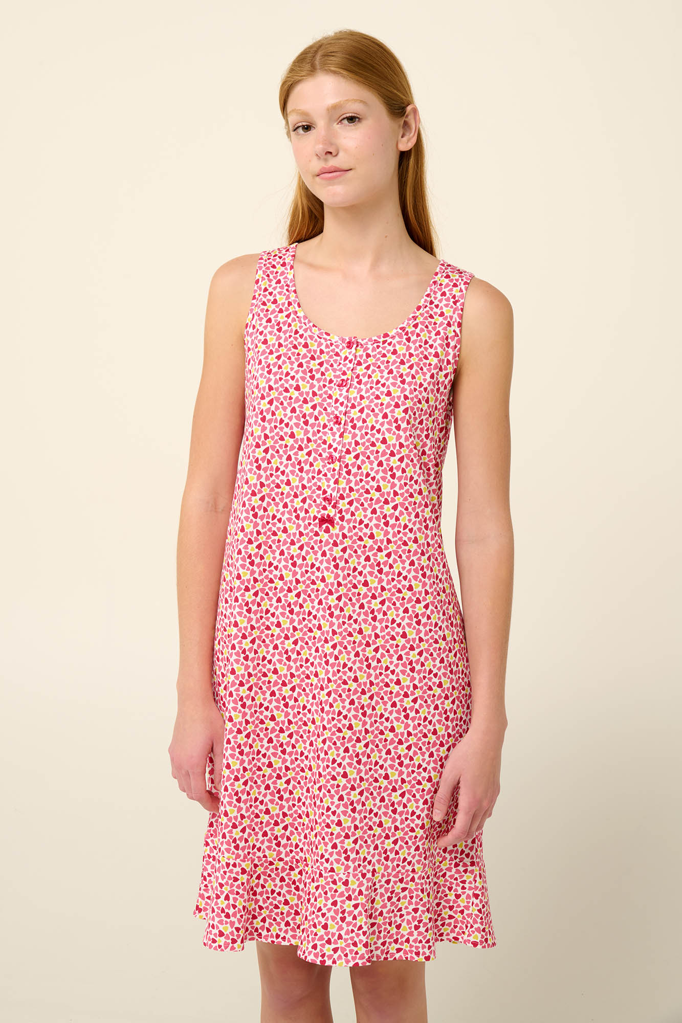 Προσθέστε στη γκαρνταρόμπα σας ένα αμάνικο καλοκαιρινό νυχτικό με γοητευτικό μωσαϊκό από καρδιές και πρακτική πατιλέτα στο στήθος που χαρίζει κομψότητα στην εμφάνιση σας. Είναι σχεδιασμένο σε κανονική γραμμή για άνετη εφαρμογή και ελευθερία κινήσεων. Κατασκευασμένο από 100% απαλό βαμβάκι single jersey που επιτρέπει στο δέρμα να αναπνέει είναι μια δροσερή πρόταση για τα ζεστά βράδια του καλοκαιριού.