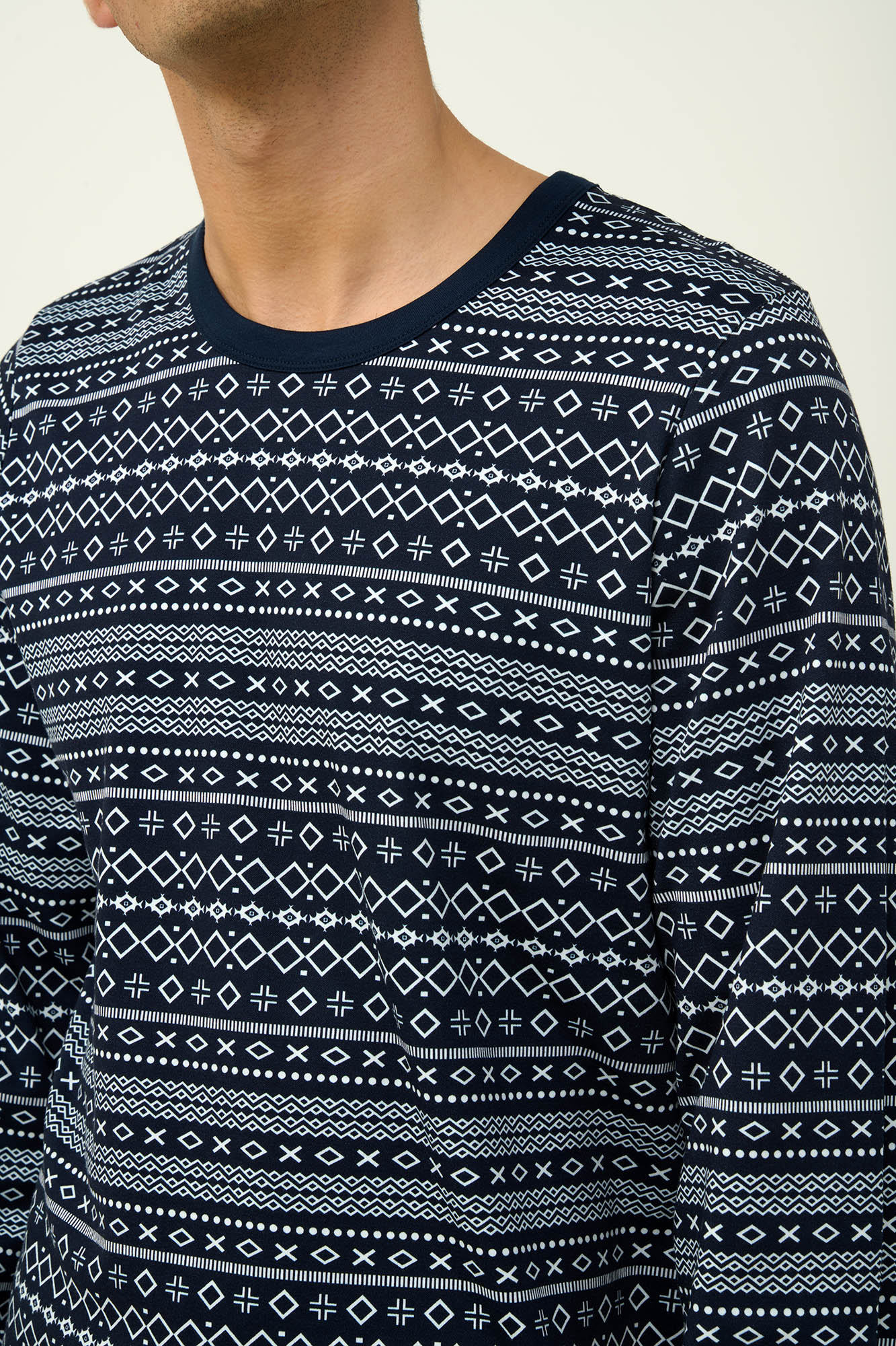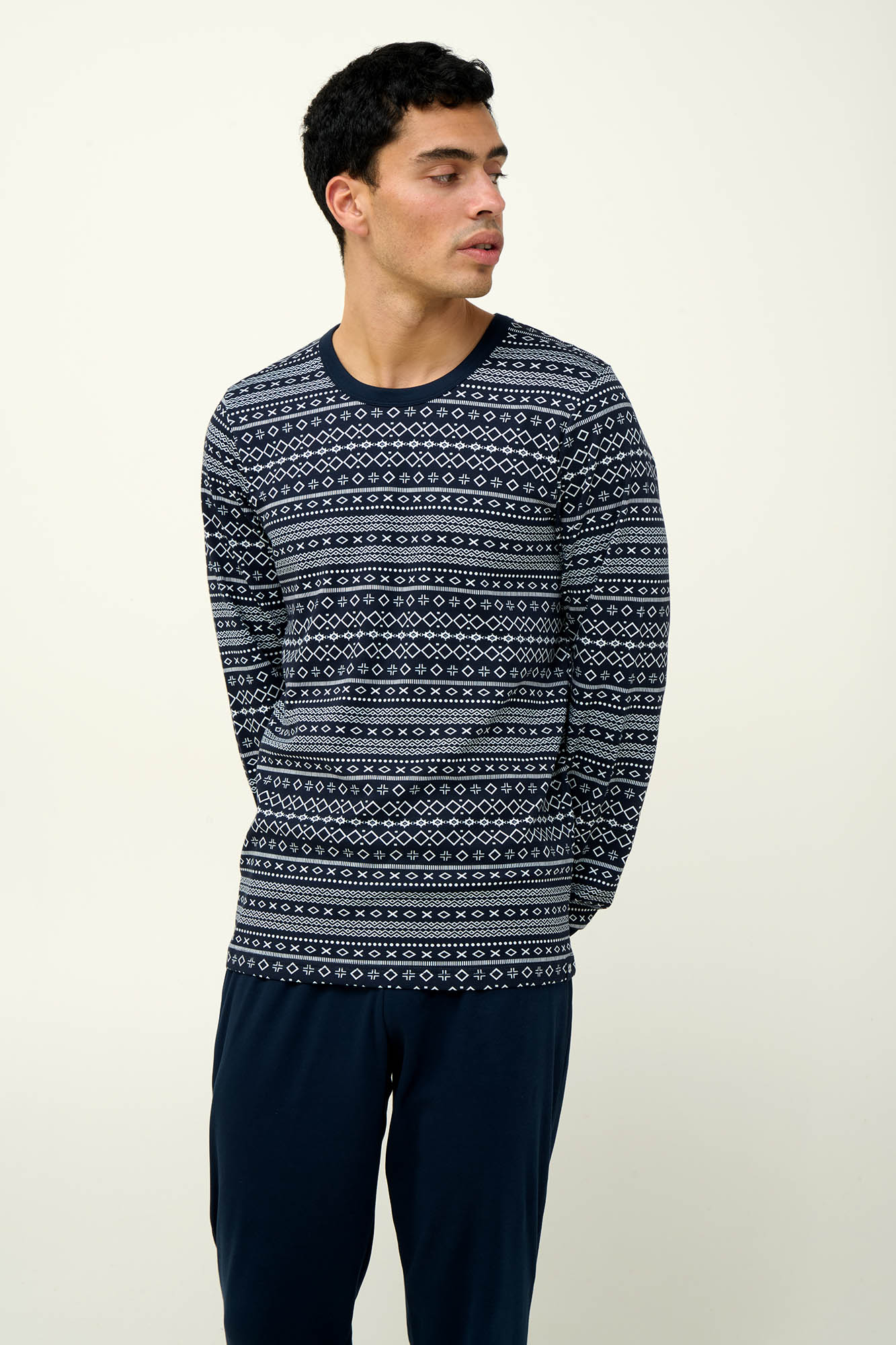 Ανακαλύψτε την απόλυτη άνεση με αυτό το χειμερινό σετ ανδρικές πυτζάμες, φτιαγμένο από 100% βαμβάκι interlock που προσφέρει απαλή και διαπνέουσα αίσθηση. Το πάνω μέρος με μανσέτες διαθέτει κομψό γεωμετρικό σχέδιο που θυμίζει σκανδιναβικό μοτίβο, προσθέτοντας μια διακριτική χειμερινή γοητεία. Συνδυάζεται με απλό παντελόνι επίσης με μανσέτες, ιδανικό για χαλάρωση ή ύπνο τους κρύους μήνες