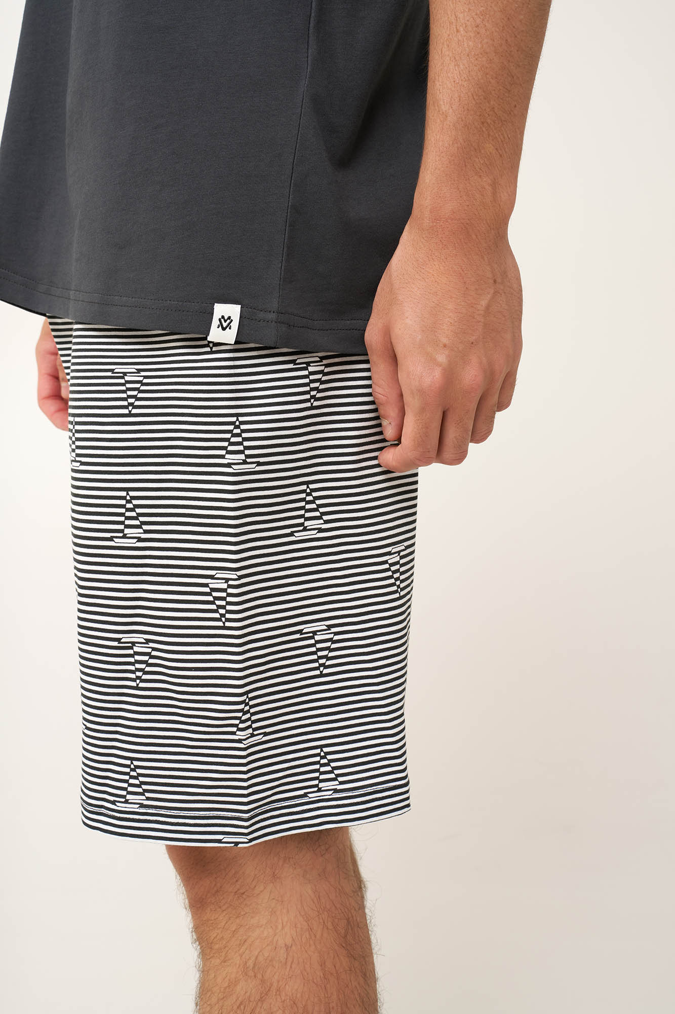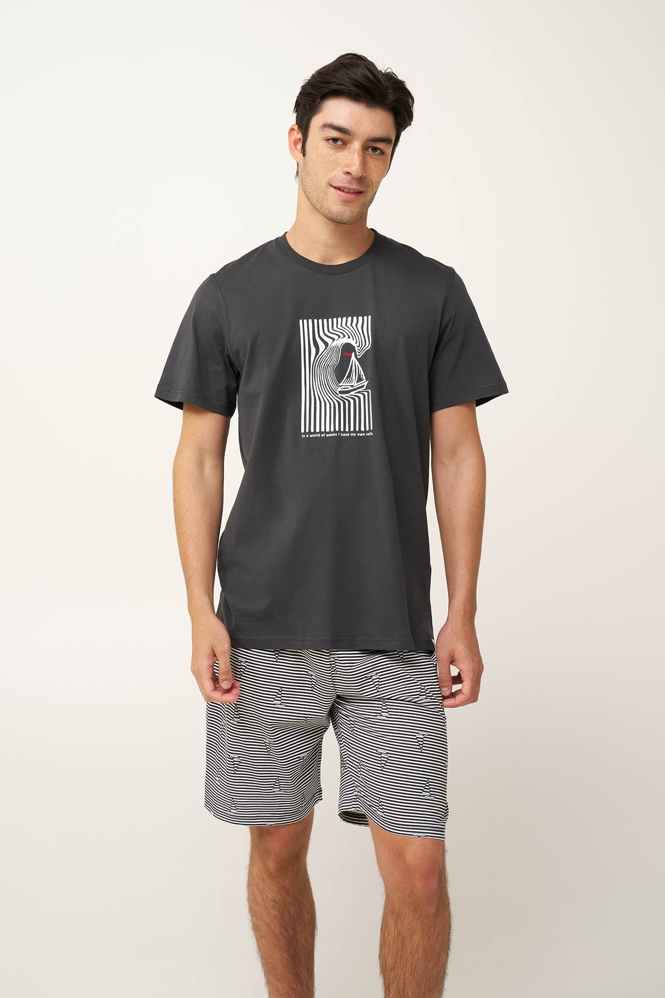 Προσθέστε στην γκαρνταρόμπα σας ένα σετ καλοκαιρινές ανδρικές πυτζάμες, κατασκευασμένο από 100% βαμβάκι single jersey. Η μπλούζα με στρογγυλή λαιμόκοψη έχει ένα δροσερό τύπωμα με βαρκούλα στο στήθος, ενώ κοντό παντελόνι έχει κλασικές ρίγες που διακόπτονται από μικρά καραβάκια. Απαλό και διαπνέον είναι ιδανικό για να απολαύσετε κάθε στιγμή της ημέρας στο σπίτι ή τις διακοπές.