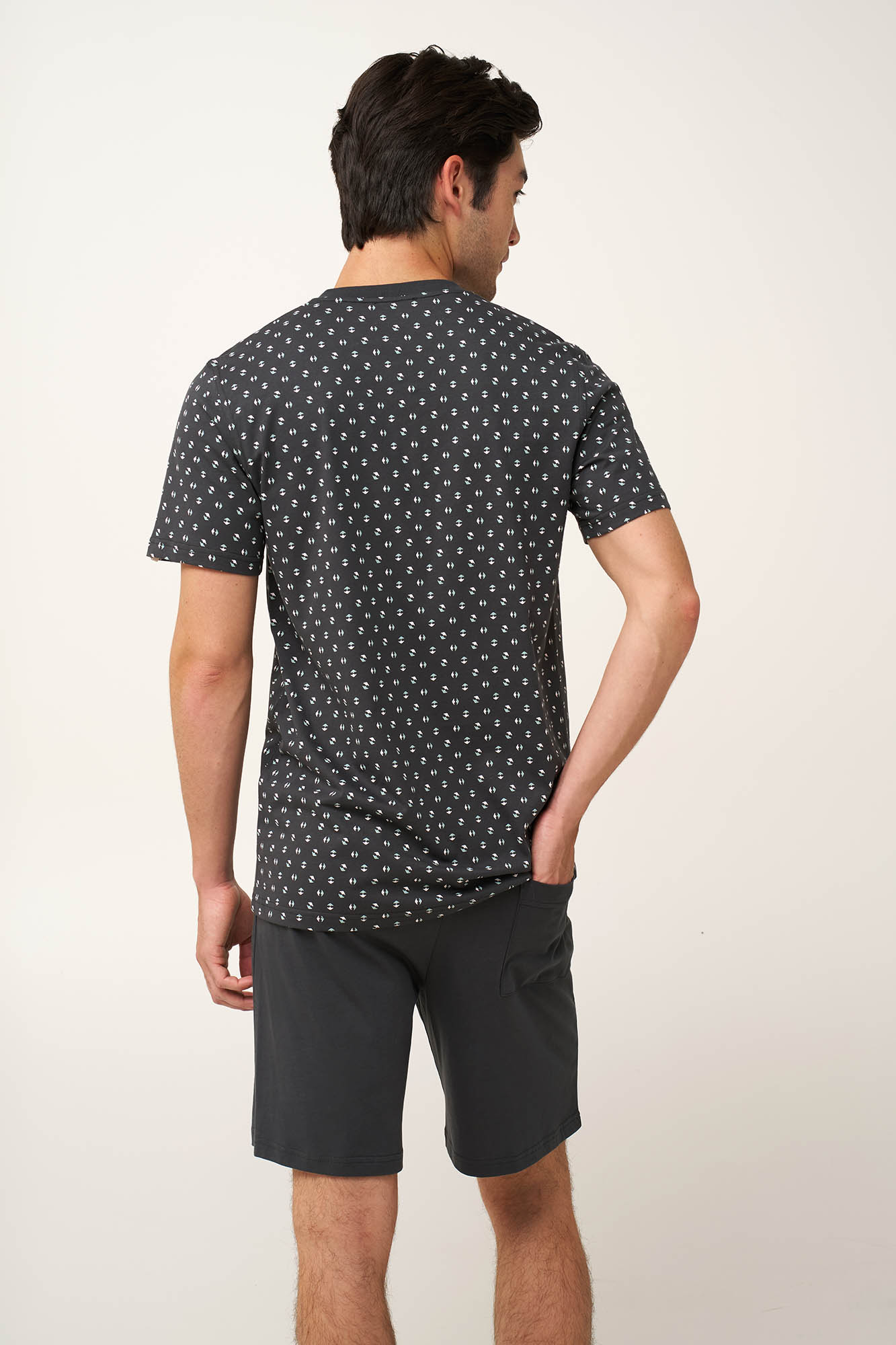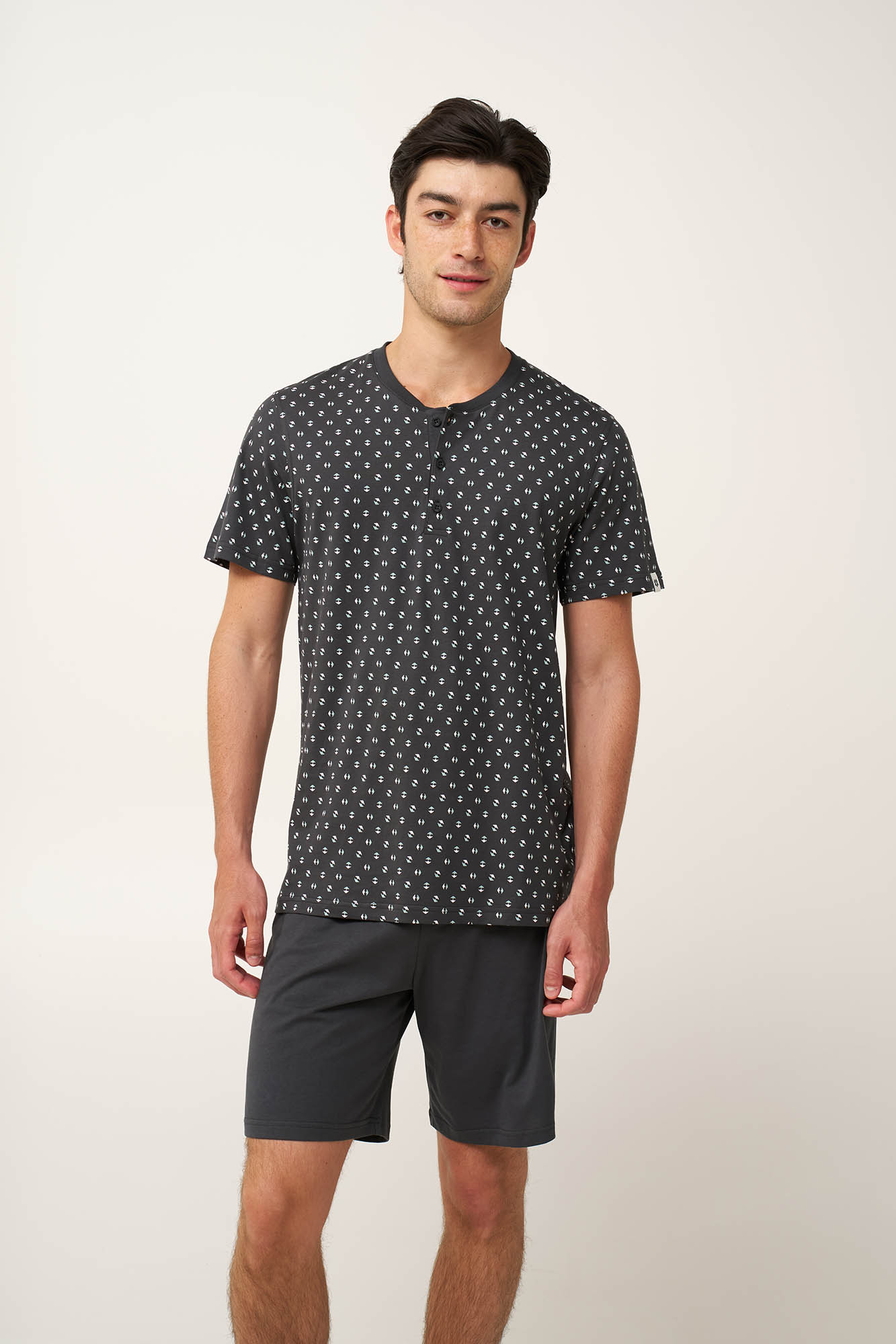 Χαρίστε άνεση και διαχρονικό χαρακτήρα στις ημέρες σας με αυτό το σετ καλοκαιρινές ανδρικές πυτζάμες, κατασκευασμένο από 100% βαμβάκι single jersey που χαρίζει ανάλαφρη και δροσερή αίσθηση. Διαθέτει τοπ με κλασική πατιλέτα και διακριτικό μοτίβο εμπνευσμένο από τη φύση, με μινιμαλιστικές πράσινες και λευκές φόρμες διάσπαρτες σε βαθύ γκρι φόντο. Συνδυάζεται με μονόχρωμο κοντό παντελόνι με χαλαρή εφαρμογή. Ιδανικό για ξεκούραστο ύπνο και ήρεμες στιγμές στο σπίτι.
