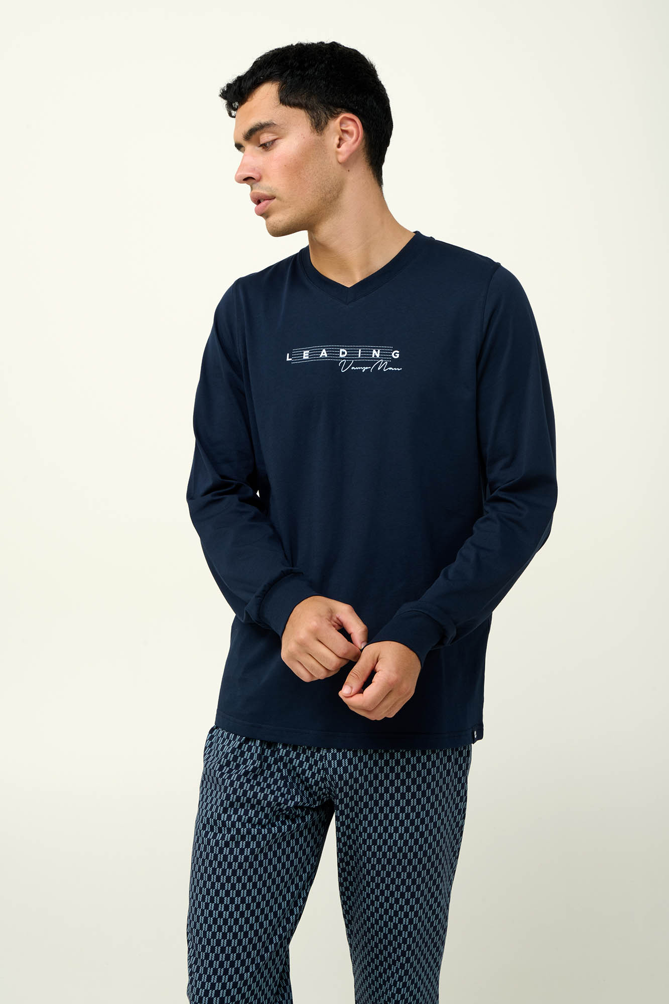 Υποδεχτείτε τον χειμώνα με αυτές τις ανδρικές πyτζάμες από 100% απαλό και διαπνέον βαμβάκι s. jersey. Το μονόχρωμο τοπ με V λαιμόκοψη και μανσέτες συνδυάζεται αρμονικά με μακρύ παντελόνι σε κλασικό γεωμετρικό μοτίβο. Ένα σετ που θα σας βοηθήσει να χαλαρώσετε μετά από μια μεγάλη ημέρα η να απολαύσετε ένα ήρεμο πρωινό.