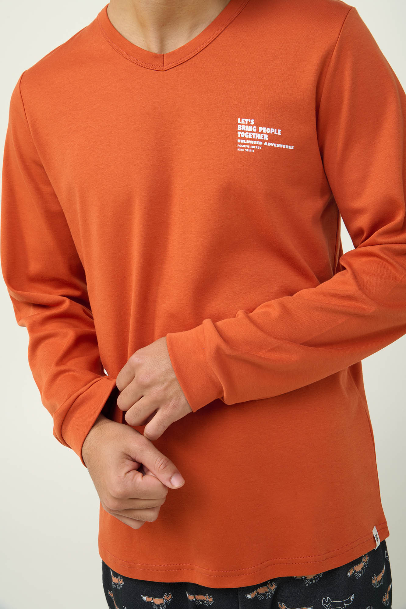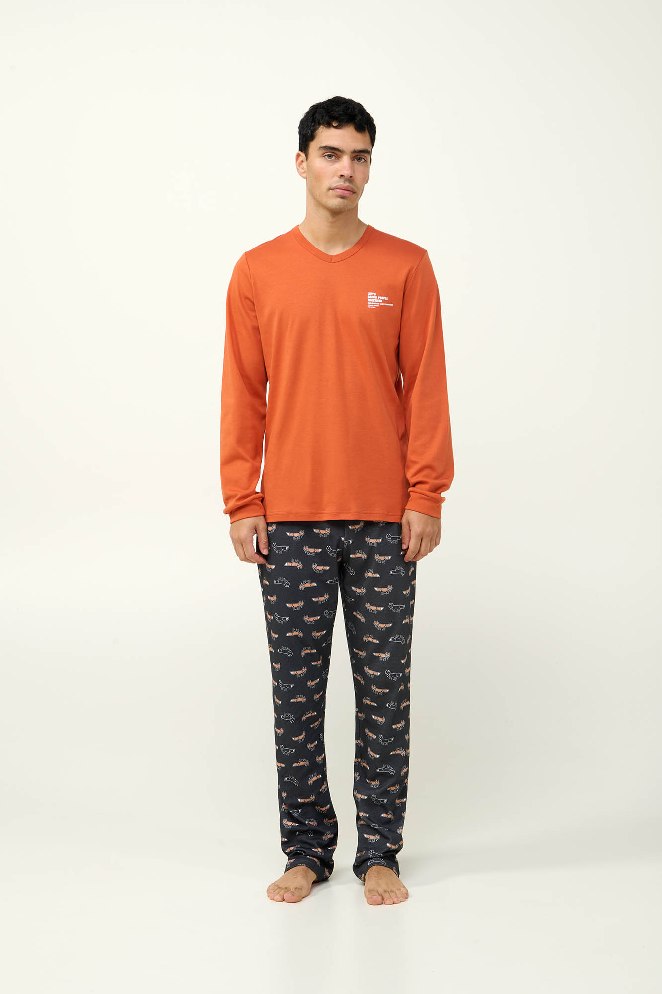 Χαλαρώστε με άνεση και στυλ με αυτές τις ανδρικές χειμερινές πυτζάμες από 100% βαμβάκι interlock, που χαρίζει απαλή αίσθηση και επιστρέπει στο δέρμα να αναπνέει. Το μονόχρωμο τοπ με V λαιμόκοψη και μακριά μανίκια έχει μανσέτες για βέλτιστη εφαρμογή και διαχρονική εμφάνιση. Το σετ ολοκληρώνεται με παντελόνι που έχει επίσης μανσέτες και παιχνιδιάρικο μοτίβο με αλεπούδες σε στυλ καρτούν. Ιδανικές για χαλαρές στιγμές στο σπίτι, αυτές οι πυτζάμες συνδυάζουν άνεση και ξεχωριστό χαρακτήρα.