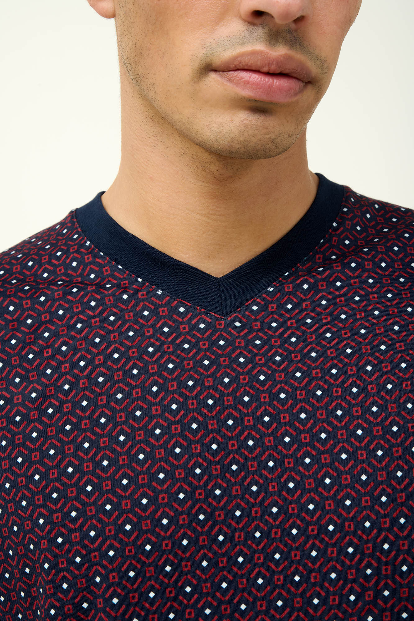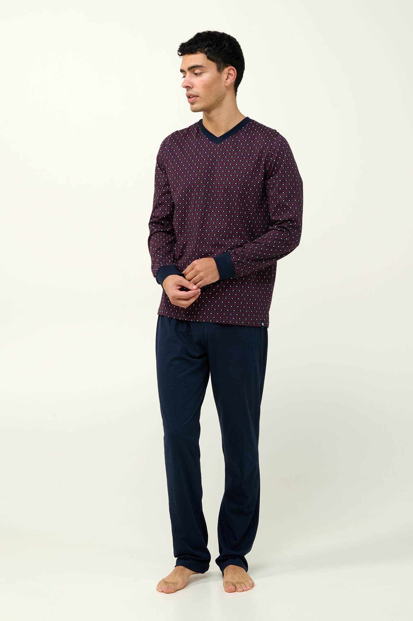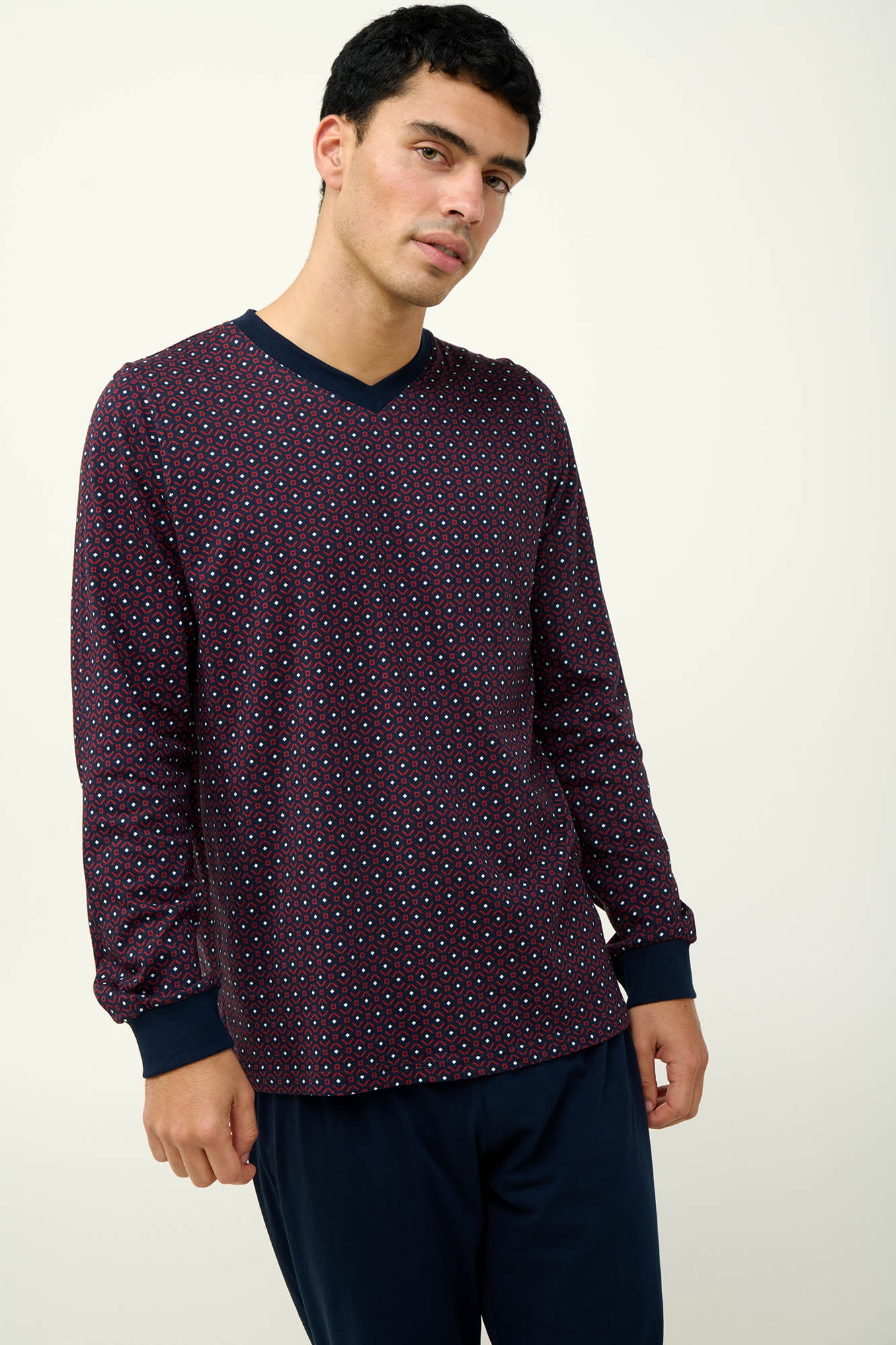 Προσθέστε στη συλλογή σας αυτή την ανδρική χειμερινή πυτζάμα από 100% βαμβάκι s. jersey. Το πάνω μέρος έχει λαιμόκοψη  V και μακριά μανίκια με μανσέτες σε επαναλαμβανόμενο γεωμετρικό μοτίβο, ενώ το παντελόνι είναι μονόχρωμο για να χαρίζει ισορροπία στο σύνολο. Μια κλασική πυτζάμα που θα απολαύσετε για χρόνια στις στιγμές χαλάρωσης σας.