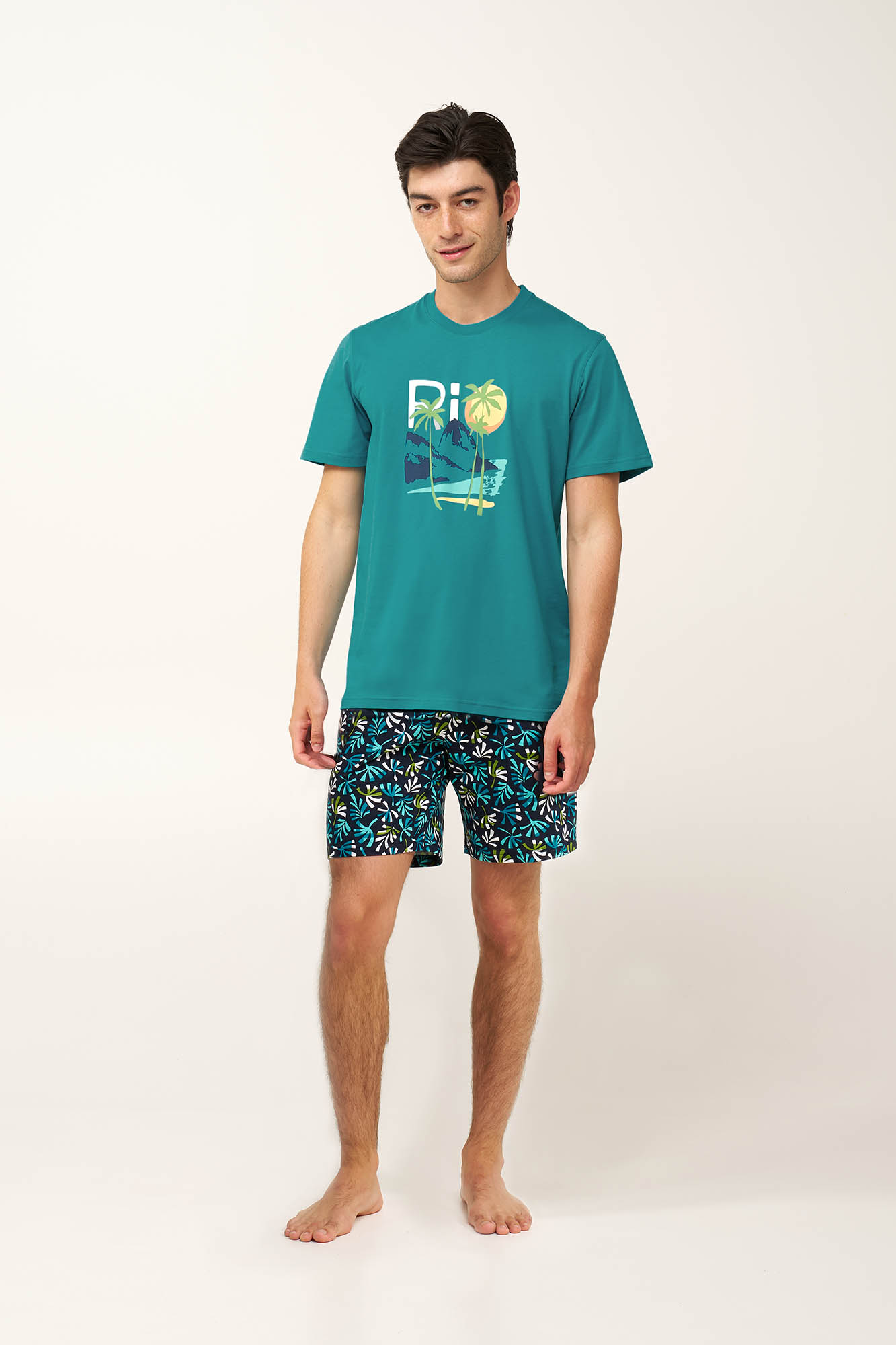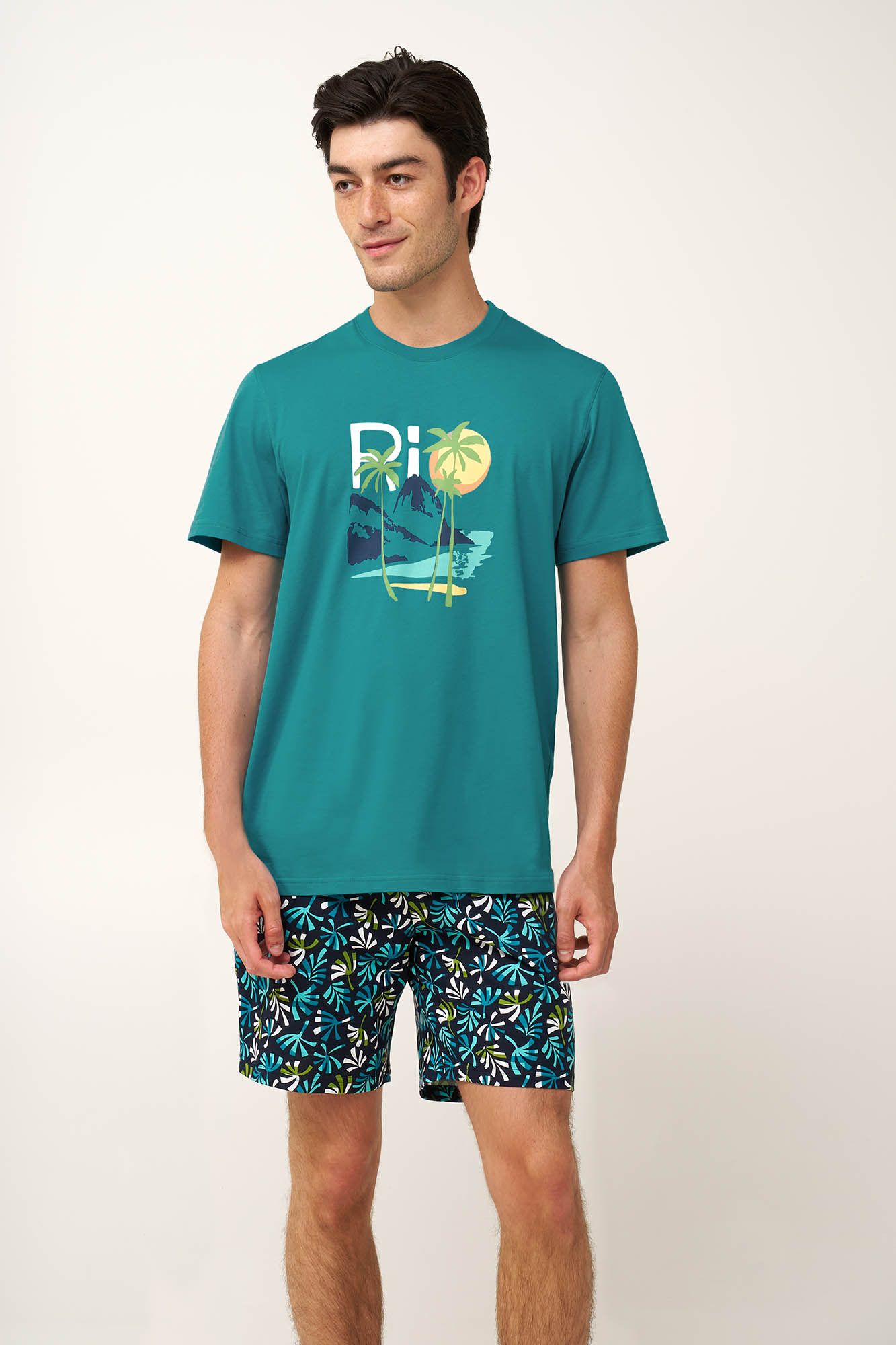 Χαρίστε μια δροσερή νότα στο καλοκαίρι σας με αυτό το ανδρικό σετ πυτζάμες, κατασκευασμένο από 100% βαμβάκι single jersey με απαλή αίσθηση στο δέρμα. Η μπλούζα διαθέτει στρογγυλή λαιμόκοψη και τύπωμα με φοίνικες σε παραλία του Ρίο, προσθέτοντας τροπική πινελιά. Το κοντό παντελόνι είναι διακοσμημένο με πλούσια φύλλα σε καθαρό λευκή και τιρκουάζ απόχρωση. Άνετο και ελαφρύ θα σας βοηθήσει να απολαύσετε κάθε στιγμή στο σπίτι.