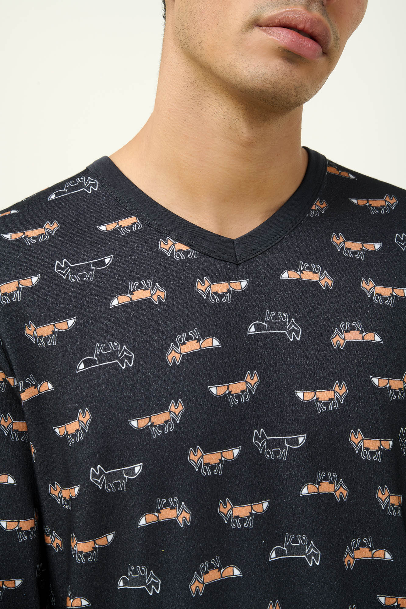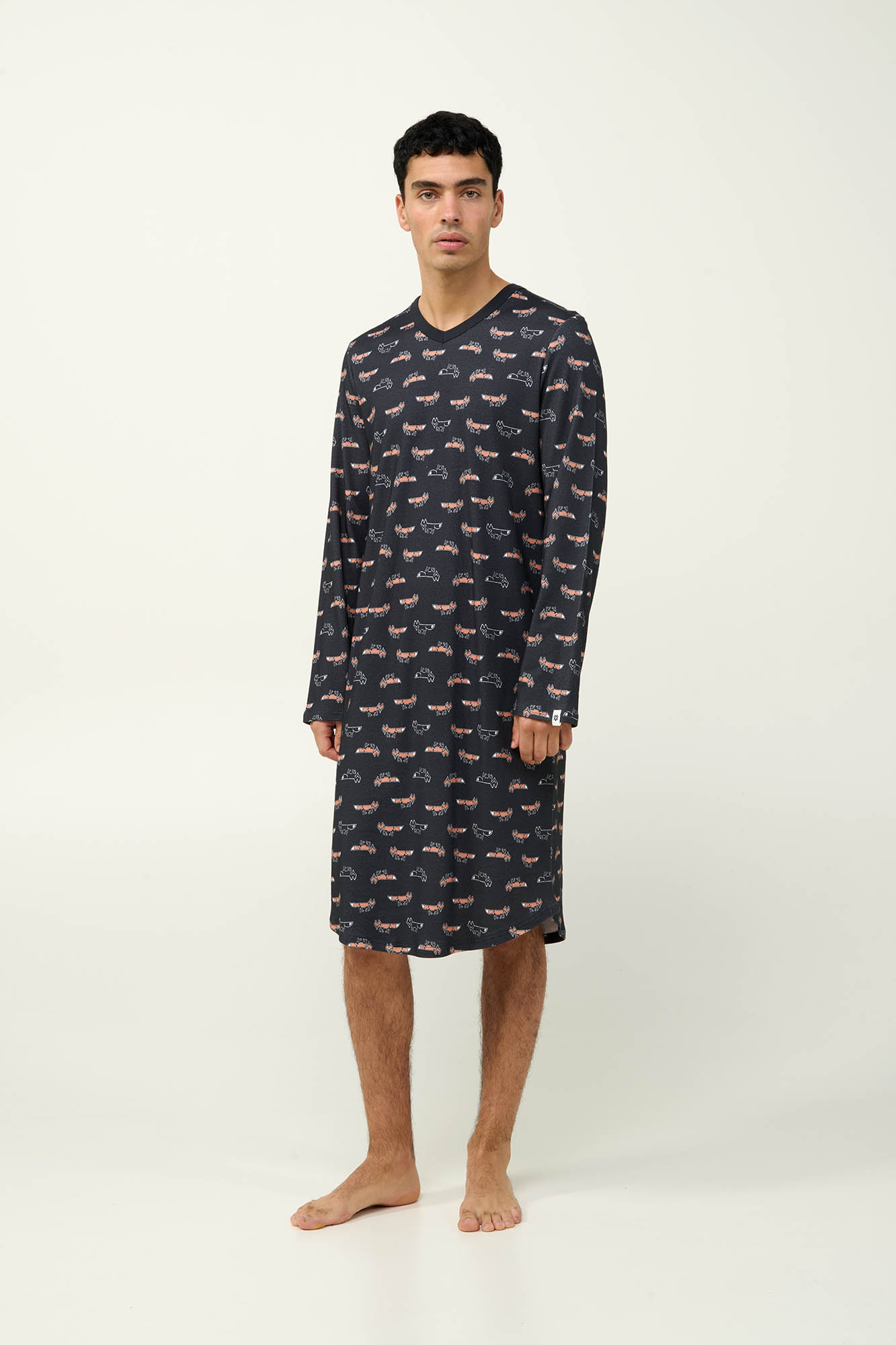 Ανακαλύψτε την απόλυτη άνεση με αυτό το ανδρικό νυχτικό, φτιαγμένο από 100% βαμβάκι interlock που προσφέρει απαλή και διαπνέουσα αίσθηση. Με κλασική V λαιμόκοψη και μακριά μανίκια, διαθέτει ένα διασκεδαστικό μοτίβο με αλεπούδες σε στυλ καρτούν. Ιδανικό για ήσυχα βράδια και ξεκούραστο ύπνο, με απόλυτη ελευθερία κινήσεων.