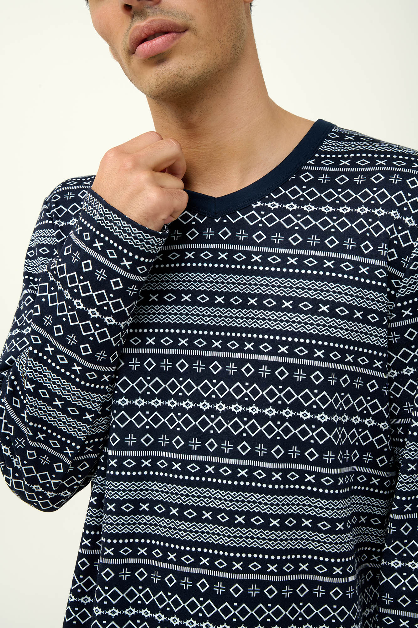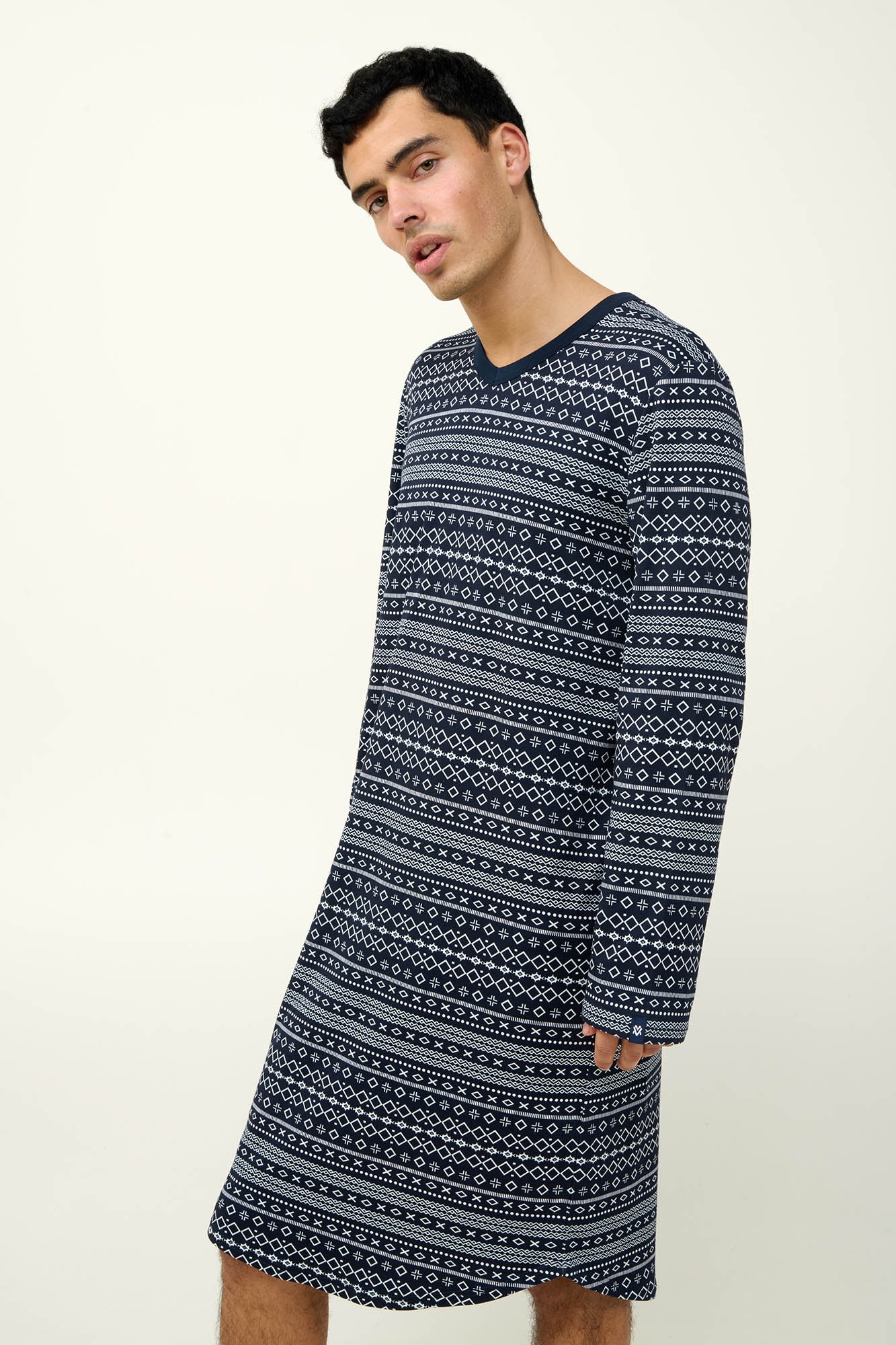 Ανακαλύψτε την απόλυτη άνεση με αυτό το ανδρικό νυχτικό, φτιαγμένο από 100% βαμβάκι interlock που προσφέρει απαλή και διαπνέουσα αίσθηση. Με κλασική V λαιμόκοψη και μακριά μανίκια, διαθέτει γεωμετρικό σχέδιο που θυμίζει σκανδιναβικό, προσθέτοντας μια διακριτική χειμερινή νότα. Ιδανικό για ήσυχα βράδια και ξεκούραστο ύπνο, με απόλυτη ελευθερία κινήσεων.