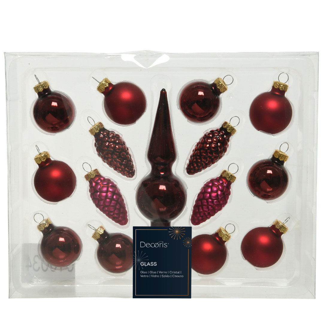 Σετ γυάλινων χριστουγεννιάτικων στολιδιών σε αποχρώσεις του μπορντό που προσθέτουν κομψότητα και γιορτινή ατμόσφαιρα στο χώρο σας. Το σετ περιλαμβάνει 15 τεμάχια και αποτελείται από μπάλες, κουκουνάρια και μία κορυφή δέντρου, όλα φτιαγμένα με προσοχή στη λεπτομέρεια και με γυαλιστερό φινίρισμα. Ιδανικό για να δώσει πολυτέλεια και ζεστασιά στο χριστουγεννιάτικο δέντρο σας, προσφέροντας μια ιδιαίτερη πινελιά κλασικής διακόσμησης σε κάθε χώρο.