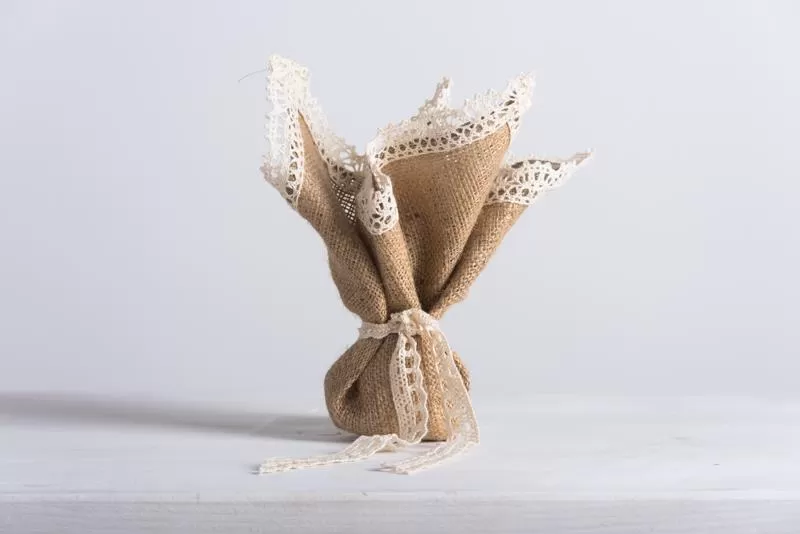 Κατασκευασμένο από ύφασμα με φυσικά νήματα ιούτης και διακοσμημένο με πλεκτή βαμβακερή δαντέλα