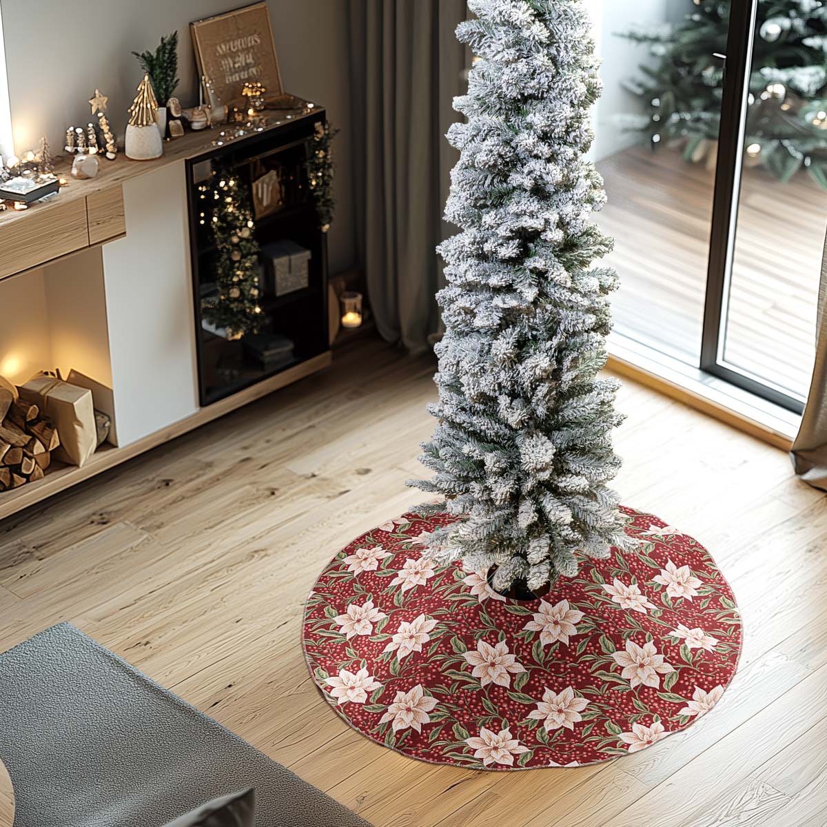Κομψή και πρακτική ποδιά για χριστουγεννιάτικο δέντρο, ιδανική για να καλύψει τη βάση του και να ολοκληρώσει τη γιορτινή διακόσμηση. Προσθέτει ζεστασιά και στυλ στον χώρο σας, ενώ προστατεύει το δάπεδο από πευκοβελόνες και διακοσμητικά υπολείμματα.