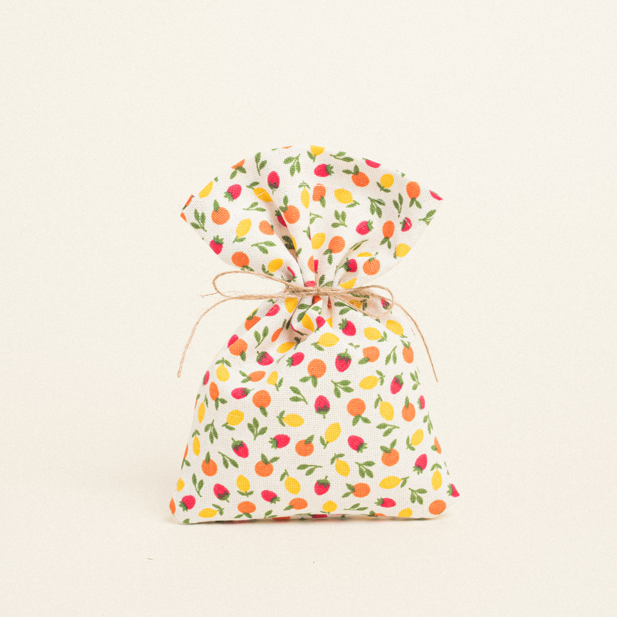 Υφασμάτινο πουγκί διαστάσεων 12 x 17 cm, με χαριτωμένο μοτίβο mini φρούτων σε mix αποχρώσεις. Κατασκευασμένο από υψηλής ποιότητας ύφασμα (80% βαμβάκι – 20% πολυέστερ), αποτελεί ιδανική επιλογή για μπομπονιέρες γάμου ή βάπτισης, καθώς και για ιδιαίτερες συσκευασίες κοσμημάτων, γουριών ή χειροποίητων ειδών.