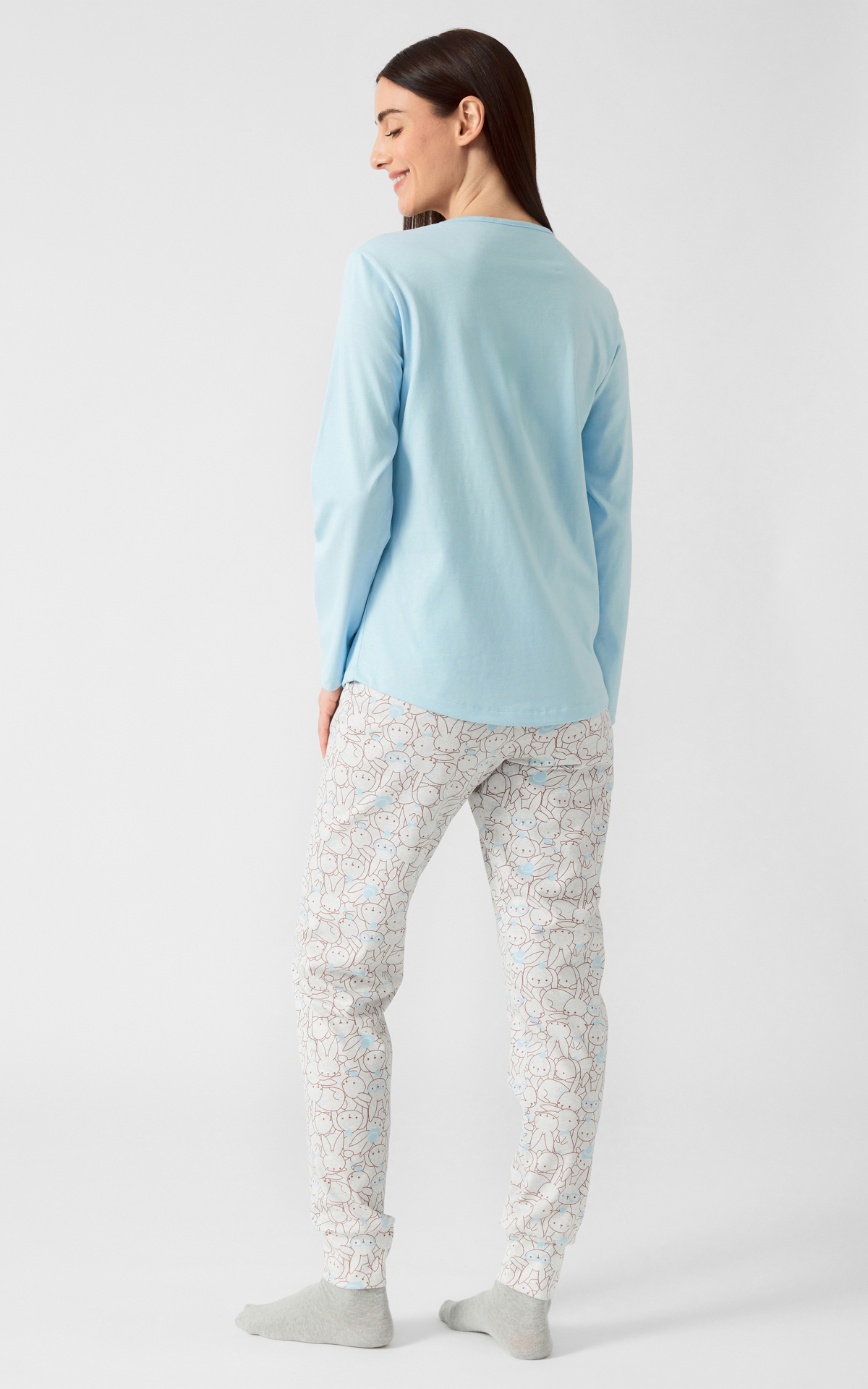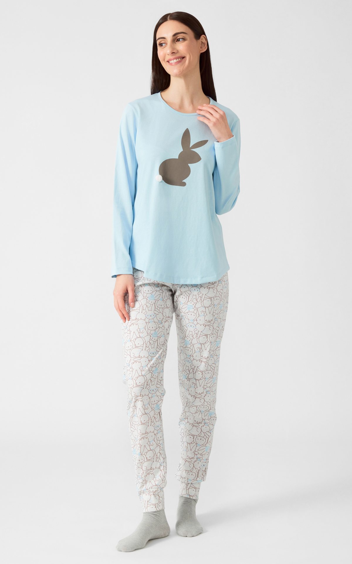Χειμερινή πυζάμα από 100% βαμβάκι, υψηλής ποιότητος. Το σετ περιλαμβάνει μπλούζα μακρυμάνικη με στρογγυλή λαιμόκοψη και παντελόνι με μπάσκες στα τελειώματα, σε διάφορους χρωματικούς συνδυασμούς μονόχρωμου και τυπωμένου υφάσματος. (Σιελ)