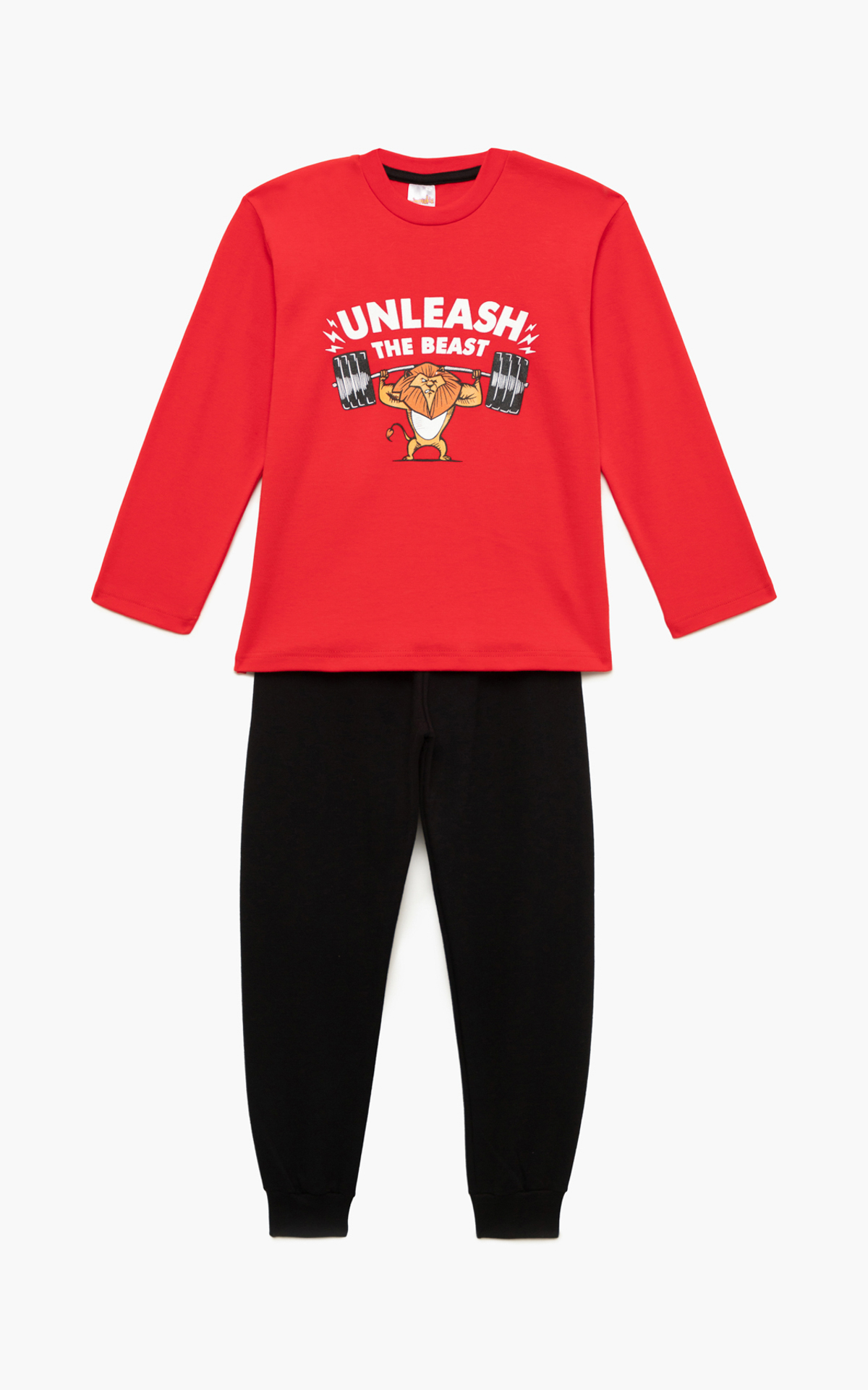 Παιδική χειμερινή πυζάμα, από 100% βαμβακερό ύφασμα, υψηλής ποιότητος. Το σετ περιλαμβάνει μπλούζα με τύπωμα στο στήθος και παντελόνι μονόχρωμο, με μπάσκες στα τελειώματα. (Κοκκινο)