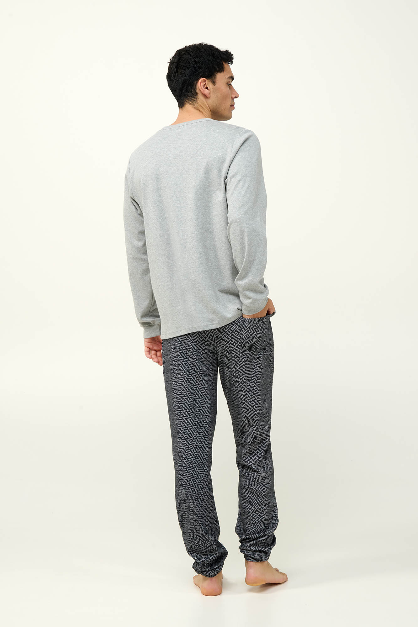 Επιλέξτε ένα σετ ανδρικές χειμερινές πυτζάμες από απαλό και διαπνέον 100% βαμβάκι interlock. Το σετ περιλαμβάνει μπλούζα με στρογγυλή λαιμόκοψη, διακοσμημένο με γεωμετρικό σχέδιο στο στήθος και μανσέτες στα μανίκια για ένα άνετη εφαρμογή. Το παντελόνι με μανσέτες έχει έντονο γεωμετρικό μοτίβο λαβύρινθο, προσθέτοντας μια μοντέρνα νότα στην εμφάνιση σας. Ιδανικό για στιγμές χαλάρωσης και έναν άνετο ύπνο.