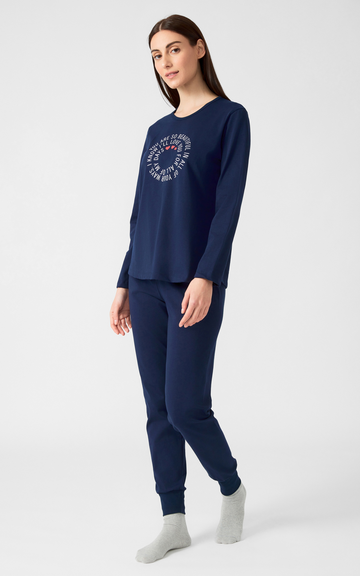 Χειμερινή πυζάμα από 100% βαμβακερό ύφασμα, υψηλής ποιότητος. Το σετ περιλαμβάνει μπλούζα μακρυμάνικη, με στρογγυλή λαιμόκοψη, τύπωμα στο στήθος και μακρύ, μονόχρωμο παντελόνι με μπάσκες στα τελειώματα. (Μαριν)