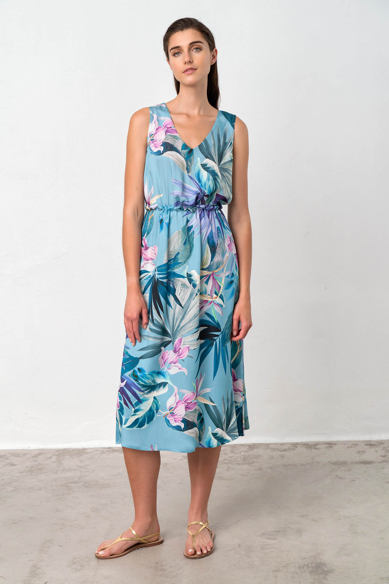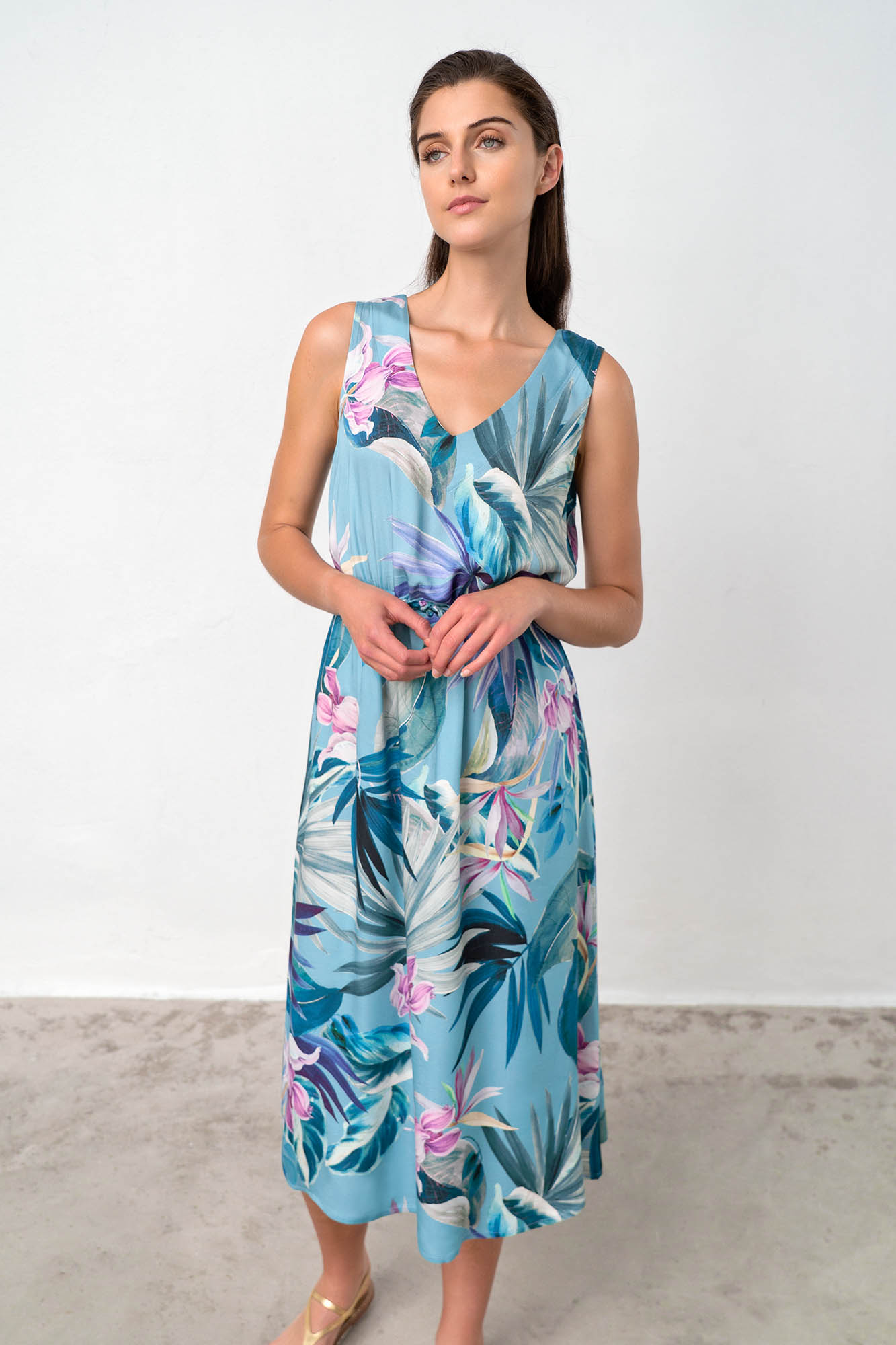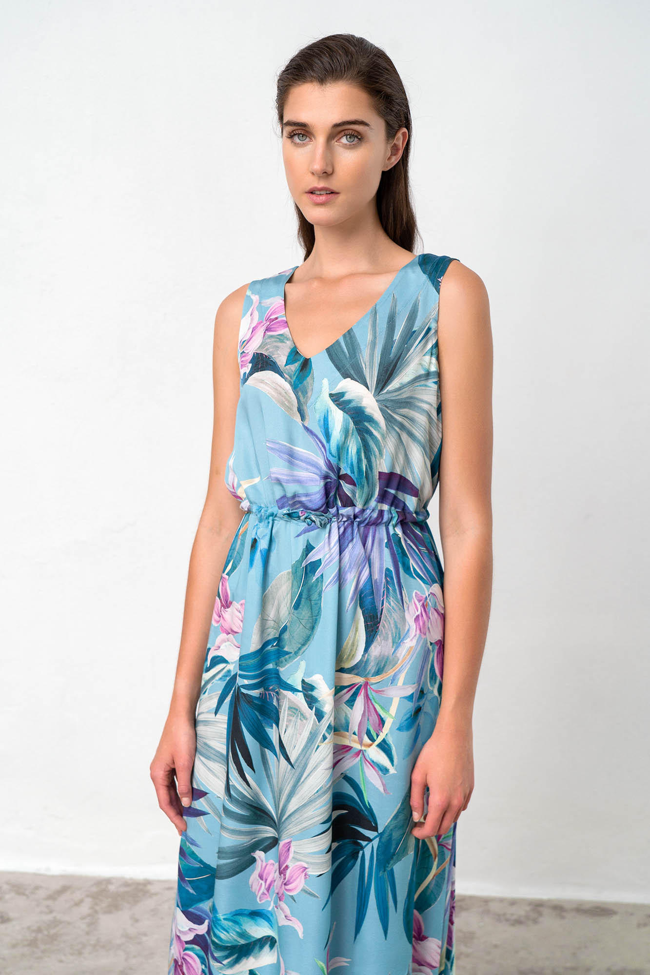 Αμάνικο, μακρύ φόρεμα με λαιμόκοψη V με δέσιμο στη μέση σε χαλαρή γραμμή. Ένα όμορφο φλοράλ σε μπλε αποχρώσεις για τις καλοκαιρινές σας διακοπές.