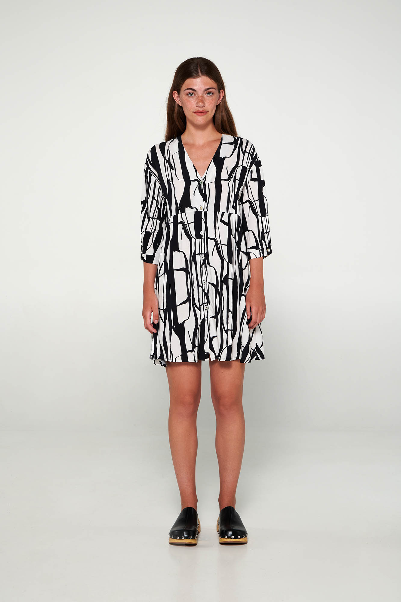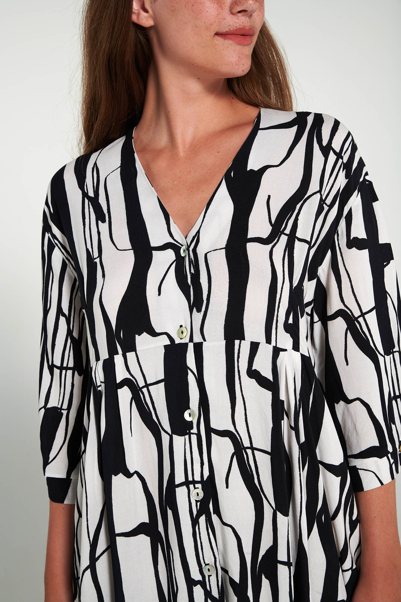 Εμπριμέ, κουμπωτό καφτάνι με κοντό μανίκι και V λαιμόκοψη. Ιδανική επιλογή για κάθε στιγμή της ημέρας σας.