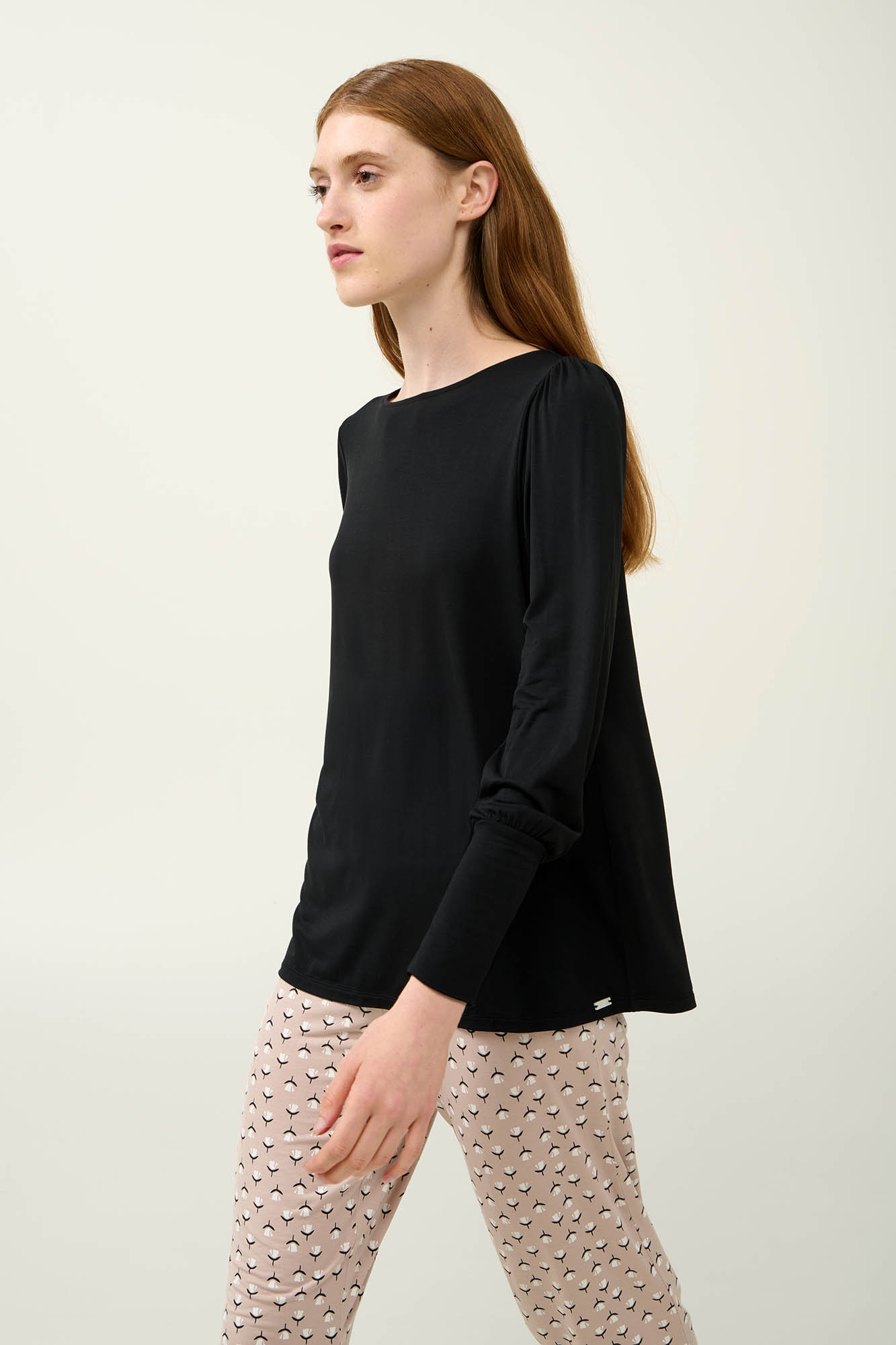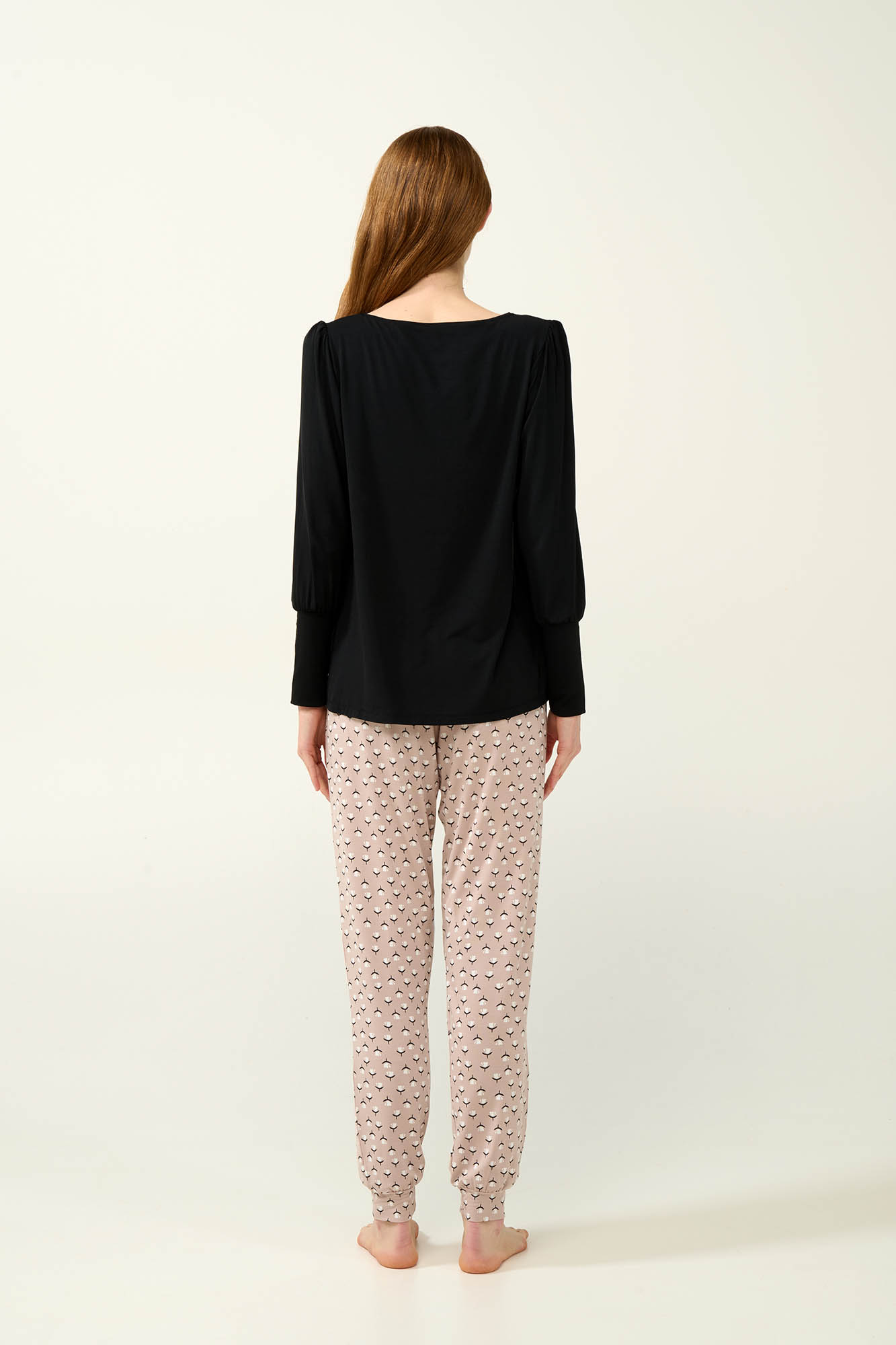 Επιλέξτε ένα σετ γυναικείες πυτζάμες κατασκευασμένο από εξαιρετικά απαλό LEZING Tencel Modal Micro, που αγκαλιάζει ευχάριστα το σώμα και επιτρέπει στο δέρμα να αναπνέει. Είναι σχεδιασμένο με μονόχρωμο τοπ, με μανσέτες στα μανίκια και παντελόνι με μανσέτες σε μίνιμαλ φλοράλ μοτίβο που προσθέτει μια διακριτική νότα θηλυκότητας. Ιδανική επιλογή για στιγμές χαλάρωσης στο σπίτι ή για έναν ξεκούραστο ύπνο.