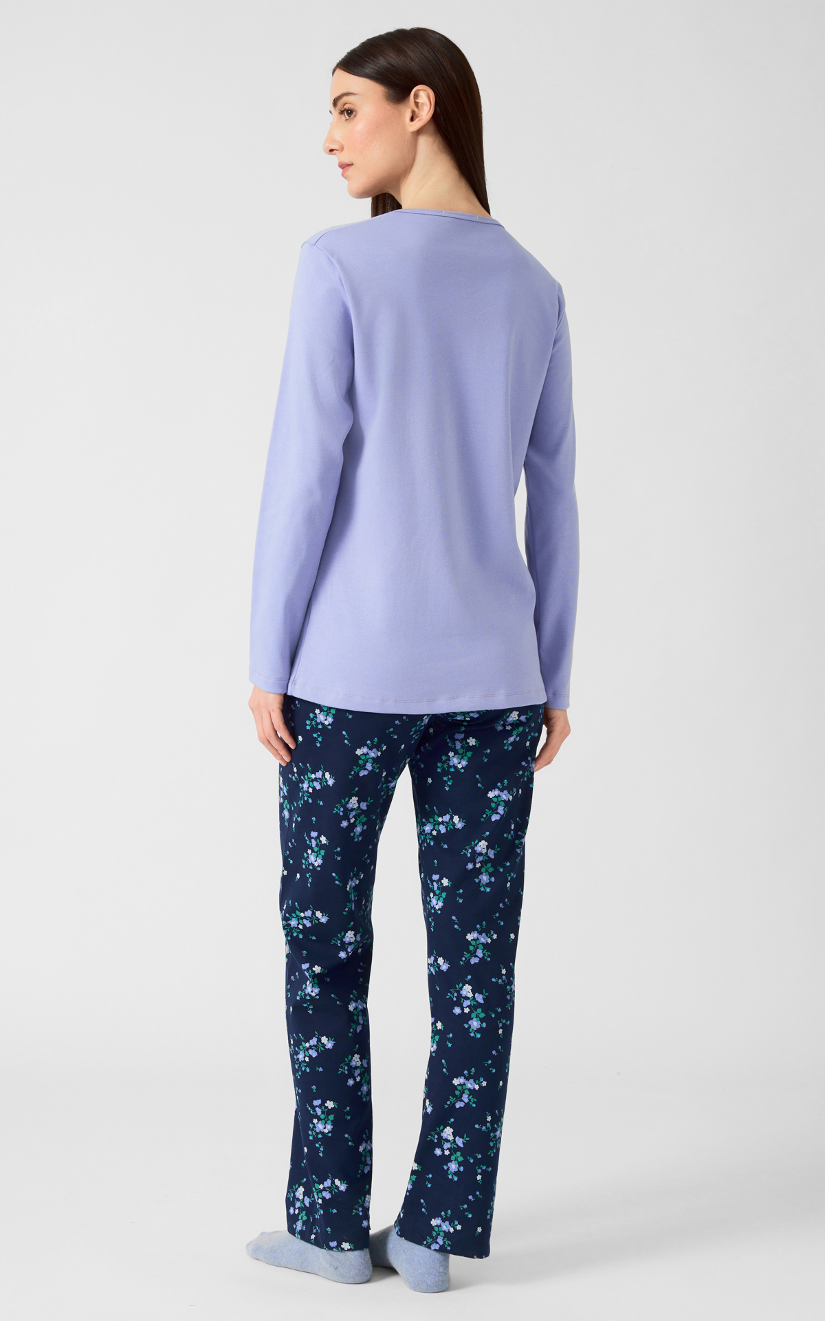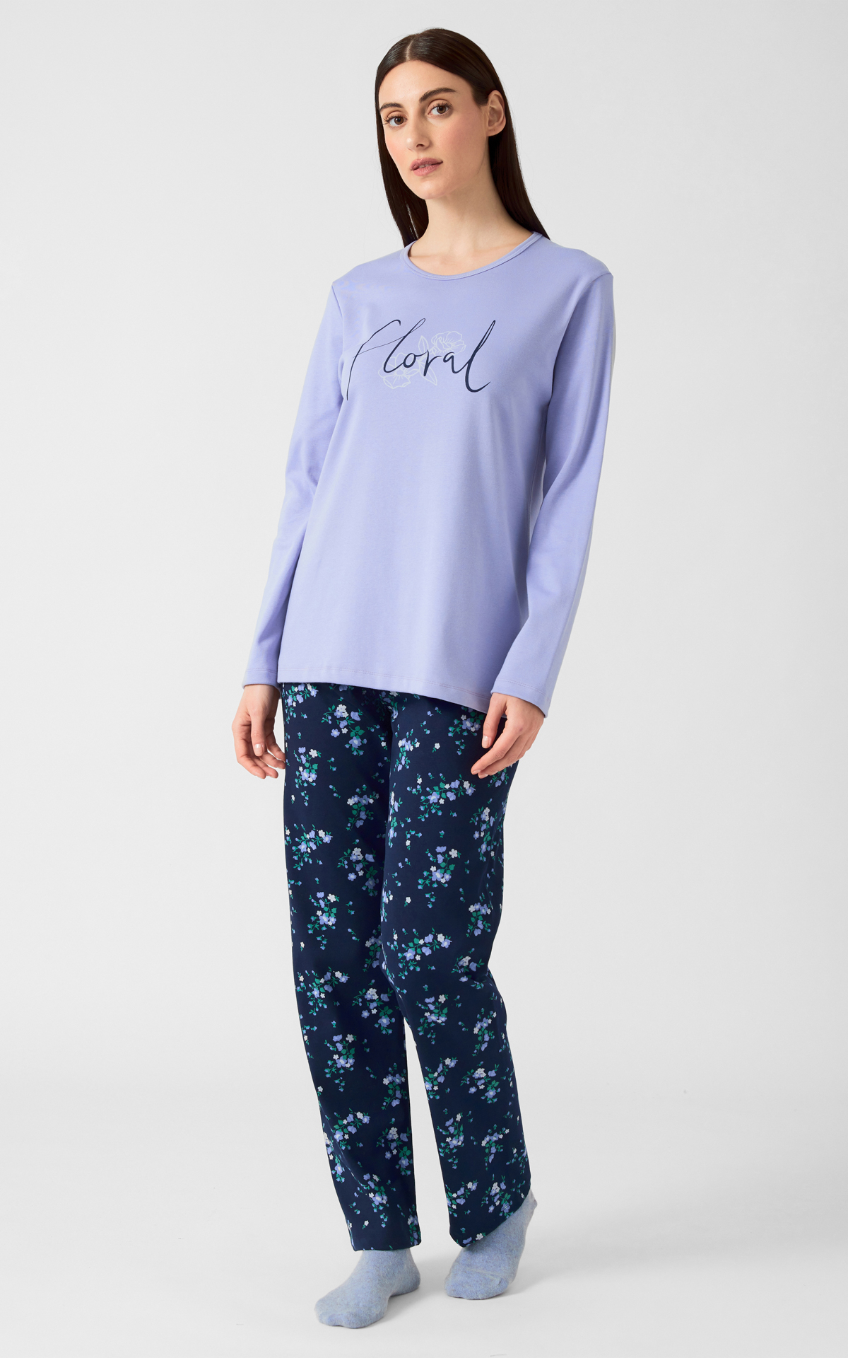 Χειμερινή πυζάμα, από 100% βαμβακερό ύφασμα υψηλής ποιότητος.Το σετ περιλαμβάνει μπλούζα μακρυμάνικη,μονόχρωμη με τύπωμα στο στήθος και παντελόνι ίσιο, τυπωμένο εμπριμέ. (Violet)