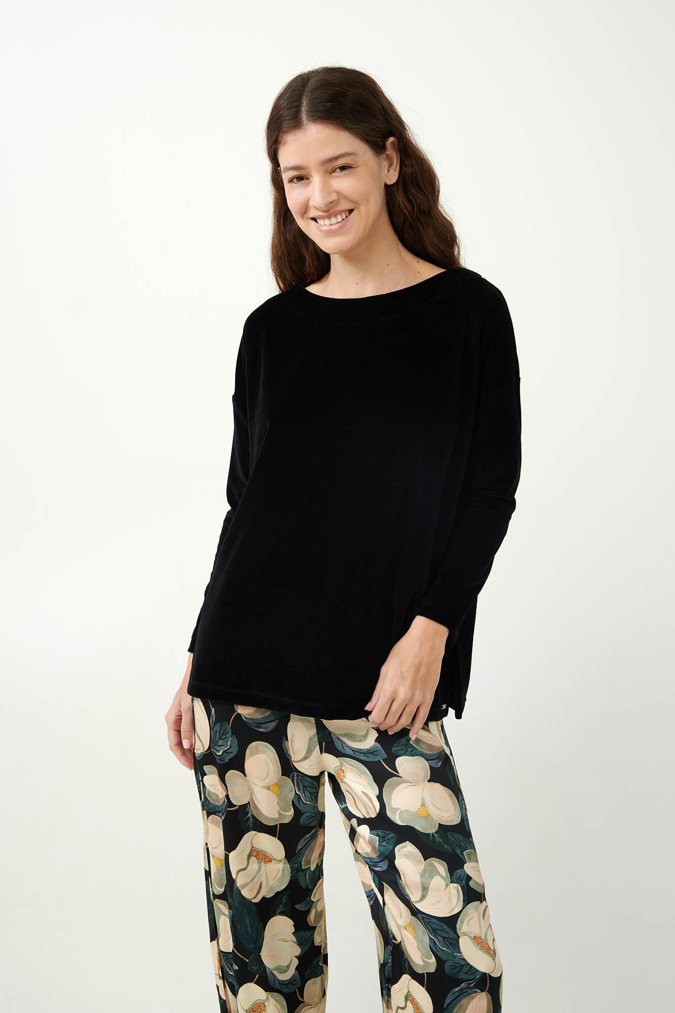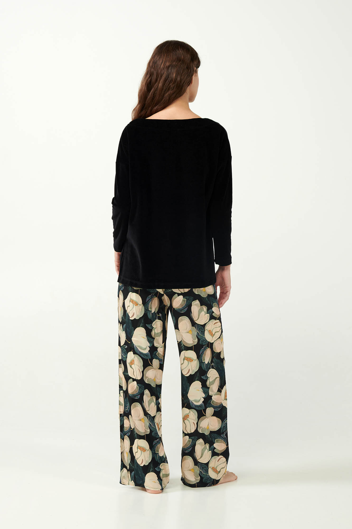 Αυτό το γυναικείο σετ πιτζάμες συνδυάζει ένα μονόχρωμο μαύρο τοπ από βελούδο με ένα φαρδύ παντελόνι σε φλοράλ μοτίβο με ανθισμένες μανόλιες. Το πάνω μέρος προσφέρει μαλακή και ζεστή αίσθηση ενώ το παντελόνι από σατέν viscose δίνει μια απαλή σα μετάξι αίσθηση στο δέρμα. Η αντίθεση των χρωμάτων και τον διαφορετικών υφών δημιουργεί ένα ιδιαίτερο και κομψό σύνολο που θα σας εξασφαλίσει την άνεση που αναζητάτε καθ’ όλη τη διάρκεια της ημέρας.