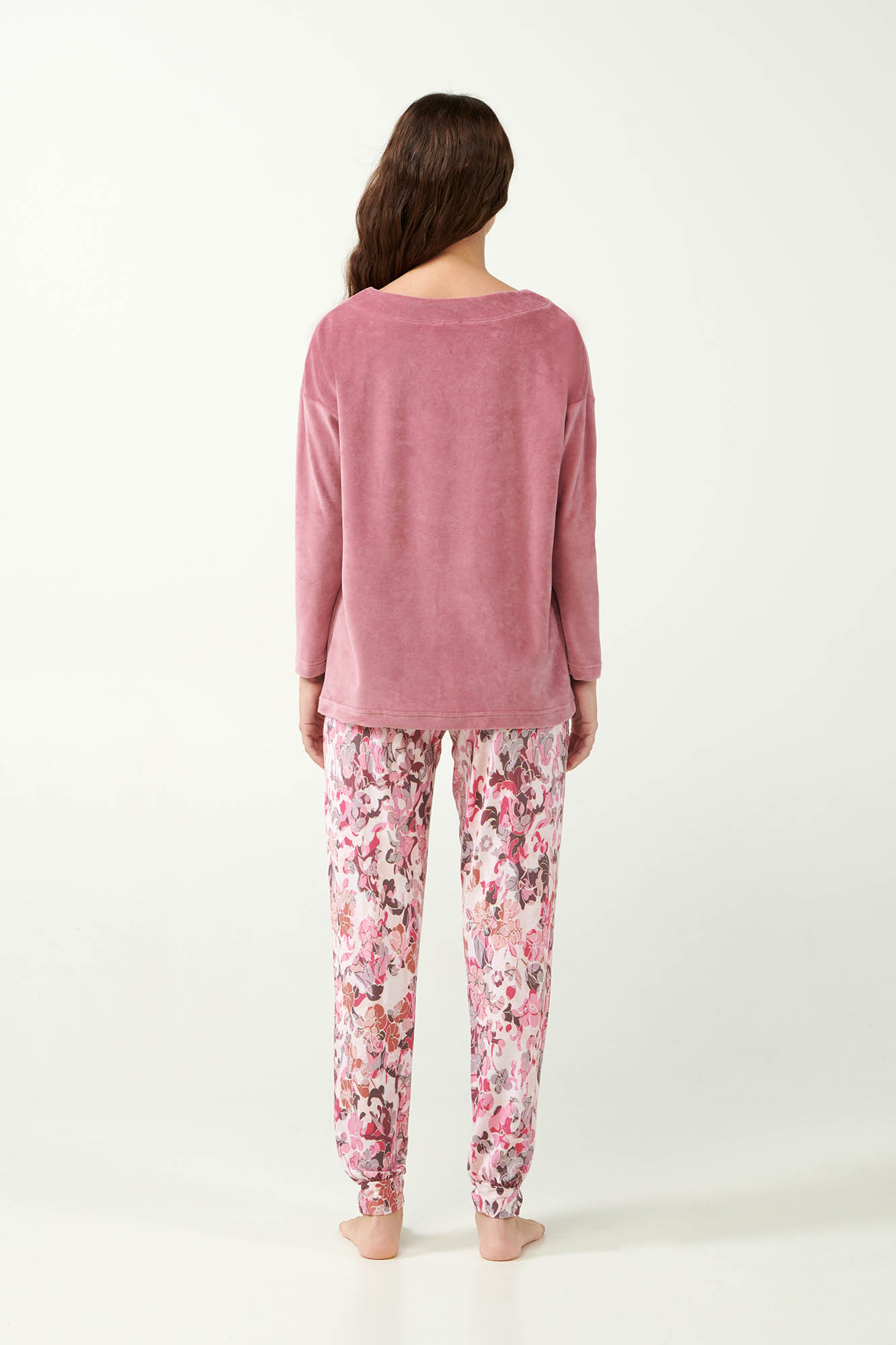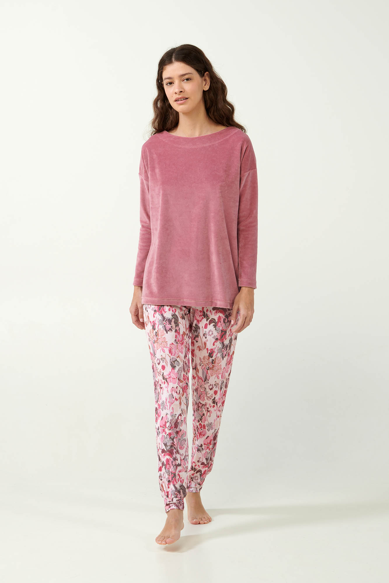 Αγκαλιάστε την κομψότητα που σας προσφέρει αυτό το όμορφο σετ γυναικείς πυτζάμες. Αποτελείται από ένα μονόχρωμο τοπ φτιαγμένο από απαλό βελούδο που συνδυάζεται αρμονικά με ένα micromodal φλοράλ παντελόνι με μανσέτες. Σχεδιασμένο για χαλαρές στιγμές στο σπίτι, θα σας προσφέρει μια κομψή εμφάνιση και άνεση που διαρκεί. Προσθέστε στη συλλογή σας ένα σετ που θα απολαύσετε για χρόνια.
