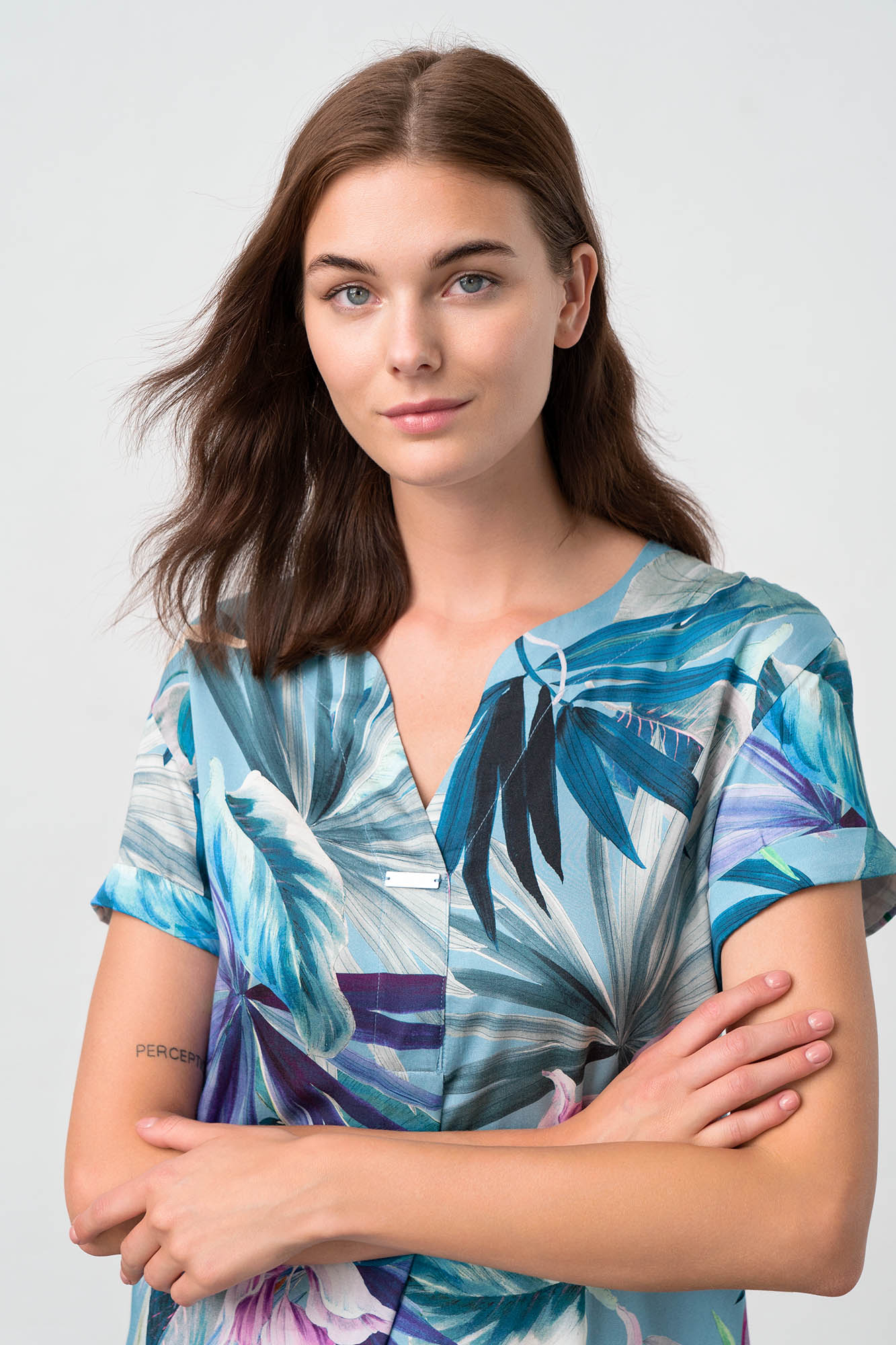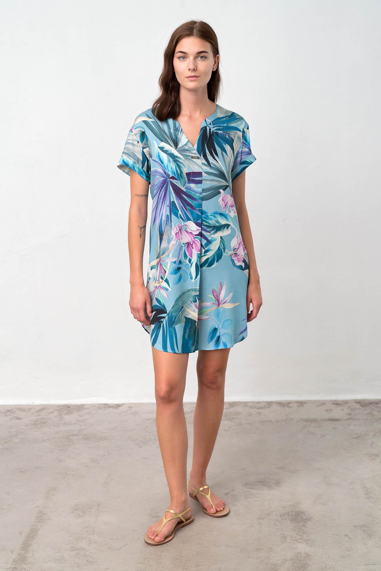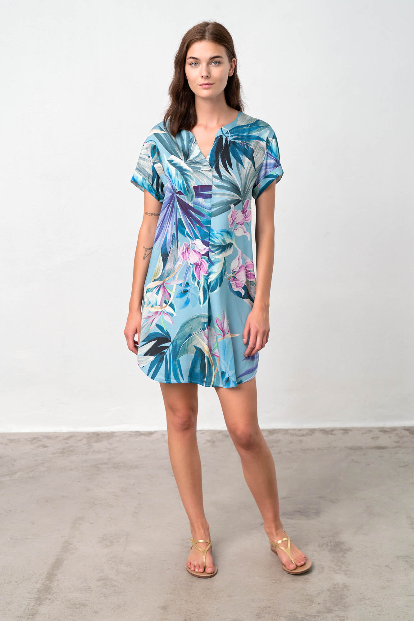 Εμπριμέ φόρεμα με κοντό μανίκι, λαιμόκοψη V και πιέτα για μεγαλύτερη άνεση. Ένα όμορφο φλοράλ σε μπλέ αποχρώσεις για τις καλοκαιρινές σας διακοπές.