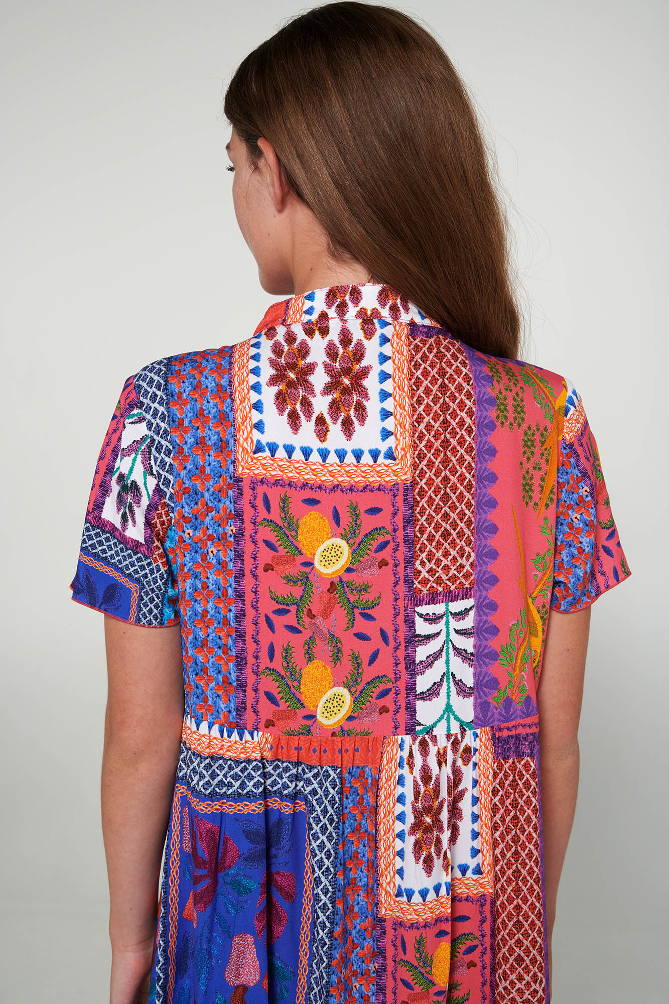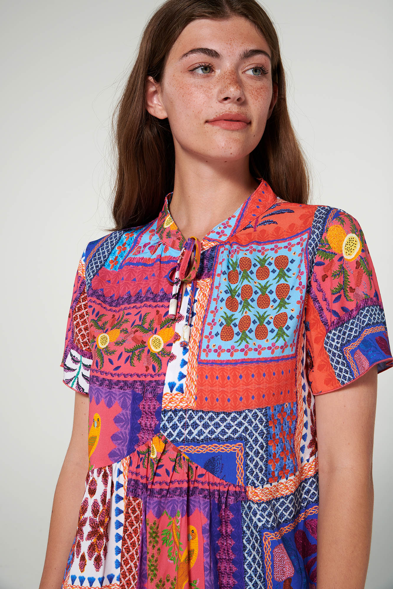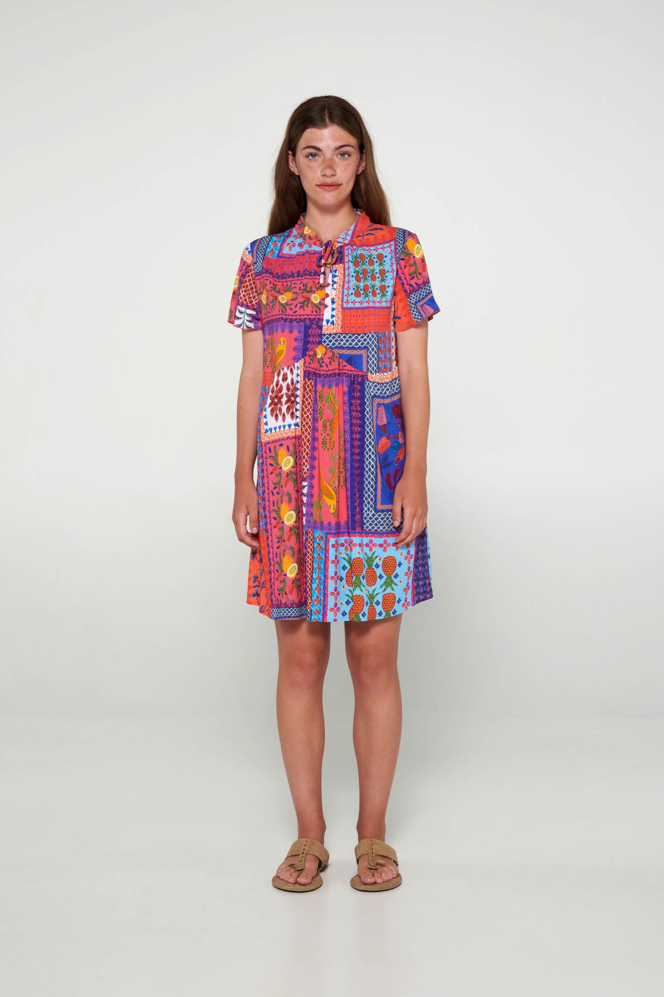 Εμπριμέ φόρεμα με κοντό μανίκι, πιέτες και δέσιμο στη λαιμόκοψη. Θα σας δώσει τη φρεσκάδα που χρειάζεστε για να ξεκινήσετε τη μέρα σας.