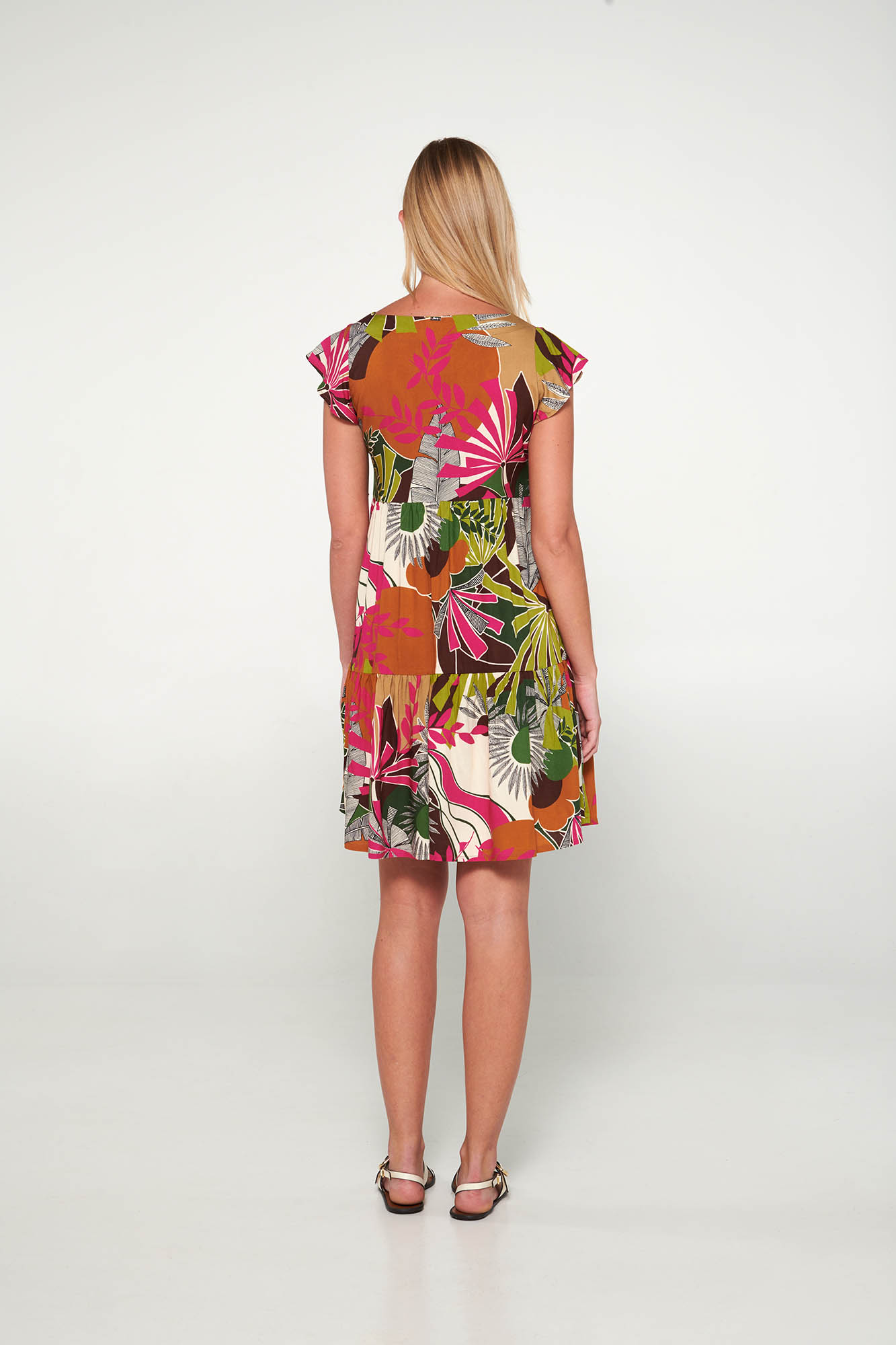 Εμπριμέ φόρεμα με κοντό μανίκι και V λαιμόκοψη. Μια όμορφη επιλογή για τις καλοκαιρινές σας διακοπές.