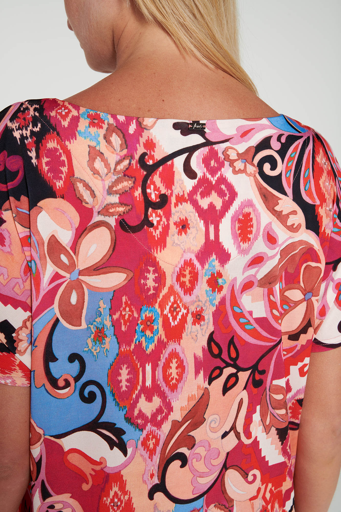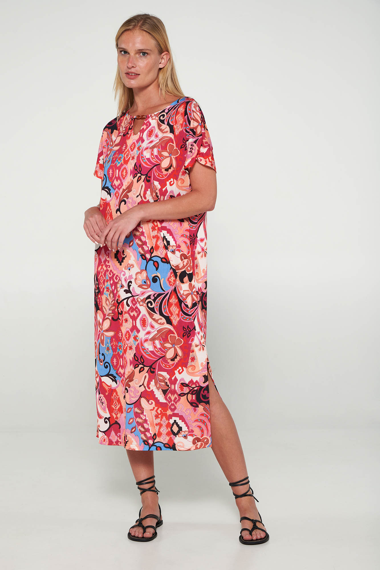Μακρύ φόρεμα με κοντό μανίκι και στρογγυλή λαιμόκοψη σε άνετη γραμμή. Δώστε χρώμα στις ημέρες του καλοκαιριού σας με ένα ζωντανό, εμπριμέ σχέδιο.