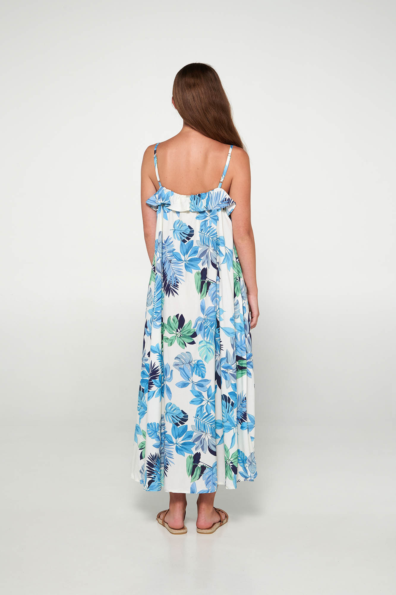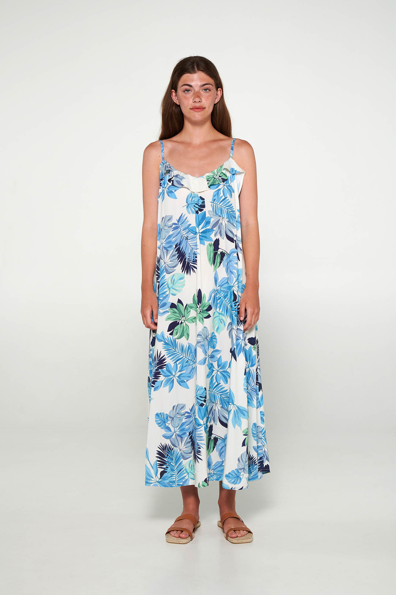 Μακρύ καφτάνι με τιράντες και πιέτα για μεγαλύτερη άνεση. Ένα όμορφο, φωτεινό φλοράλ που θα φορέσετε όλο το καλοκαίρι.