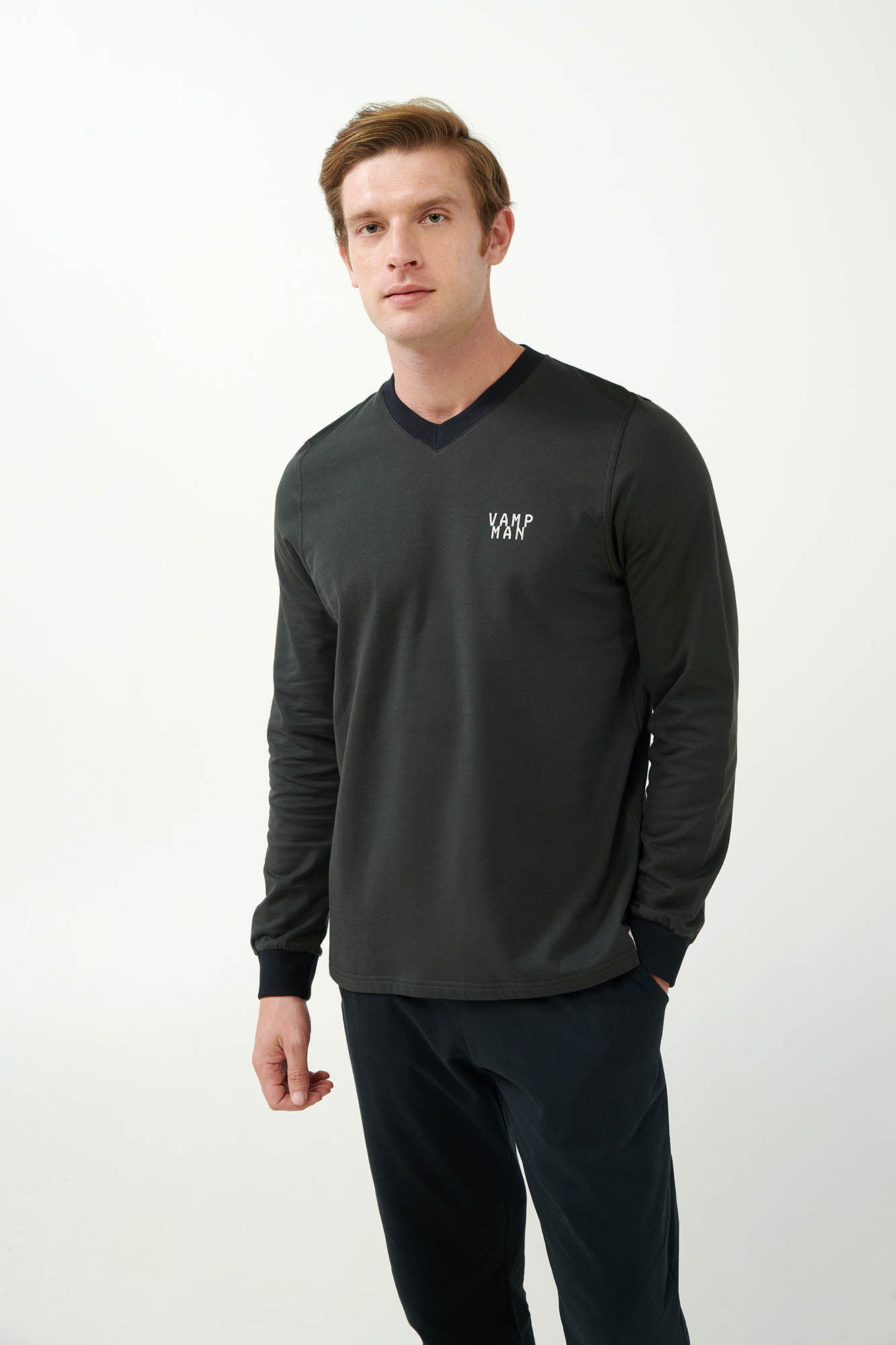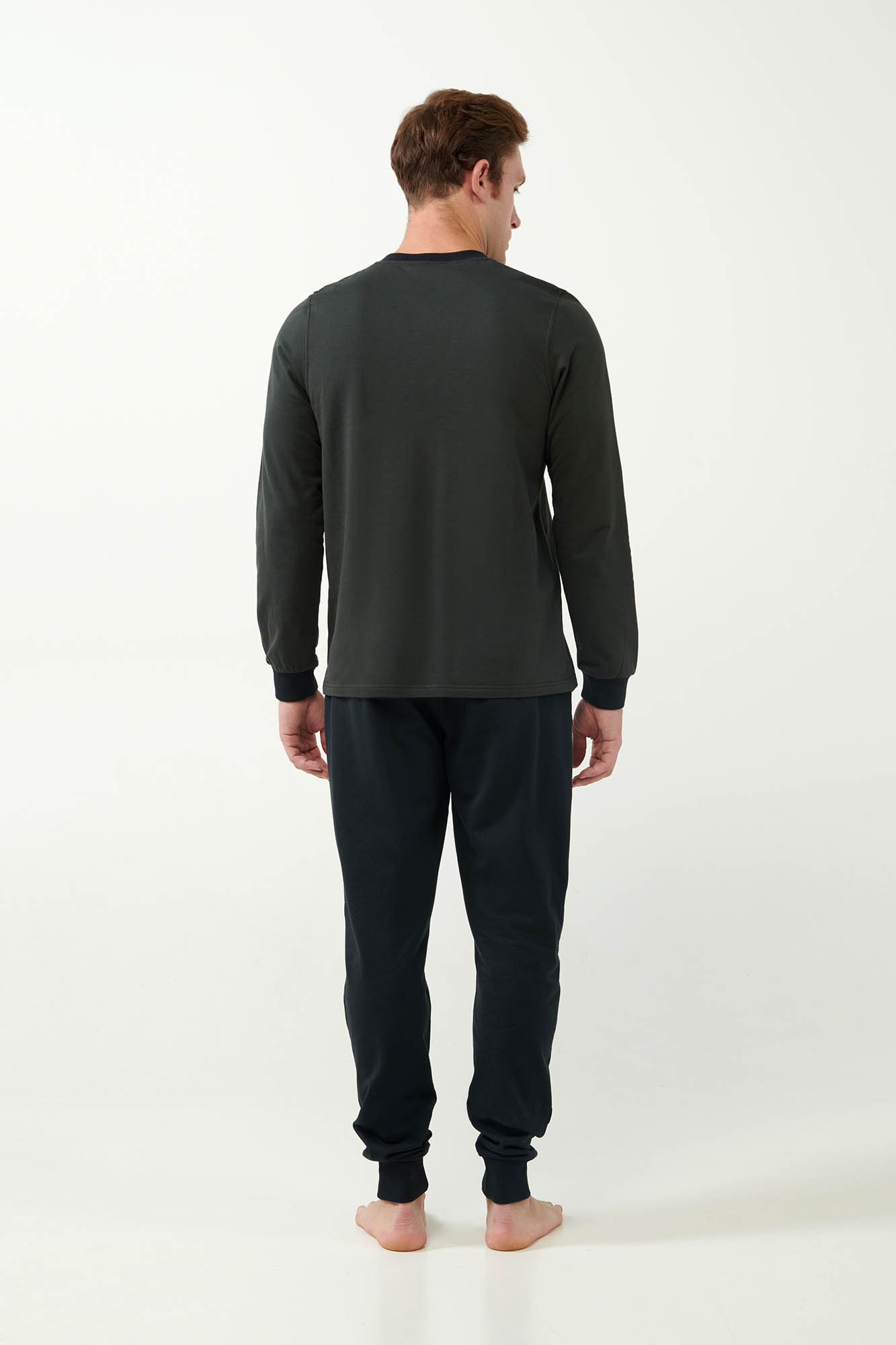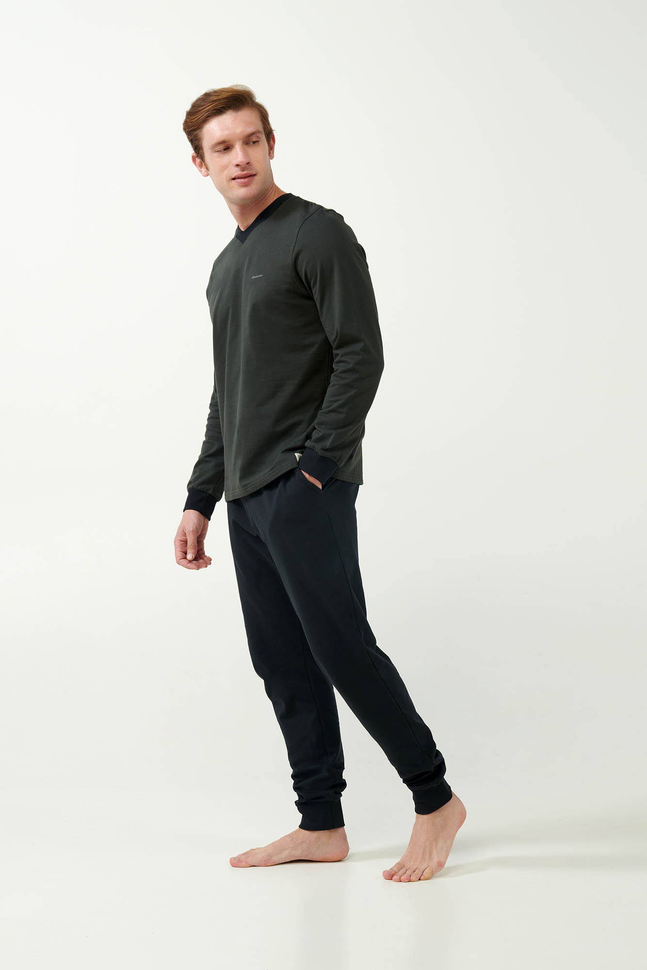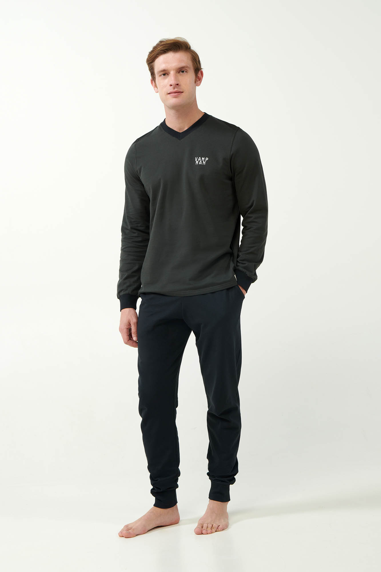 Επιλέξτε μια ανδρική φόρμα σπιτιού κατασκευασμένη από 100% βαμβάκι φούτερ που επιτρέπει στο δέρμα να αναπνέει, χαρίζοντας απαλή και ζεστή αίσθηση στο σώμα. Μπλούζα με μανσέτες και λαιμόκοψη V που συνοδεύεται από ένα μονόχρωμο παντελόνι με μανσέτες και πρακτικές τσέπες στο πλάι. Μια επιλογή με ελαφρώς αθλητικό χαρακτήρα που θα σας βοηθήσει να ένα απόγευμα στον καναπέ ή ένα χαλαρό πρωινό Κυριακής.