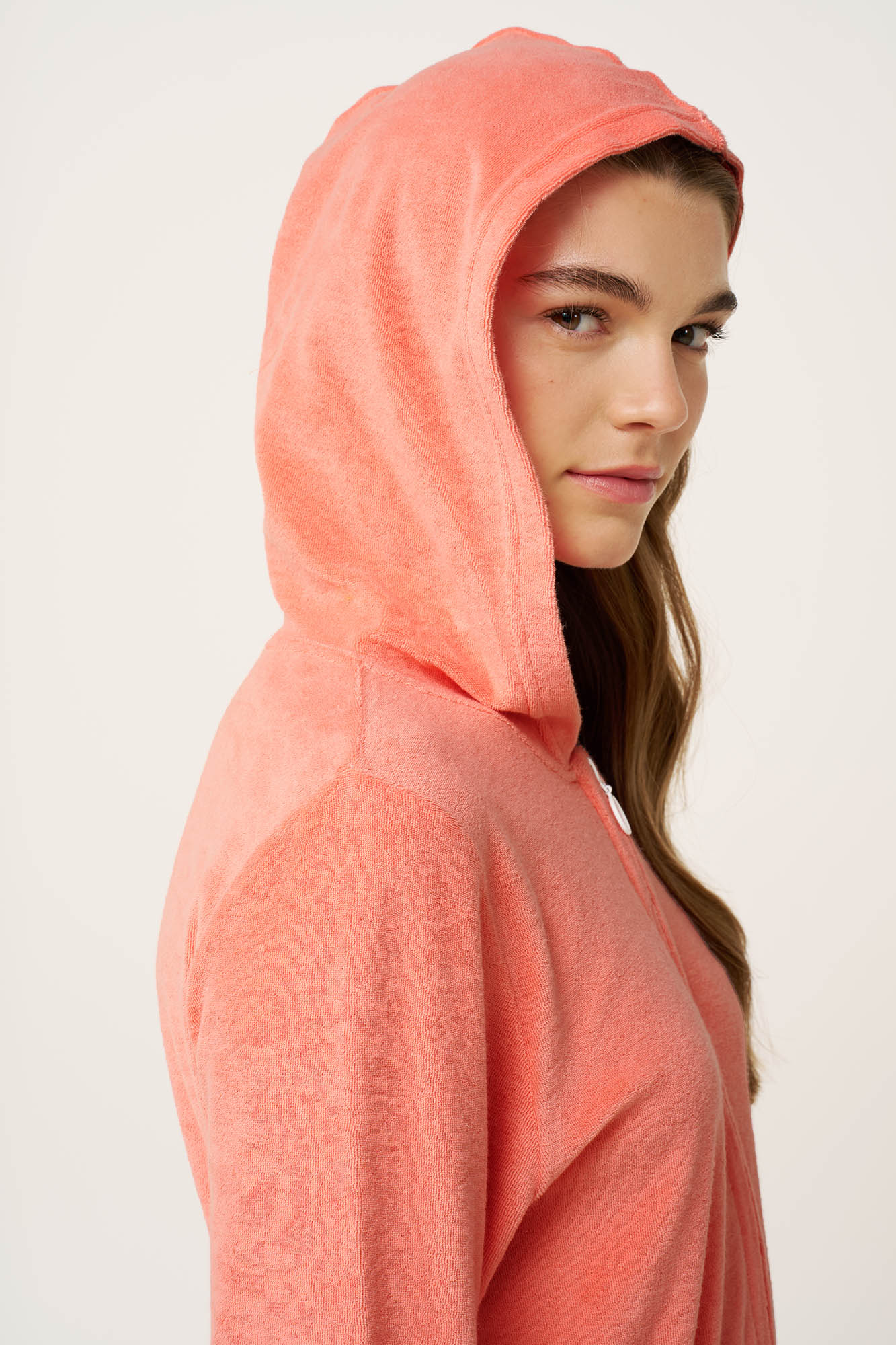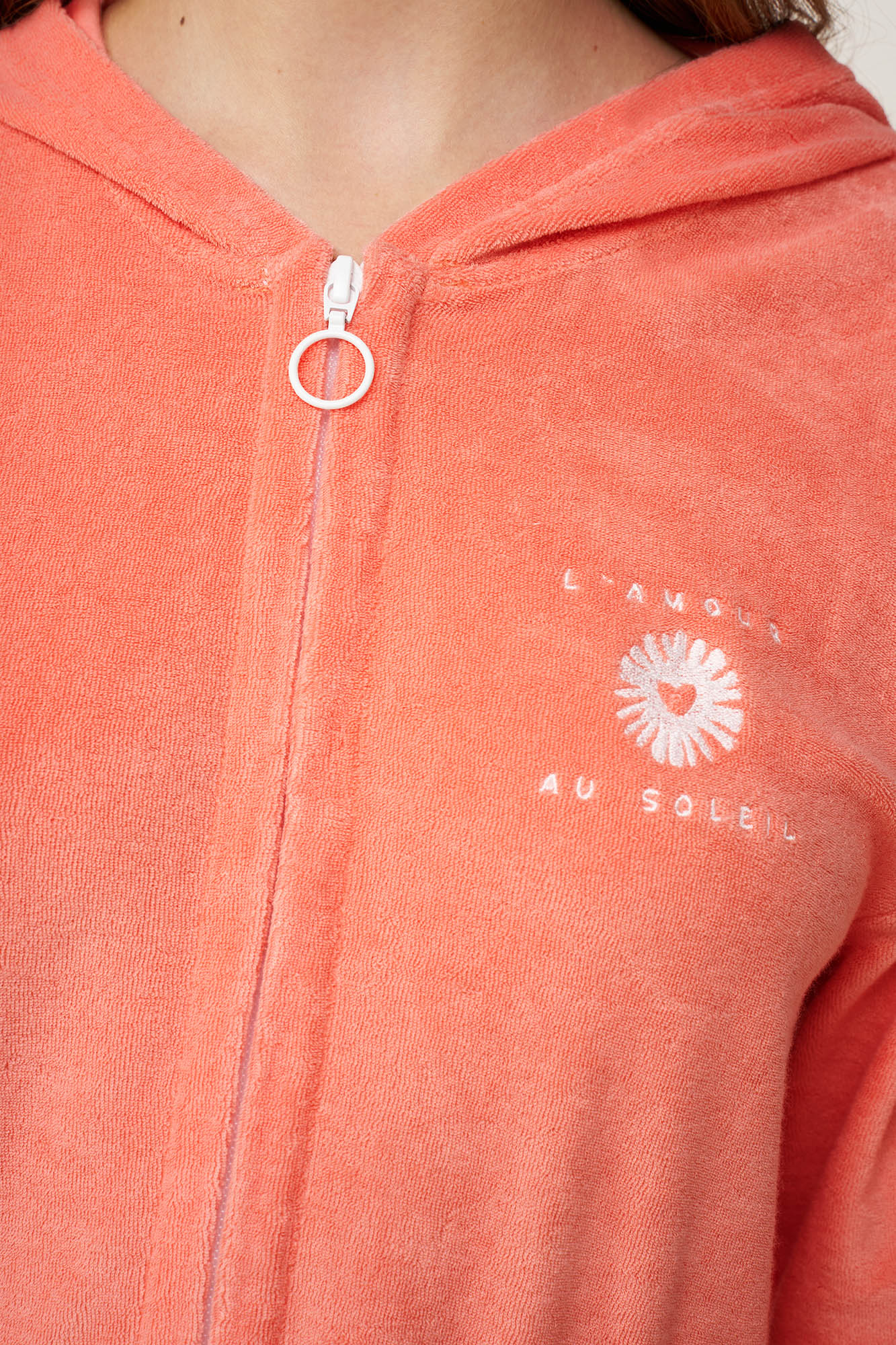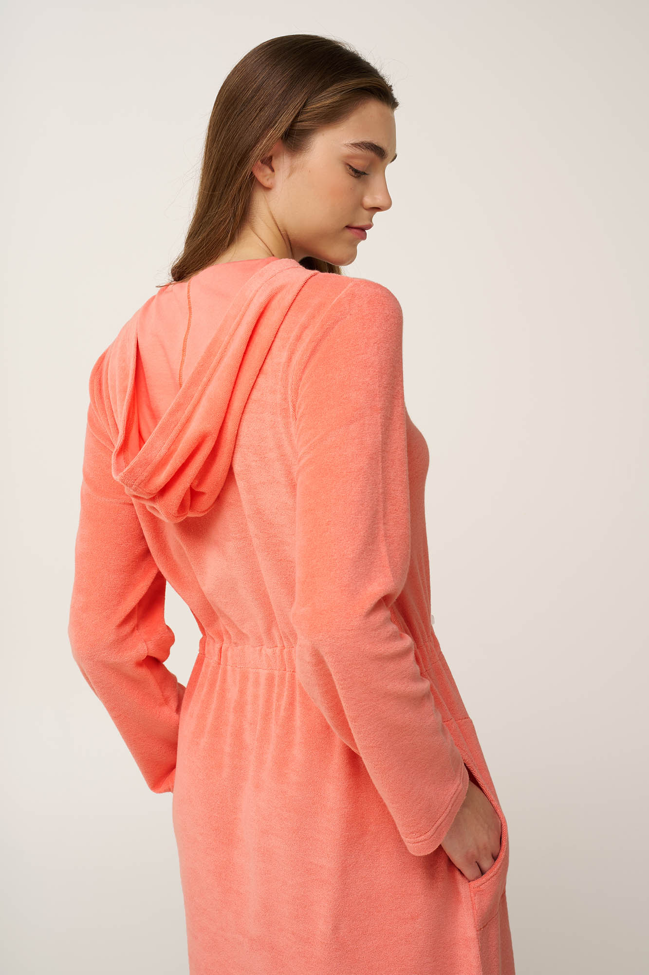 Προσθέστε στις αποσκευές σας ένα καλοκαιρινό φόρεμα από απαλό frottee ύφασμα με υψηλή περιεκτικότητα σε βαμβάκι. Σχεδιασμένο με κουκούλα και πρακτικές πλαϊνές τσέπες, κλείνει μπροστά με φερμουάρ και εφαρμογή που προσαρμόζετε στη μέση θα σας αγκαλιάσει με άνεση και απορροφητικότητα. Η φρέσκια του απόχρωση αποπνέει τη ζεστασιά του ήλιου και τα φρούτα της εποχής, ώστε να απολαύσετε κάθε σας στιγμή στη θάλασσα ή μια ήρεμη καλοκαιρινή βόλτα.