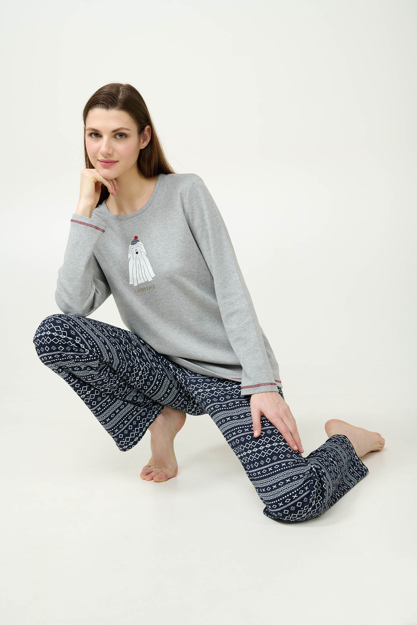 Ανακαλύψτε την απόλυτη άνεση με αυτές τις χειμερινές γυναικείες πυτζάμες, φτιαγμένες από 100% απαλό και διαπνέον βαμβάκι interlock. Το σετ περιλαμβάνει ένα ζεστό τοπ με μακριά μανίκια και ένα χαριτωμένο τύπωμα στο στήθος, που συνδυάζεται με μακρύ παντελόνι σε γεωμετρικό σχέδιο εμπνευσμένο από σκανδιναβικό μοτίβο. Ιδανικές για χαλάρωση στο σπίτι ή για ύπνο, αυτές οι πυτζάμες συνδυάζουν χαρούμενη γοητεία με καθημερινή άνεση.