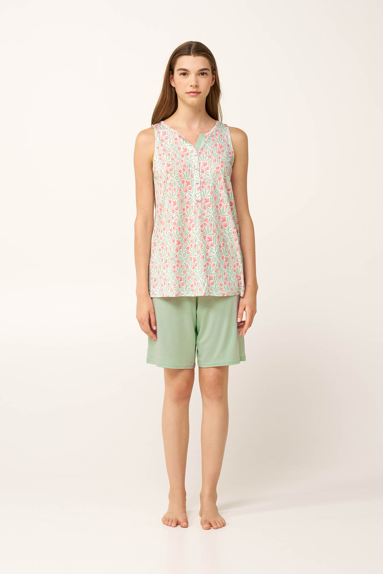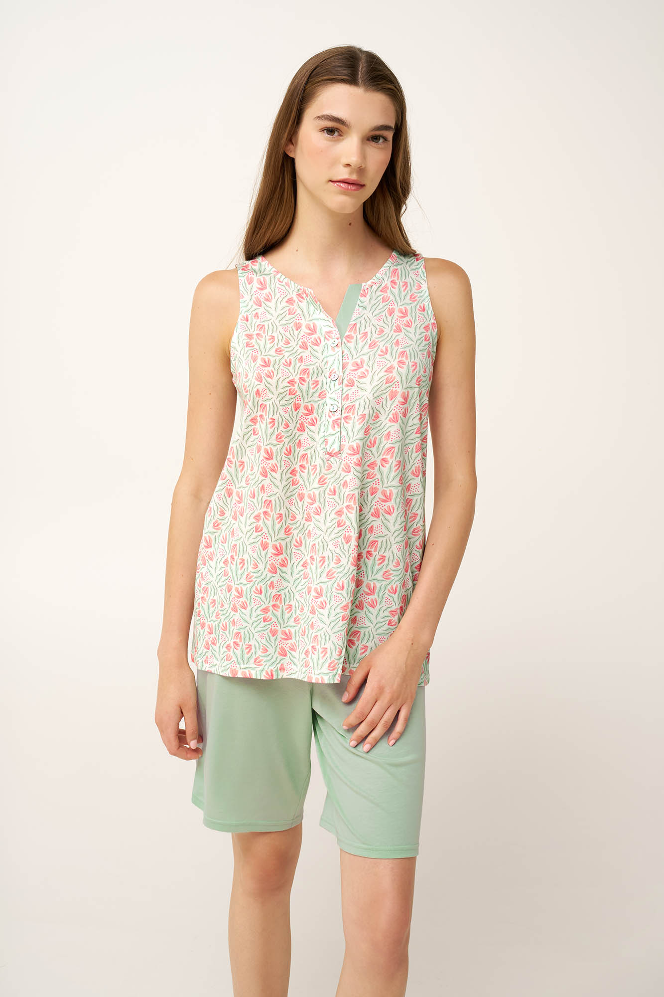 Επιλέξτε αυτό το σετ γυναικείες πυτζάμες, κατασκευασμένο από cotton-modal  που χαρίζει φρεσκάδα και καλοκαιρινή αίσθηση κάθε στιγμή της ημέρας. Το διαπνέον και δροσερό ύφασμα αγκαλιάζει απαλά το σώμα, προσφέροντας άνεση από το βράδυ έως το πρωί. Είναι σχεδιασμένο με πατιλέτα, με διακριτικό φλοράλ μοτίβο εμπνευσμένο από ροζ άνθη και φυσικές πράσινες αποχρώσεις. Ένα μονόχρωμο κοντό παντελόνι ολοκληρώνει το σύνολο που θα απολαύσετε όλο το καλοκαίρι.