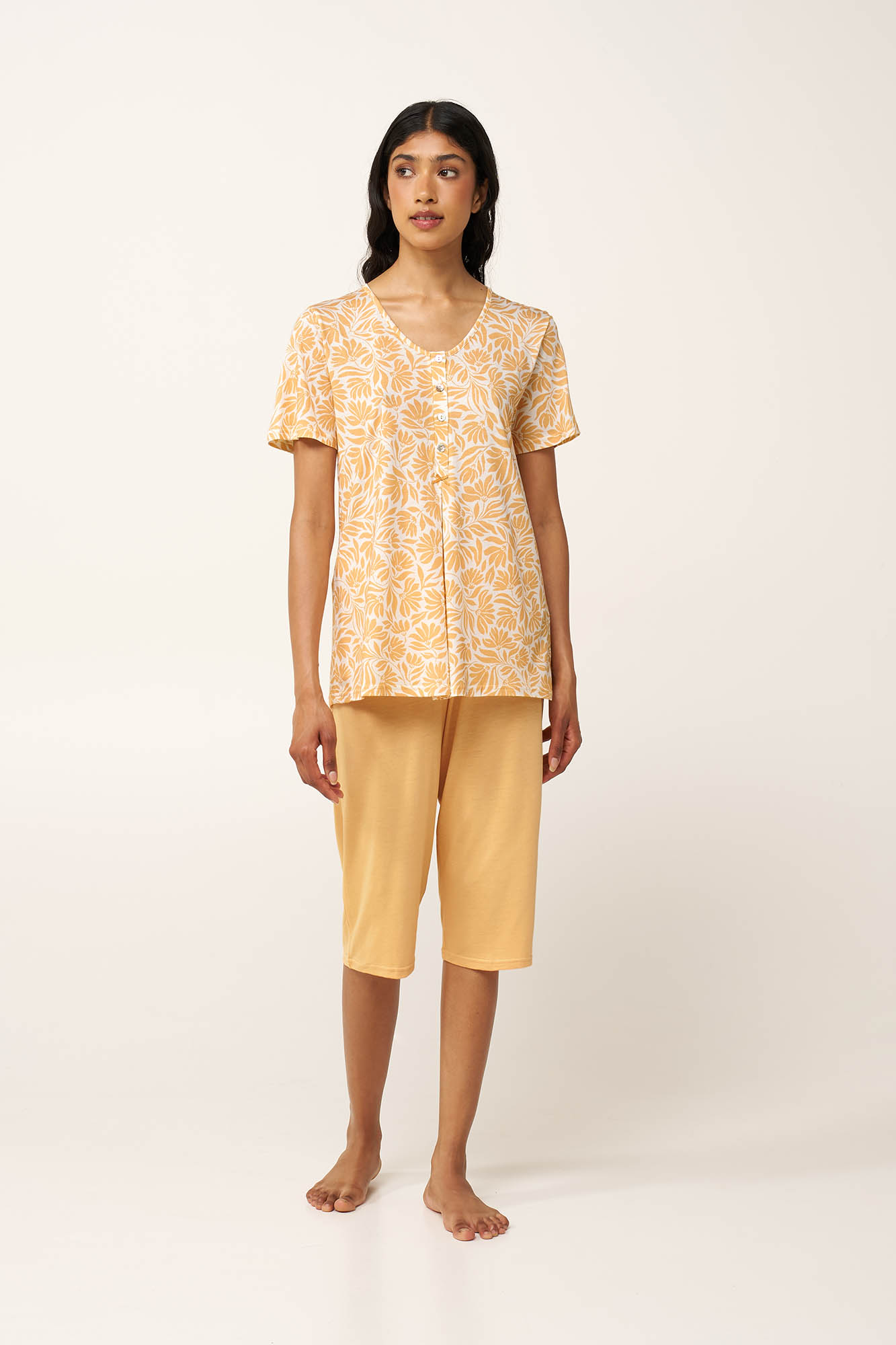 Επιλέξτε ένα άνετο καλοκαιρινό σετ γυναικείες πυτζάμες, κατασκευασμένο από απαλό και διαπνέον μείγμα βαμβακιού και modal. Αποτελείται από τοπ με φλοράλ μοτίβο σε κίτρινες αποχρώσεις, εμπνευσμένο από ηλιόλουστους καλοκαιρινούς κήπους και είναι σχεδιασμένο με πατιλέτα και πιέτα που χαρίζει ακόμα πιο χαλαρή εφαρμογή. Συνοδεύεται από μονόχρωμο κάπρι παντελόνι. Ένα σετ πυτζάμες ιδανικό για νέες και μέλλουσες μητέρες που θα χαρίσει άνεση και πρακτικότητα κάθε στιγμή της ημέρας.