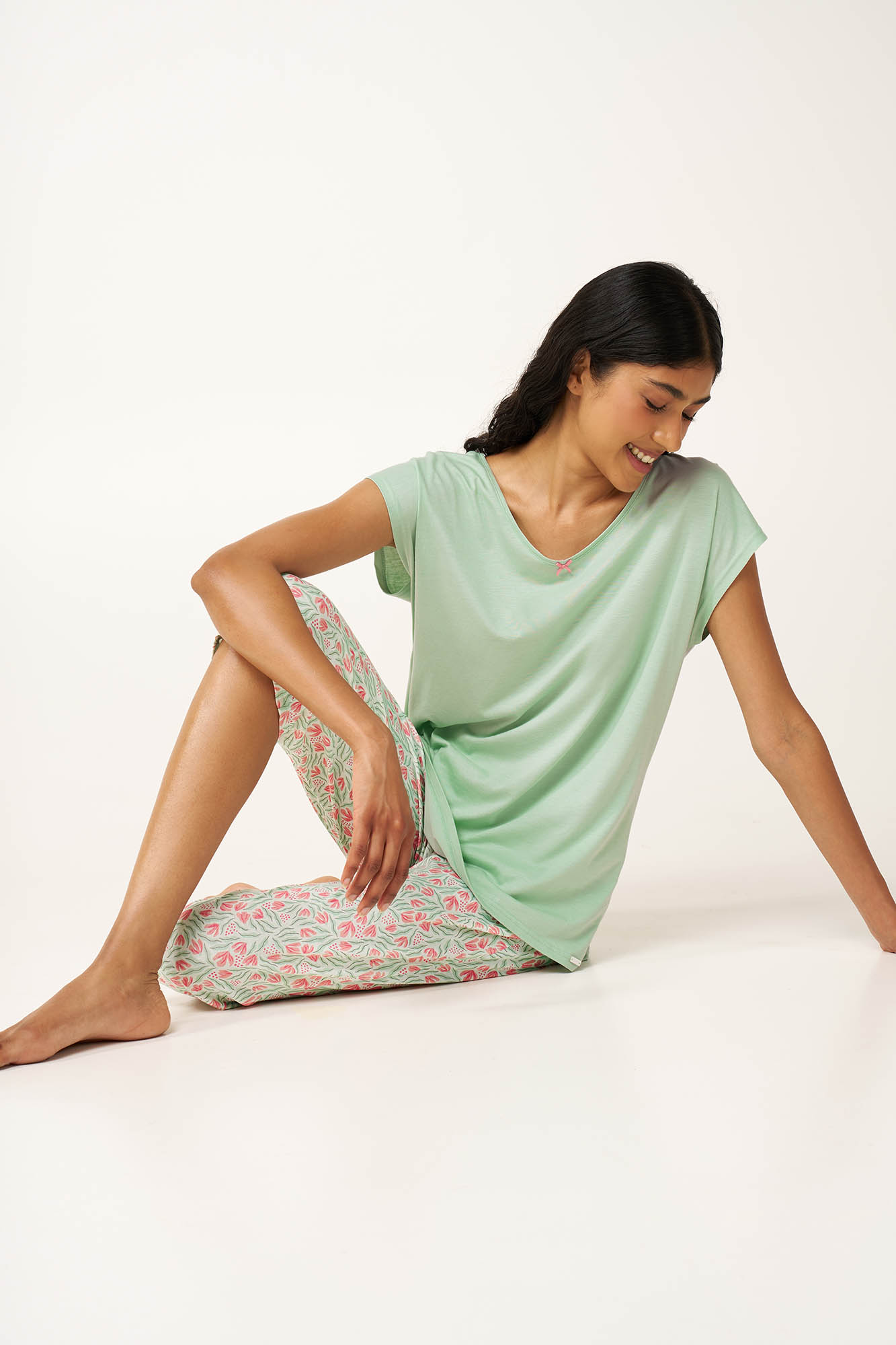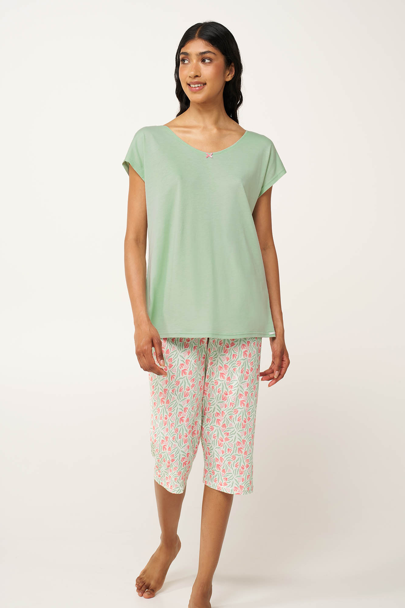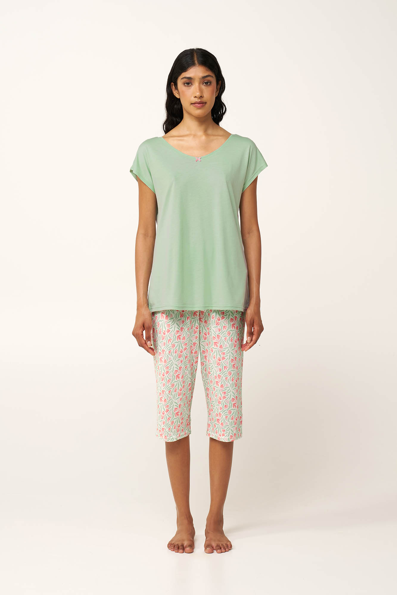 Σχεδιασμένη απολαυστικές καλοκαιρινές νύχτες, αυτή η γυναικεία πυτζάμα από cotton-modal συνδυάζει άνεση και φρεσκάδα. Το σετ αποτελείται από μονόχρωμο κοντομάνικο τοπ και κάπρι παντελόνι, διακοσμημένο με απαλό φλοράλ μοτίβο εμπνευσμένο από ανθισμένα λιβάδια και καλοκαιρινή βλάστηση. Ελαφρύ και δροσερό, με χαλαρή εφαρμογή, αποπνέει φυσικότητα και άνεση κάθε στιγμή της ημέρας.