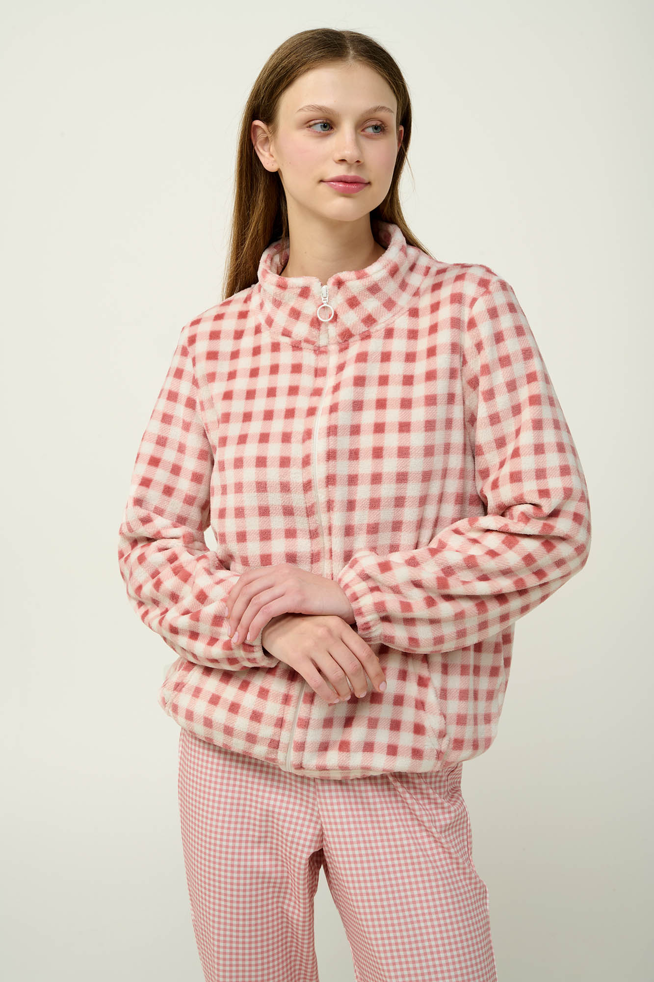 Αυτή η γυναικεία ρόμπα σε διακριτικό ροζ καρό μοτίβο είναι ιδανική για τις κρύες μέρες του χειμώνα. Κατασκευασμένη από μαλακό fleece, προσφέρει απαλή και ζεστή αίσθηση στο δέρμα που διαρκεί όλη την ημέρα. Κλείνει με φερμουάρ, ενώ οι δύο μπροστινές τσέπες προσθέτουν άνεση και πρακτικότητα, κρατώντας τα χέρια σας ζεστά ή αποθηκεύοντας μικρά προσωπικά αντικείμενα. Ιδανική για να τη φορέσετε πάνω από τις αγαπημένες σας πυτζάμες για να απολαύσετε ένα ήρεμο πρωινό ή ένα χαλαρό απόγευμα.