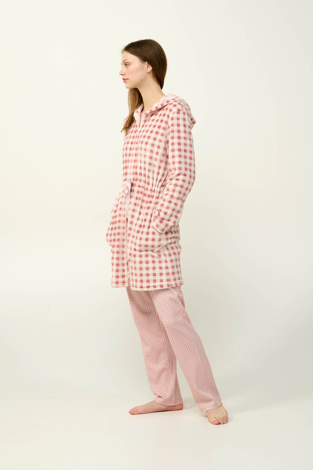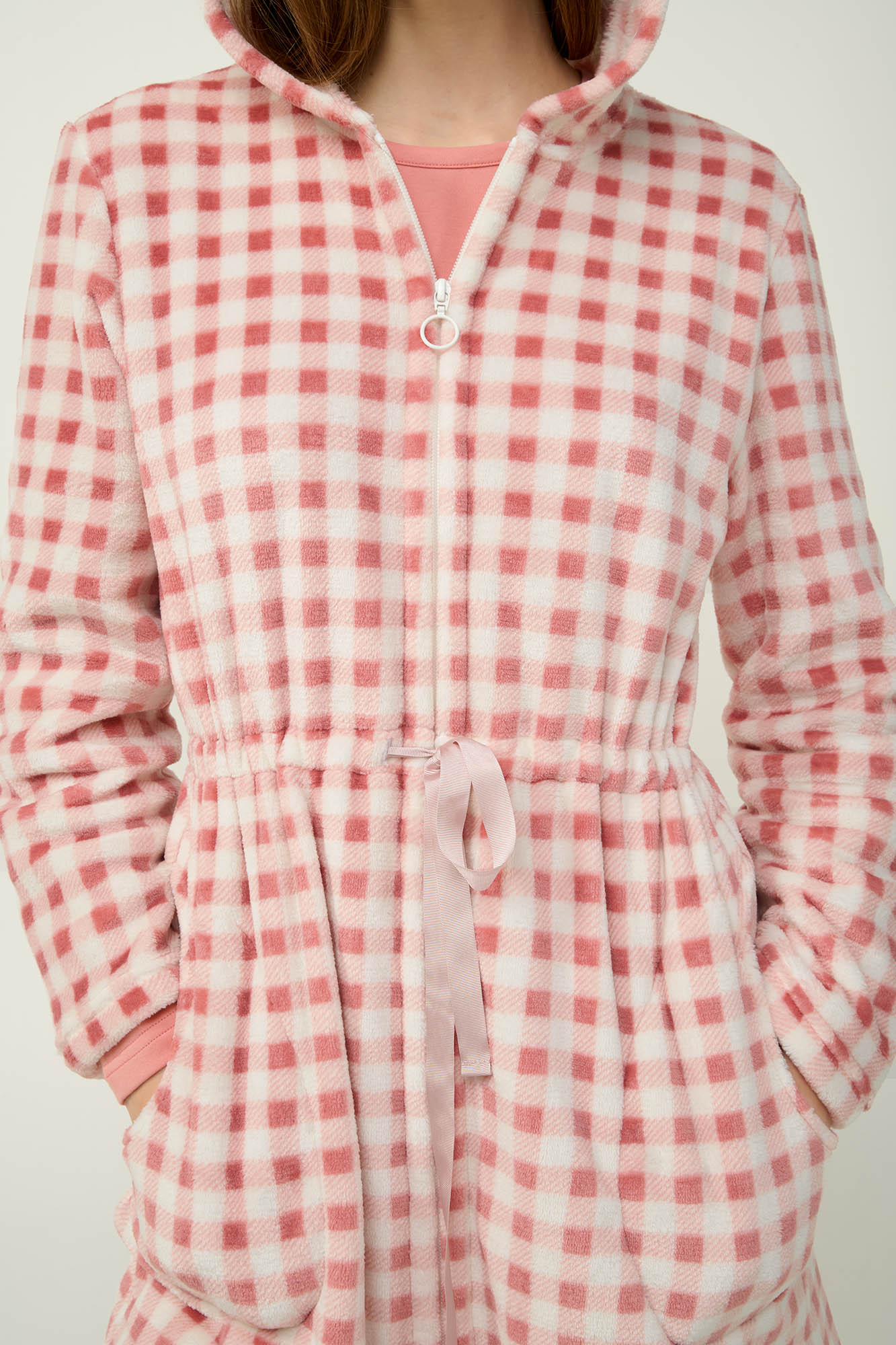 Αγκαλιάστε την απαλότητα που χαρίζει αυτή η γυναικεία ρόμπα σε γοητευτικό ροζ καρό μοτίβο. Είναι σχεδιασμένη με κουκούλα, πλαϊνές τσέπες και κλείνει μπροστά με φερμουάρ συνδικάζοντας πρακτικότητα και άνεση με ευκολία. Το απαλό fleece ύφασμα προσφέρει μια άνετη και ζεστή αίσθηση, κάνοντας τη ρόμπα ιδανική για να φορεθεί πάνω από τις αγαπημένες σας πυτζάμες.