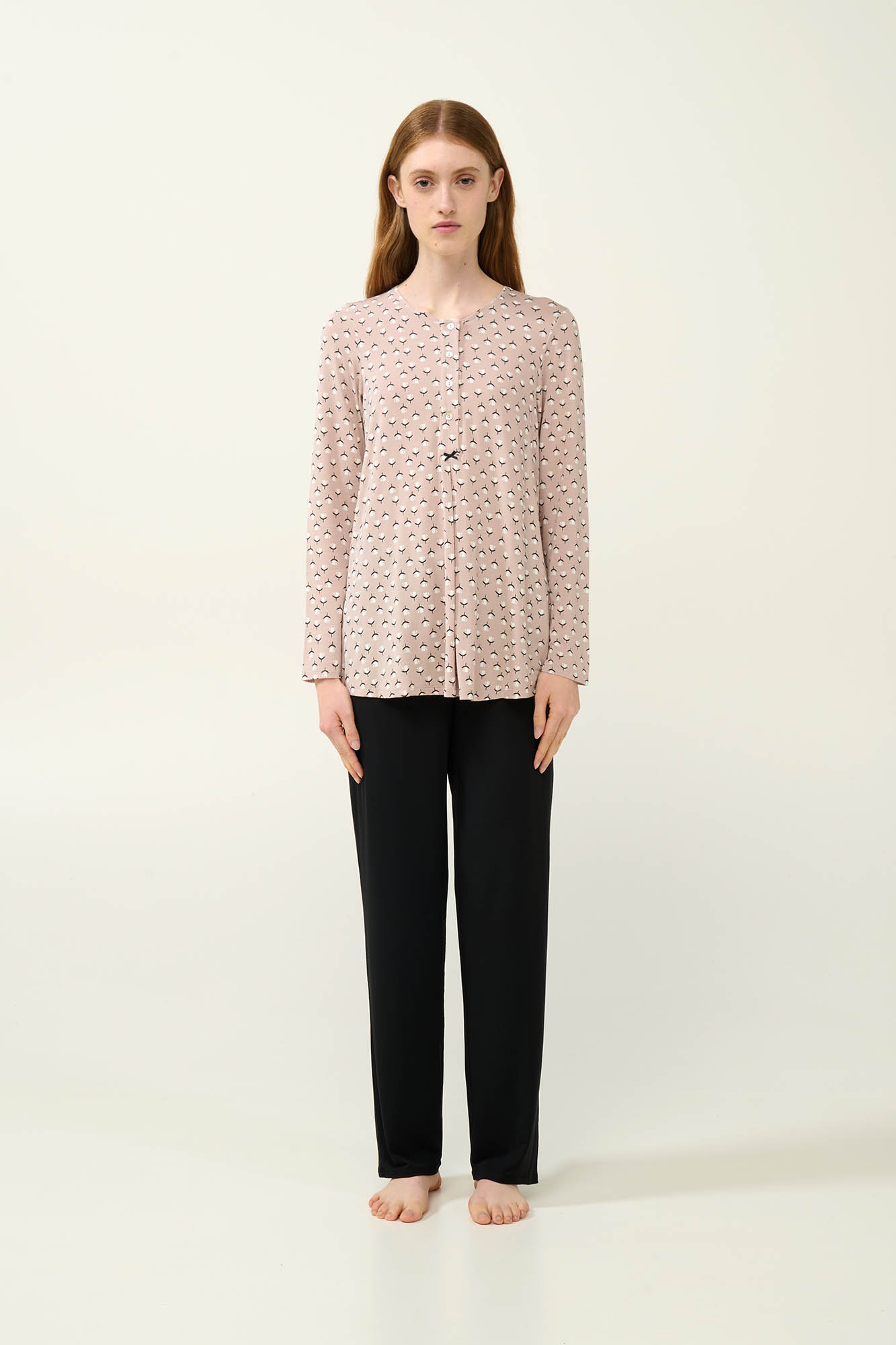 Αφεθείτε στη ρομαντική κομψότητα που χαρίζει αυτό το σετ χειμερινές γυναικείες πυτζάμες από διαπνέον LENZING Tencel Modal Micro που αφήνει μια υπέροχα, απαλή αίσθηση στο δέρμα. Το πάνω μέρος είναι διακομισμένο με ένα διακριτικό μίνιμαλ, φλοράλ μοτίβο και σχεδιασμένο με πρακτική πατιλέτα και πιέτα στη περιοχή της κοιλιάς για μέγιστη άνεση. Συνδυάζεται με μονόχρωμο παντελόνι που δημιουργεί μια αρμονική αντίθεση. Απολαύστε ένα ήρεμο απόγευμα στο καναπέ ή το βραδινό σας ύπνο.
