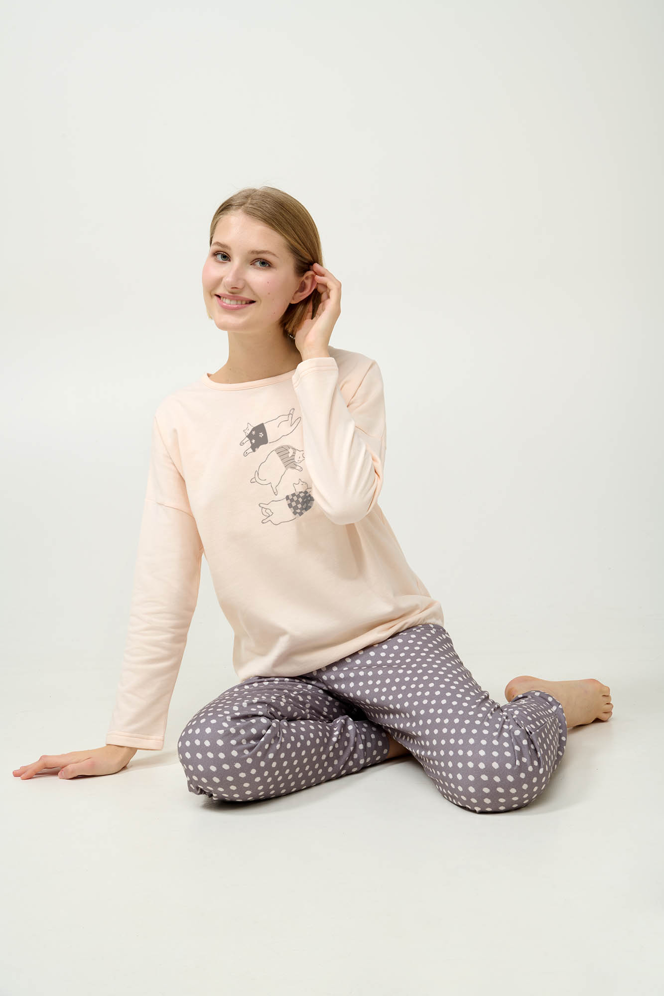 Επιλέξτε ένα σετ χειμερινές γυναικείες πυτζάμες, φτιαγμένο από 100% απαλό και ζεστό φούτερ βαμβάκι. Το πάνω μέρος διαθέτει μακριά μανίκια, ελαστική μέση για άνετη εφαρμογή και ένα χαριτωμένοτύπωμα με έναν νωχελικό γάτο στο στήθος που προσθέτει μια παιχνιδιάρικη νότα στο σύνολο. Συνδυάζεται με παντελόνι με μανσέτες σε πουά μοτίβο, προσφέροντας έναν τέλειο συνδυασμό άνεσης και στυλ.