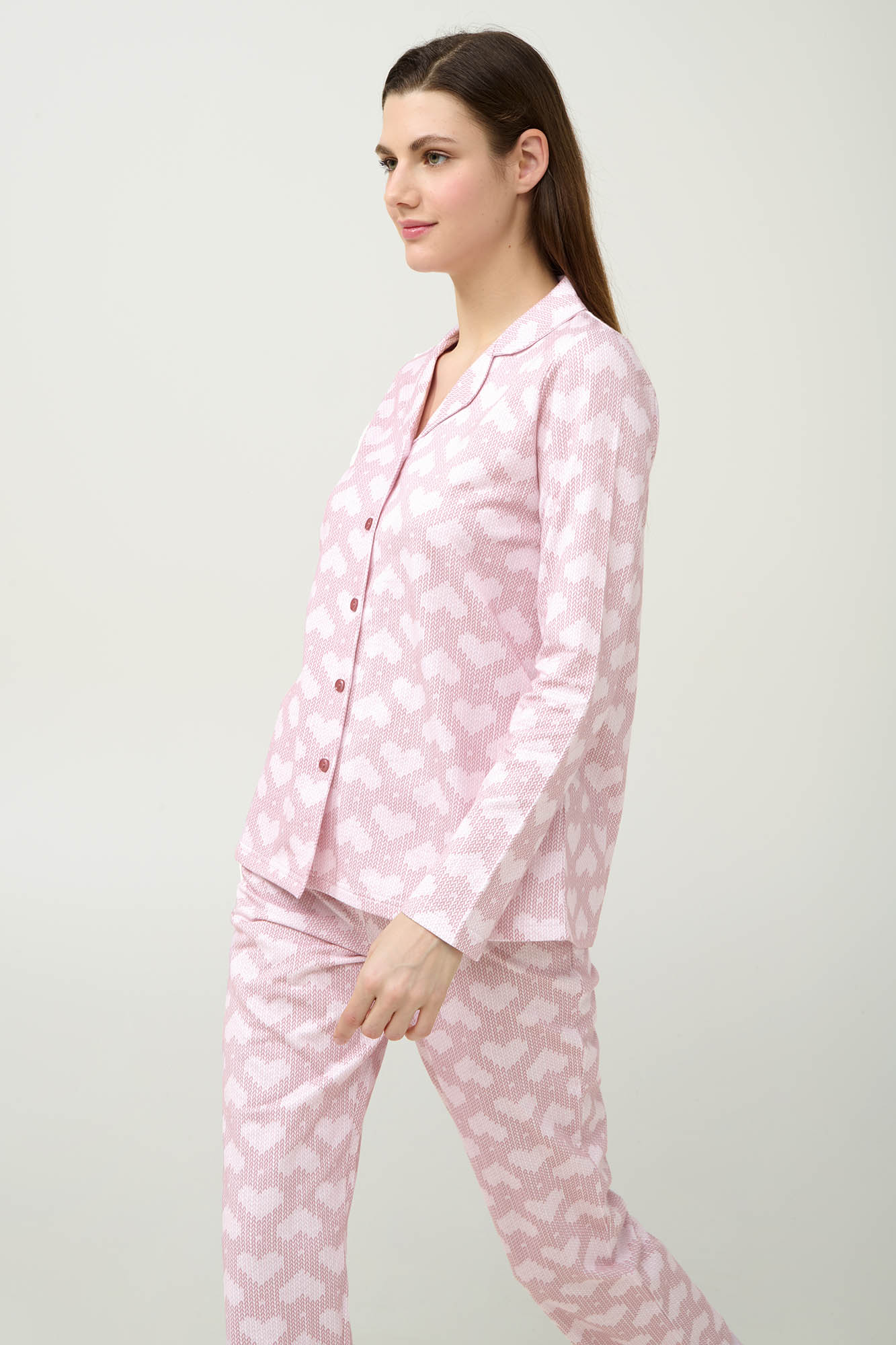 Επιλέξτε για τις κρύες ημέρες του χειμώνα ένα σετ γυναικείες πυτζάμες, κατασκευασμένες από 100% βαμβάκι φούτερ που χαρίζει απαλή και ζεστή αίσθηση στο σώμα. Σχεδιασμένο με διαχρονικό pied de poule μοτίβο που σχηματίζει καρδιές και κλασικό κουμπωτό πάνω μέρος συνδυάζει διαχρονική κομψότητα με μια νότα ρομαντισμού. Μια ιδανική προσθήκη στη συλλογή που θα απολαύσετε γυρίζοντας σπίτι μετά από μια μεγάλη ημέρα.