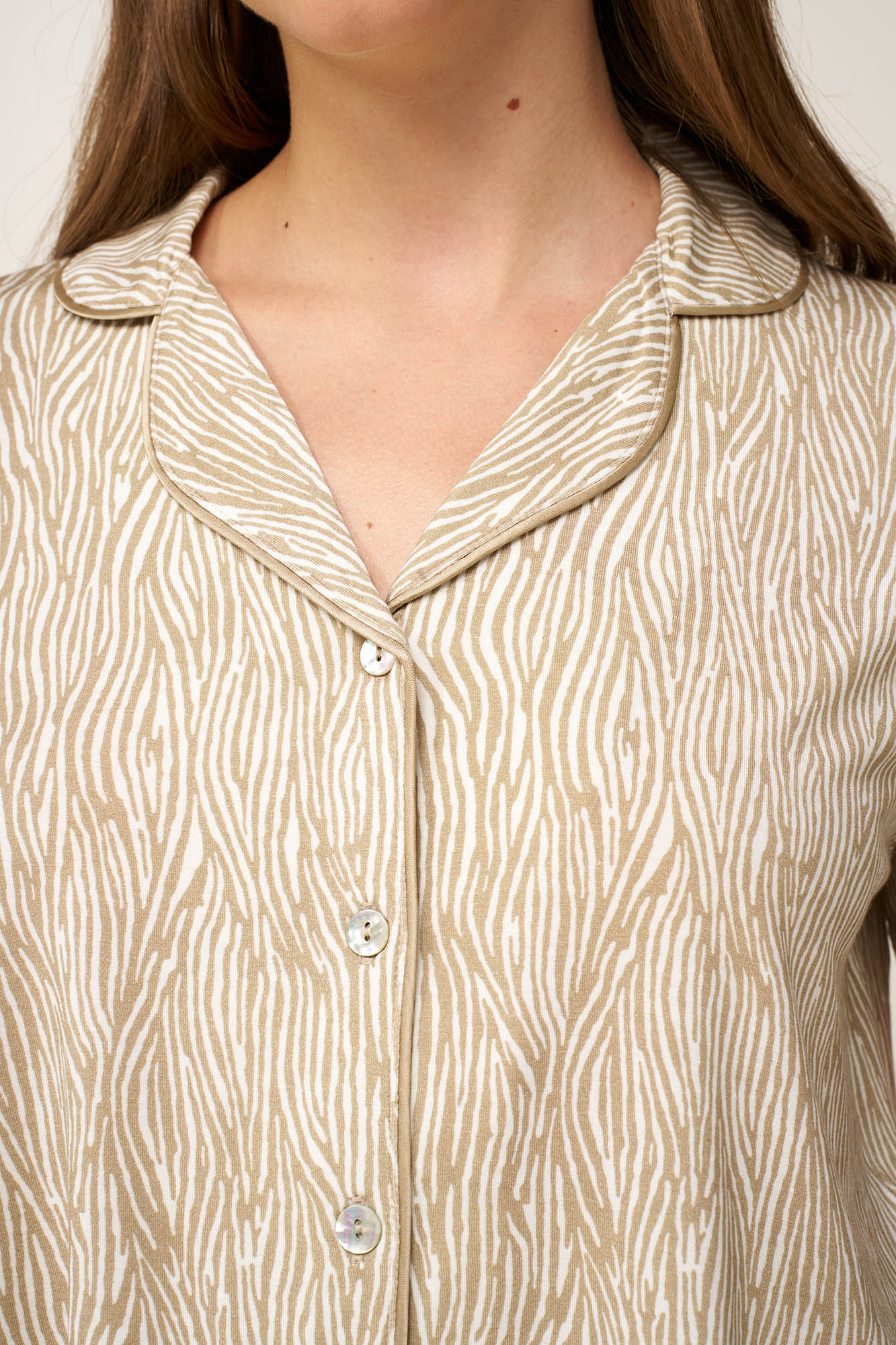 Ανακαλύψτε τον ιδανικό συνδυασμό άνεσης και γοητείας με αυτές τις καλοκαιρινές γυναικείες πυτζάμες με ζέβρα μοτίβο, κατασκευασμένες από εξαιρετικά απαλό και διαπνέον LENZING Tencel Modal Micro και elastane. Το κλασικό κουμπωτό πάνω μέρος με κοντά μανίκια, συνδυάζεται αρμονικά με ένα άνετο κοντό παντελόνι , για να προσφέρει ευχάριστη αίσθηση, δροσερή αίσθηση τις ζεστές καλοκαιρινές νύχτες.