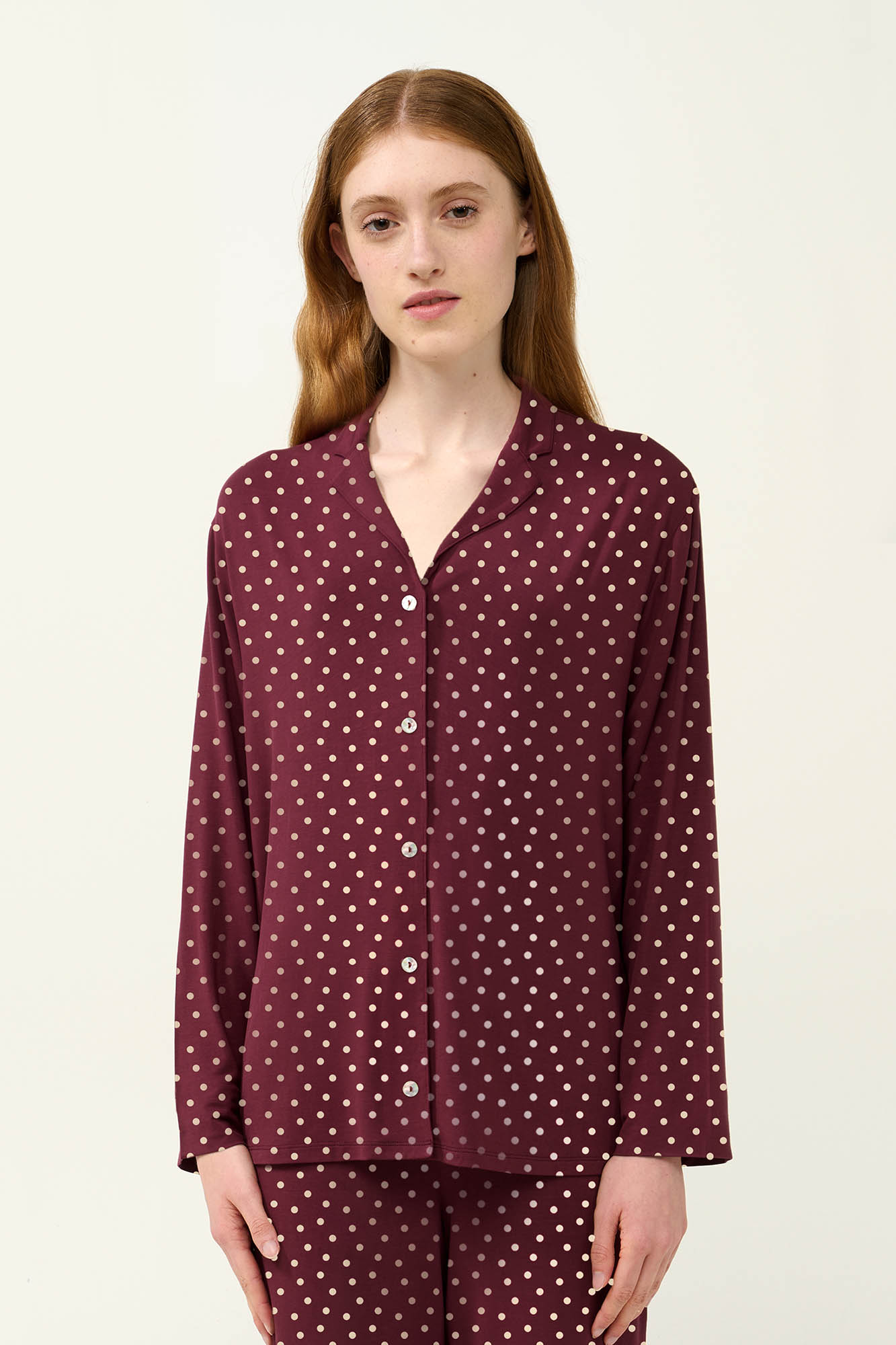 Επιλέξτε ένα σετ γυναικείες πυτζάμες που προσφέρει διαχρονική κομψότητα και αίσθηση απαλότητας. Κατασκευασμένο από LENZING Tencel Modal Micro, αγκαλιάζει ευχάριστα το σώμα ενώ επιτρέπει στο δέρμα να αναπνέει. Είναι διακοσμημένο με κλασικό μπεζ πουά μοτίβο σε μοβ φόντο, και το τοπ είναι σχεδιασμένο με κλασικό κουμπωτό μπροστά μέρος. Ένα ιδανικό σετ για να απολαύσετε ένα όμορφο απόγευμα ή το βραδινό σας ύπνο.