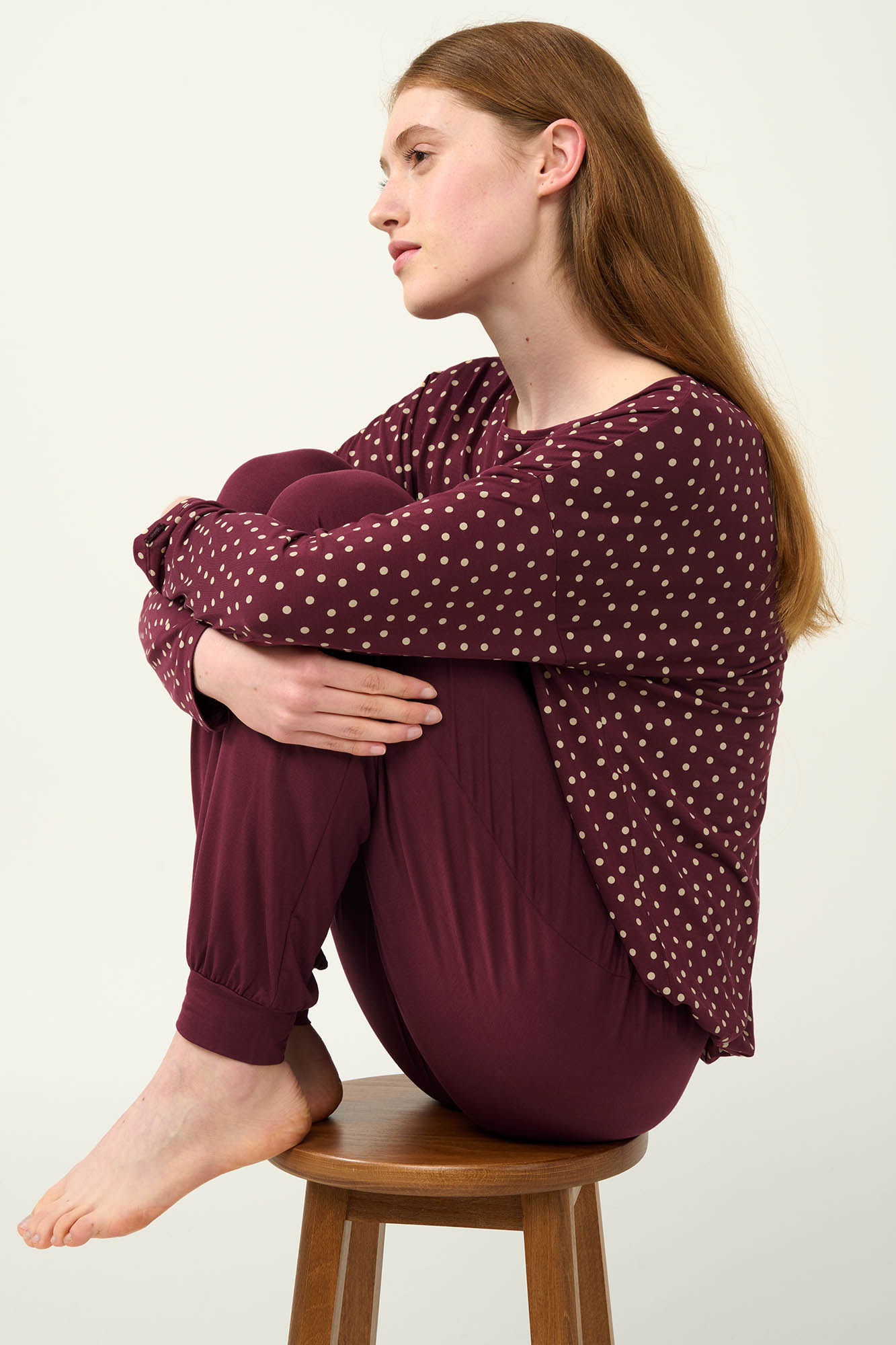 Αφεθείτε στην άνεση και τη απαλή υφή που προσφέρει αυτό το σετ γυναικείες χειμερινές πυτζάμες από LENZING Tencel Modal Micro, ένα ύφασμα που αγκαλιάζει ευχάριστα το σώμα. Η μπλούζα διαθέτει λαιμόκοψη χαμόγελο, λάστιχο στη μέση για πιο βέλτιστη εφαρμογή και είναι διακοσμημένη με διαχρονικό μπεζ πουά μοτίβο σε μοβ φόντο. Το σετ συμπληρώνει ένα μονόχρωμο παντελόνι, με μανσέτες στο τελείωμα για άνετη εφαρμογή. Ένα κομψό και πρακτικό σύνολο, ιδανικό για τις χαλαρές στιγμές του χειμώνα.