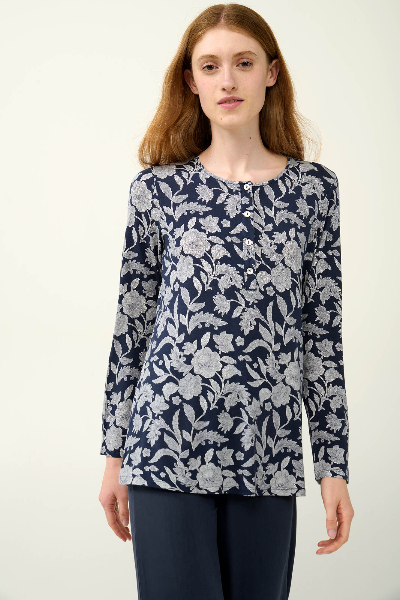 Απολαύστε ένα σετ γυναικείες χειμερινές πυτζάμες, κατασκευασμένες από LENZING Tencel Modal Micro, που αγκαλιάζει ευχάριστα το σώμα. Είναι σχεδιασμένο με πατιλέτα μπροστά και λευκό φλοράλ μοτίβο σε σκούρο φόντο, ενώ το παντελόνι είναι μονόχρωμο για διακριτική ισορροπία στο σύνολο. Ιδανική επιλογή για τις στιγμές χαλάρωσης στο σπίτι ή τον ύπνο.