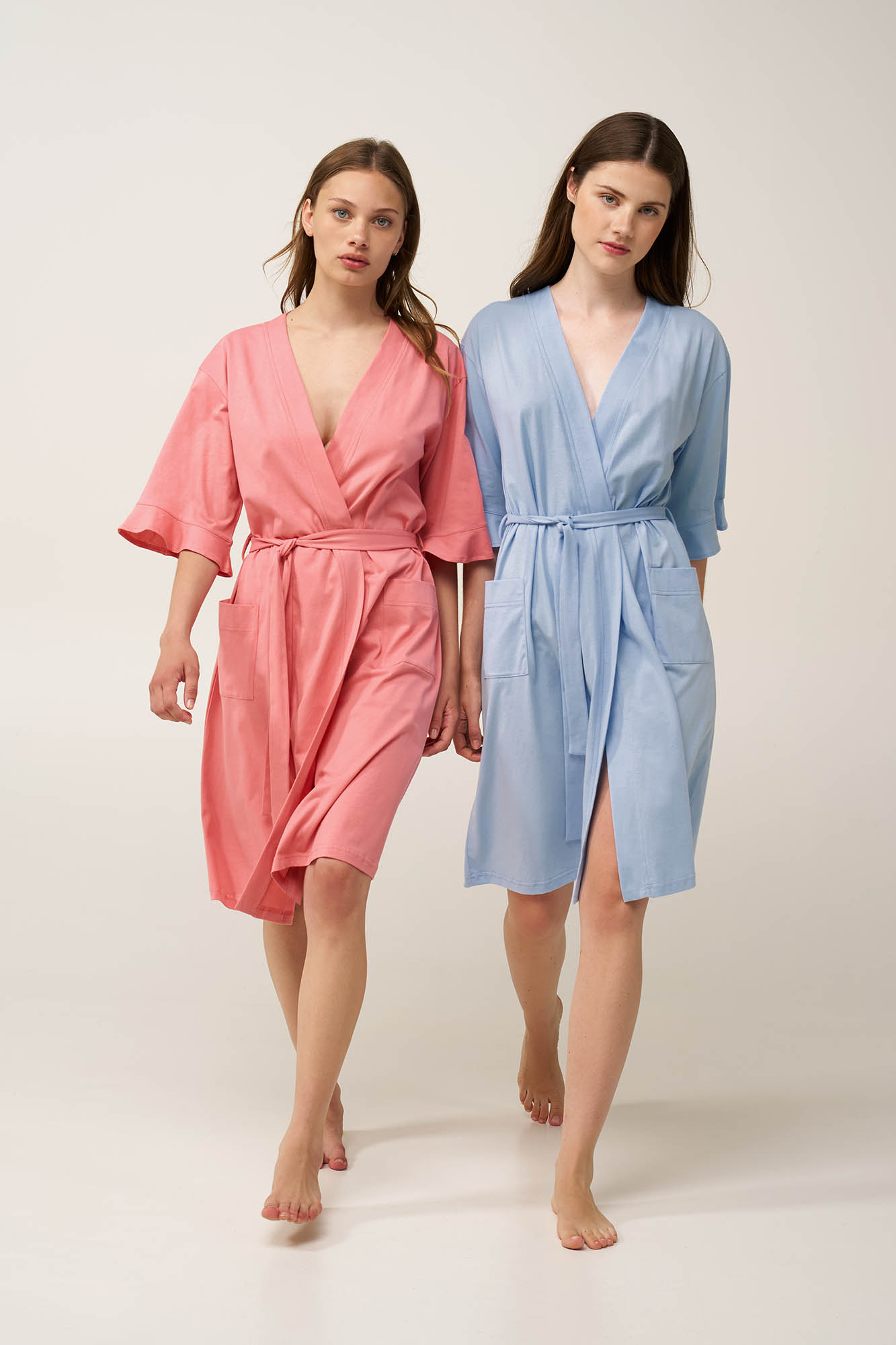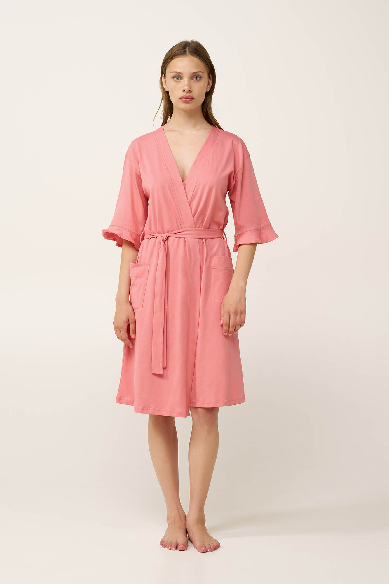 Προσθέστε στη συλλογή σας μια διαχρονική γυναικεία καλοκαιρινή ρόμπα, κατασκευασμένη από απαλό και διαπνέον 100% βαμβάκι single jersey. Σχεδιασμένο σε κλασικό, σταυρωτό πατρόν, με πλαϊνές τσέπες και βολάν στα μανίκια, συνδυάζει πρακτικότητα και διαχρονικό στυλ,. Ελαφριά και χαλαρή, θα φορεθεί πάν από το αγαπημένο σας νυχτικό ένα δροσερό βράδυ στο μπαλκόνι ή στο μαιευτήριο.