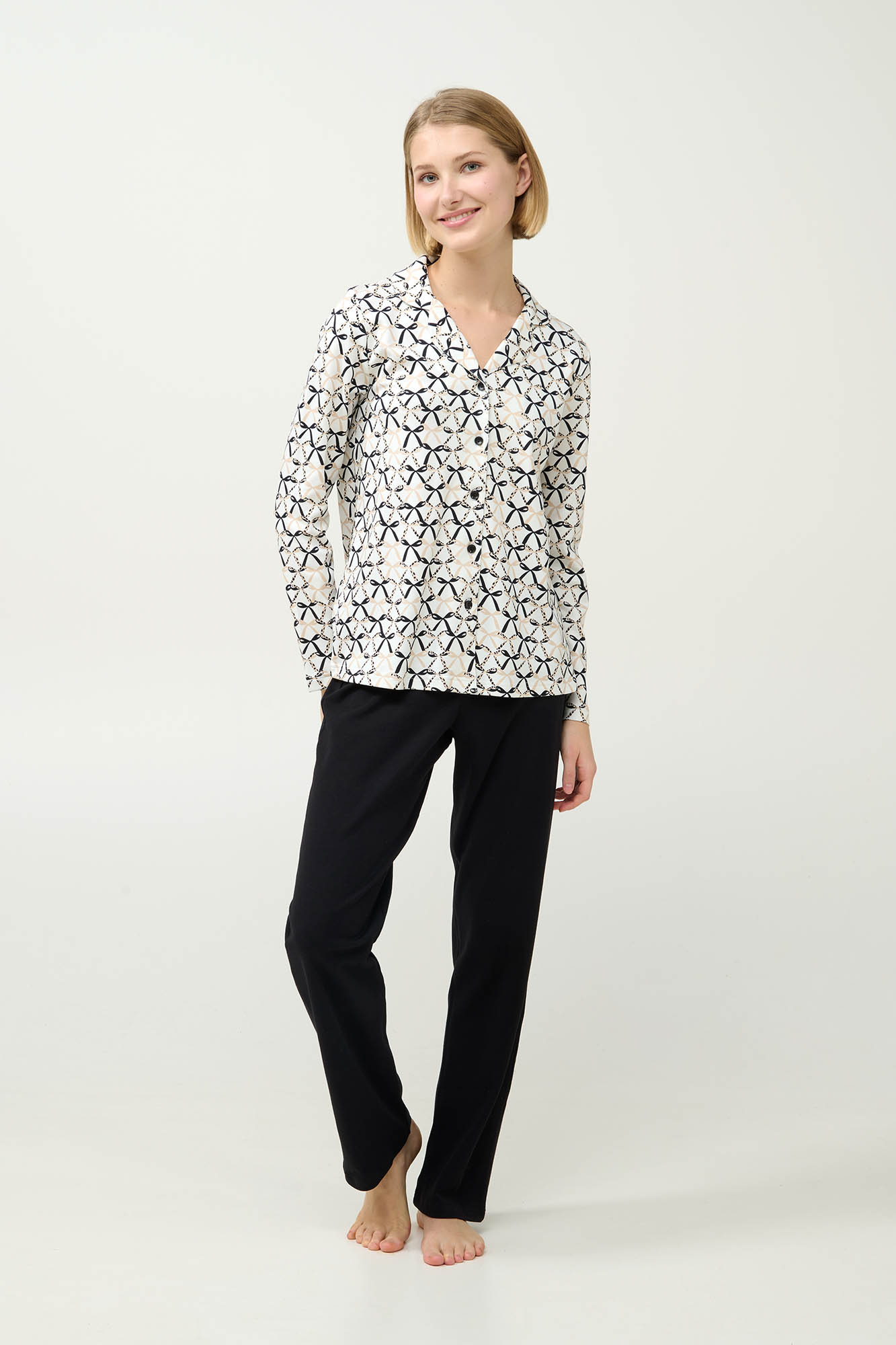 Αυτές οι γυναικείες πυτζάμες είναι φτιαγμένες από απαλό και ανθεκτικό 100% βαμβάκι interlock, προσφέροντας εξαιρετική διαπνοή και άνεση. Το κλασικό κουμπωτό πάνω μέρος διαθέτει κομψό μοτίβο με φιόγκους, προσθέτοντας μια διαχρονική νότα και συνδυάζεται ιδανικά με μονόχρωμο μαύρο παντελόνι, που χαρίζει ισορροπία στο σύνολο. Ιδανικό για στιγμές χαλάρωσης ή ύπνου, αποτελεί μια πρακτική που θα απολαύσετε για χρόνια.
