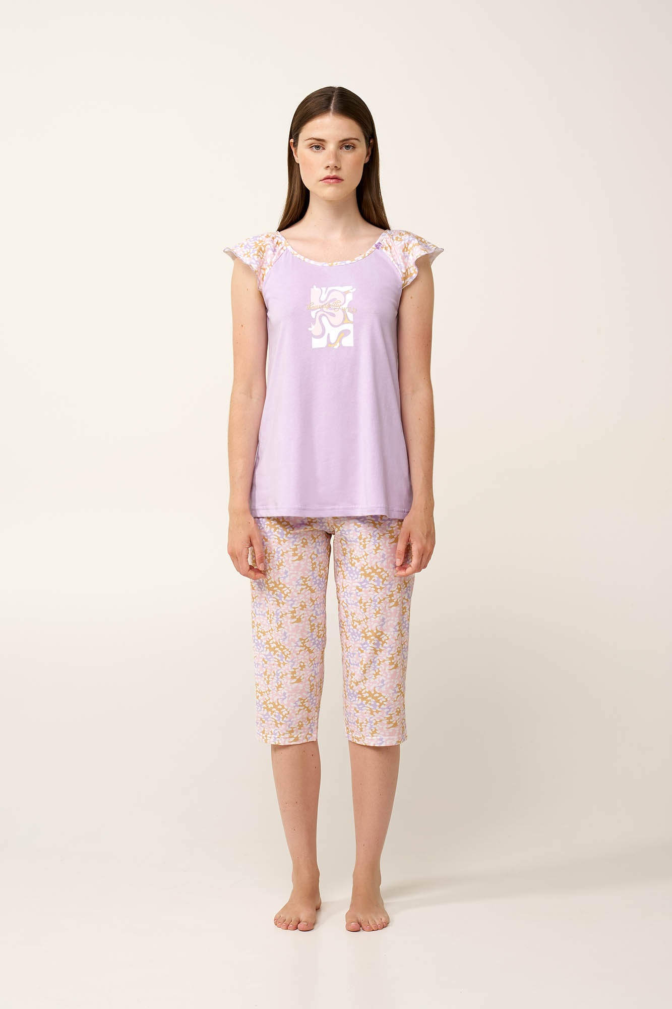 Ανακαλύψτε απόλυτη άνεση με αυτό το γυναικείο σετ πυτζάμες, κατασκευασμένο από απαλό και διαπνέον 100% βαμβακερό single jersey για ελαφριά και ευχάριστη αίσθηση στο σώμα. Το κοντομάνικο τοπ διαθέτει διακριτικά βολάν διακοσμημένα με αφηρημένο παστέλ κολάζ print, που κοσμεί και το ασορτί κάπρι παντελόνι. Σχεδιασμένο με άνετη και χαλαρή εφαρμογή, το σετ προσφέρει δροσιά και ελευθερία κινήσεων, διατηρώντας παράλληλα ένα κομψό και θηλυκό ύφος.