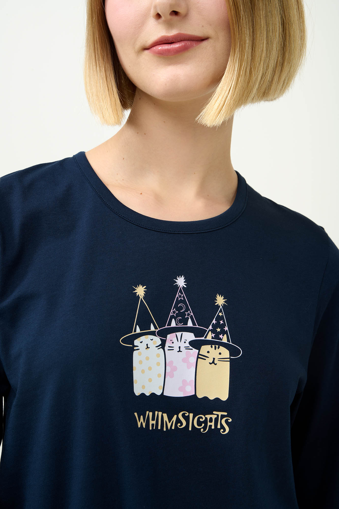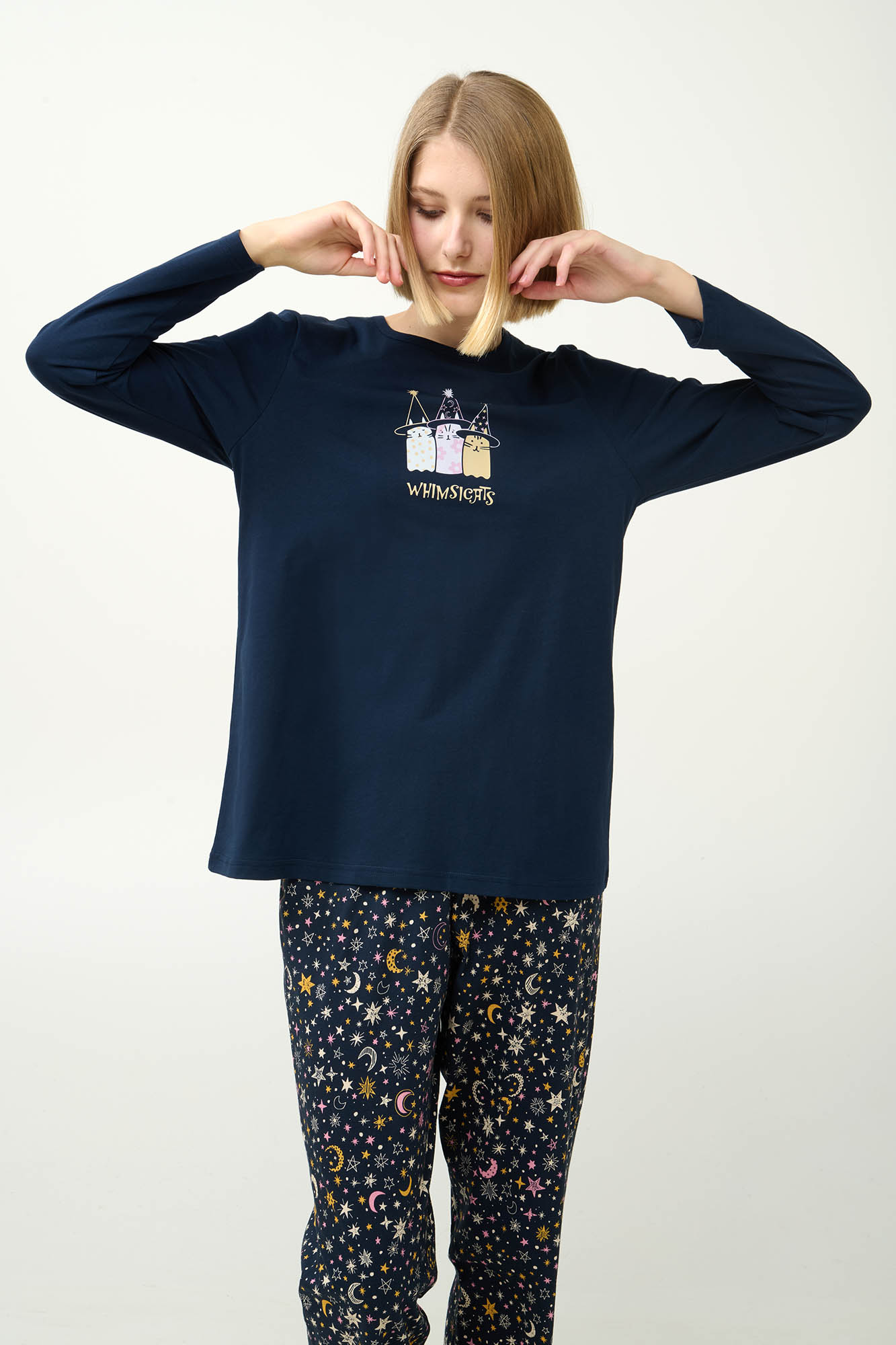 Επιλέξτε ένα σετ χειμερινές γυναικείες πυτζαμες, κατασκευασμένο από 100% διαπνέον και απαλό βαμβάκι s. jersey. Το σετ περιλαμβάνει μπλούζα με κλασική στρογγυλή λαιμόκοψη και παιχνιδιάρικο τύπωμα στο στήθος και παντελόνι είναι διακοσμημένο με ένα ονειρικό μοτίβο από αστέρια, φεγγάρια και κοσμικά σύμβολα. Ιδανικό για στιγμές χαλάρωσης ή το βραδινό σας ύπνο, με απόλυτη άνεση.